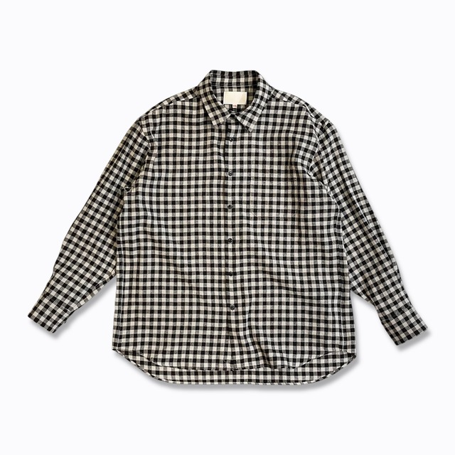 YOKO SAKAMOTO 【ヨーコサカモト】LINEN × COTTON × SILK REGULLAR COLLAR SHIRT 尾州地方の機屋にて製織したオリジナルの素材。 経糸にリネン、緯糸にコットンシルク糸を使用した自然で上品なネップ感が特徴の生地。 仕上げにワッシャー加工を施し、さらにナチュラルかつ品のある風合いに仕上げています。 サージ組織で構成されたギンガムチェック柄のレギュラーカラー、胸ポケット付きのシンプルなルックスに、リラックスしたシルエットでありながら、品のあるパターンメイキングに拘り製作されています。 唯一無二のブランドオリジナル生地の独特の雰囲気に加え、薄すぎず厚すぎない生地感は、春先から冬場まで長いシーズン活躍するアイテムになっています。 *ライティング環境により肉眼と写真の色味に誤差が若干ございます。ご了承下さい。 *着用サイズ S モデル身長158cm 素材:LINEN 56% COTTON 31% SILK 13% カラー:GINGHAM サイズ: S(ユニセックス)肩幅54 身幅63 着丈 F72 B77 袖丈58cm M(ユニセックス) 肩幅56 身幅65 着丈 F74 B79 袖丈60cm L(ユニセックス) 肩幅58 身幅67 着丈 F76 B81 袖丈62cm 生産:日本 品番:YS-26SS-55