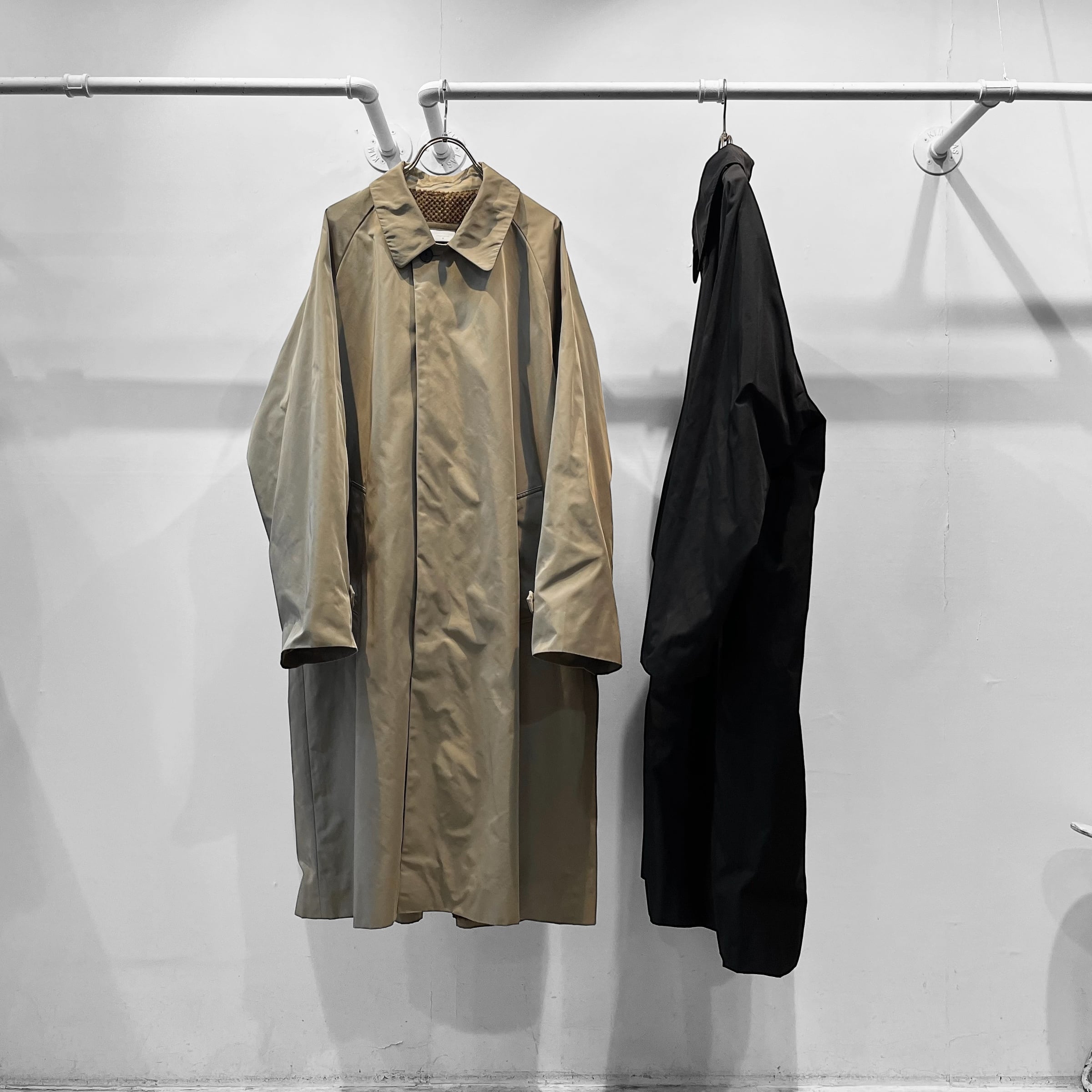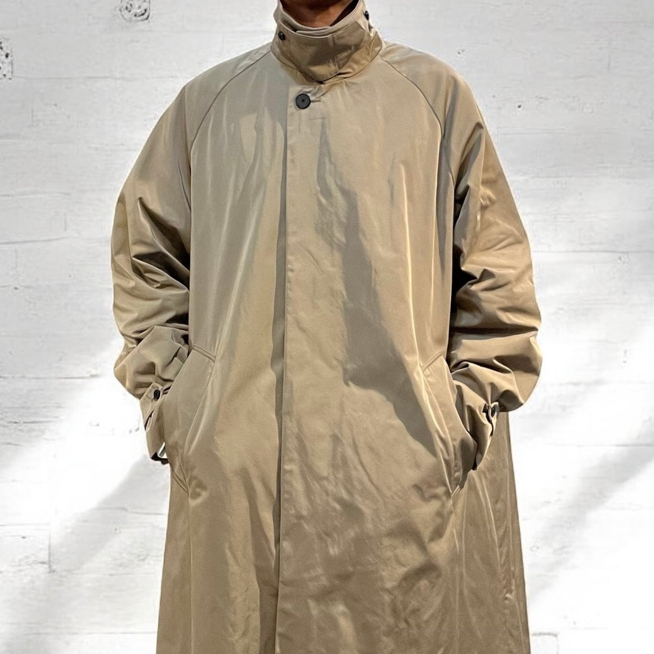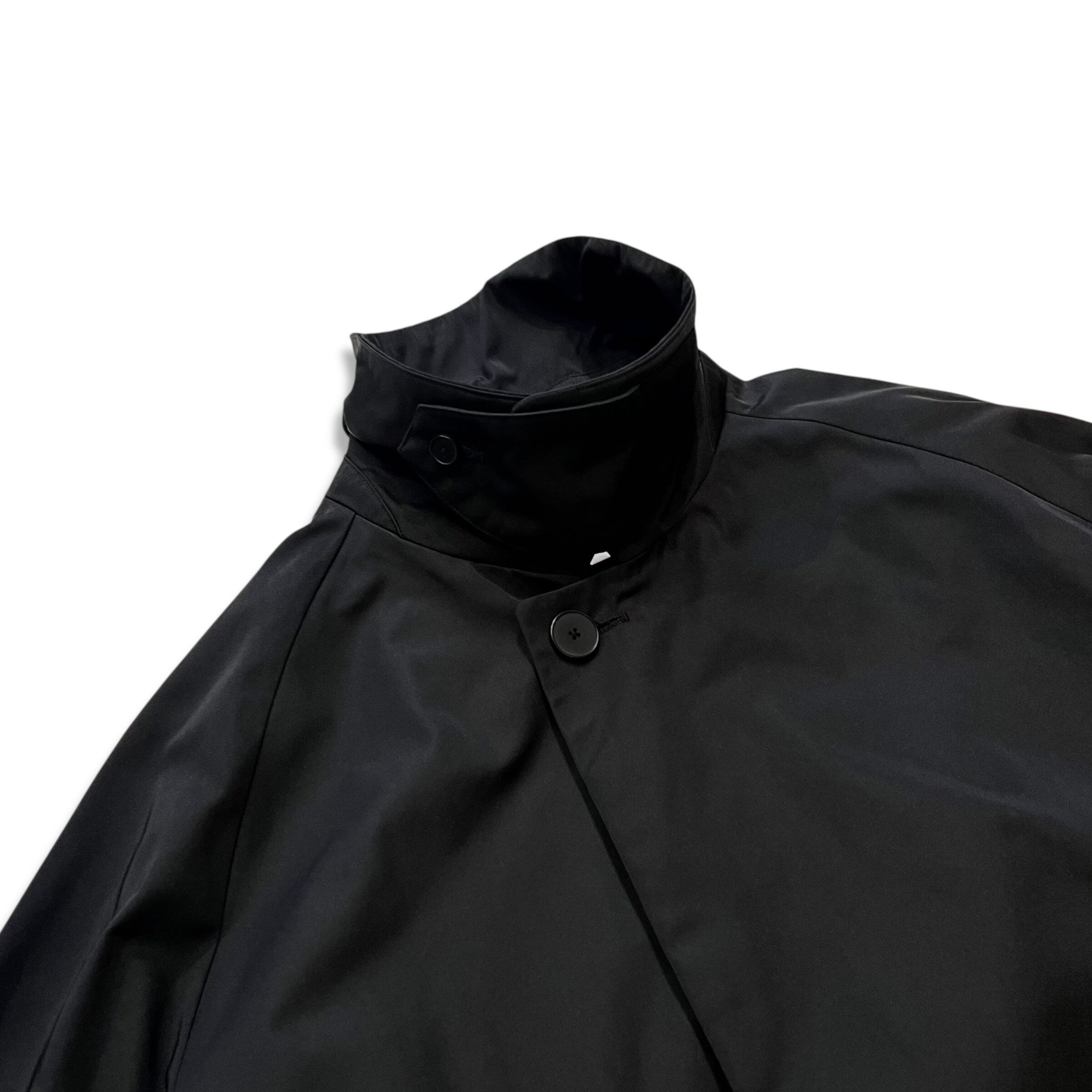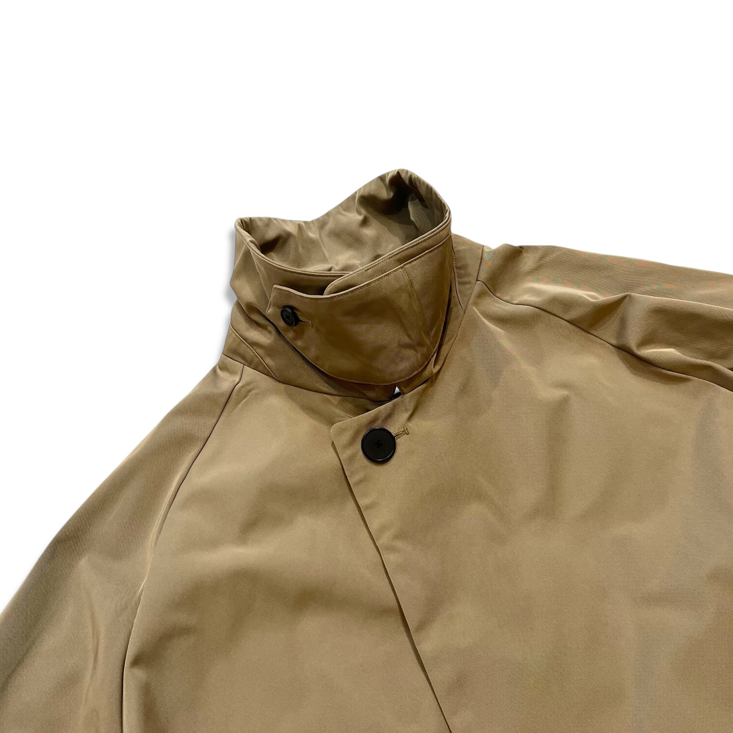形状記憶機能を持ったポリエステルを強撚したギャバジン生地のステンカラーコート。