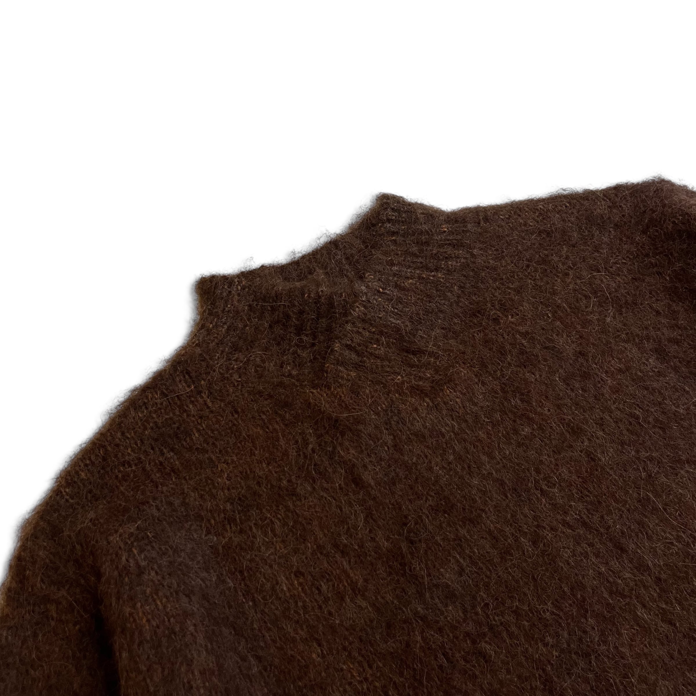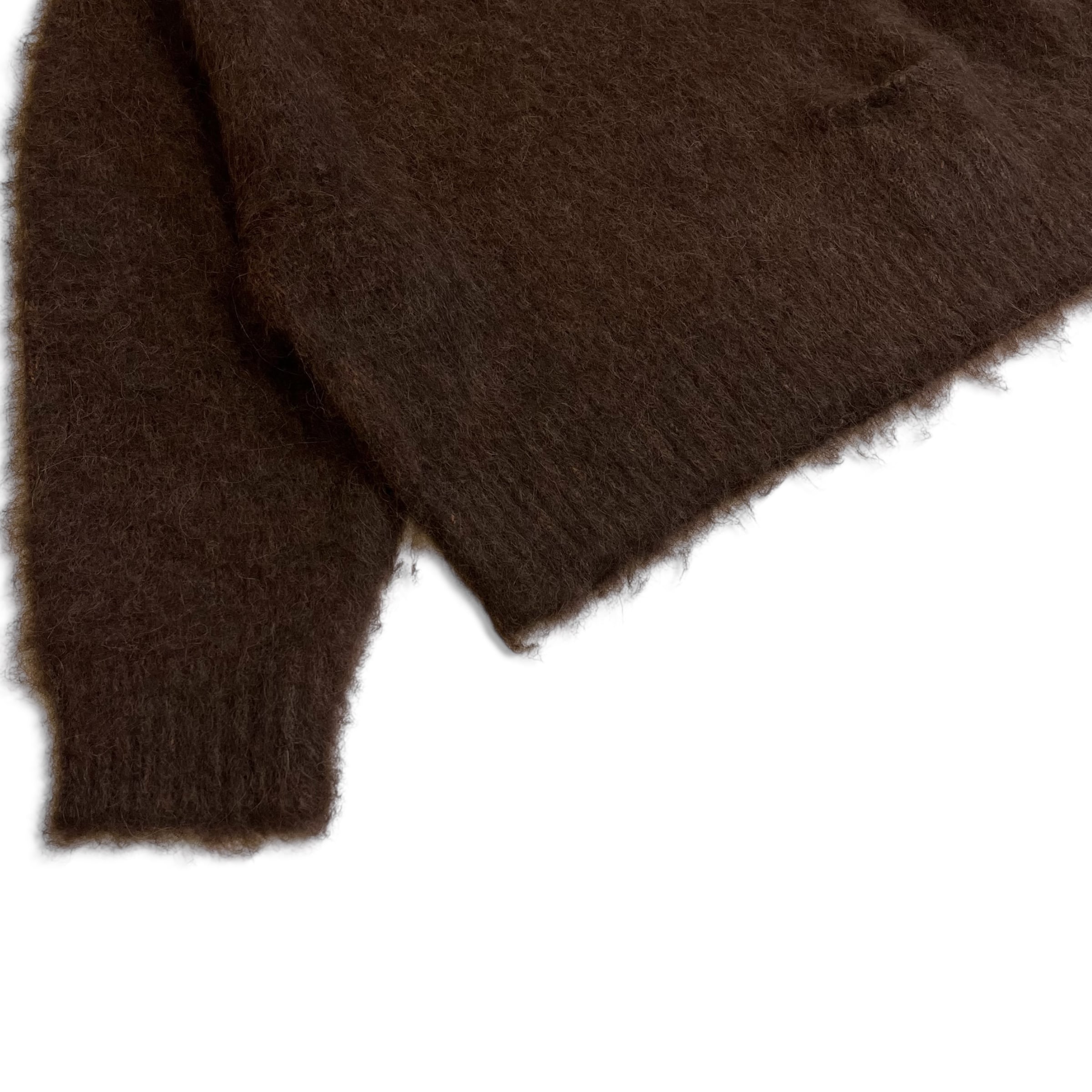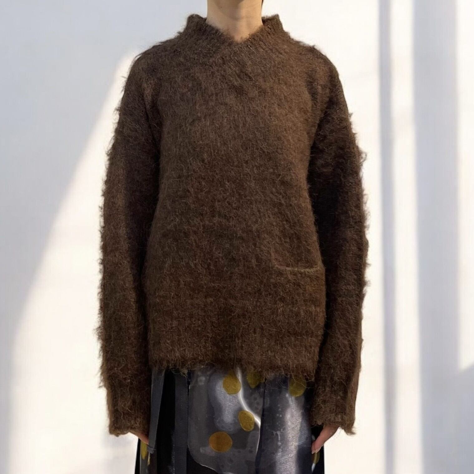 2種類の異なった色と表情の毛糸を一緒に編見込み、成形後に起毛加工を施し深みのある表情を目指したウールアルパカ混のセーター。