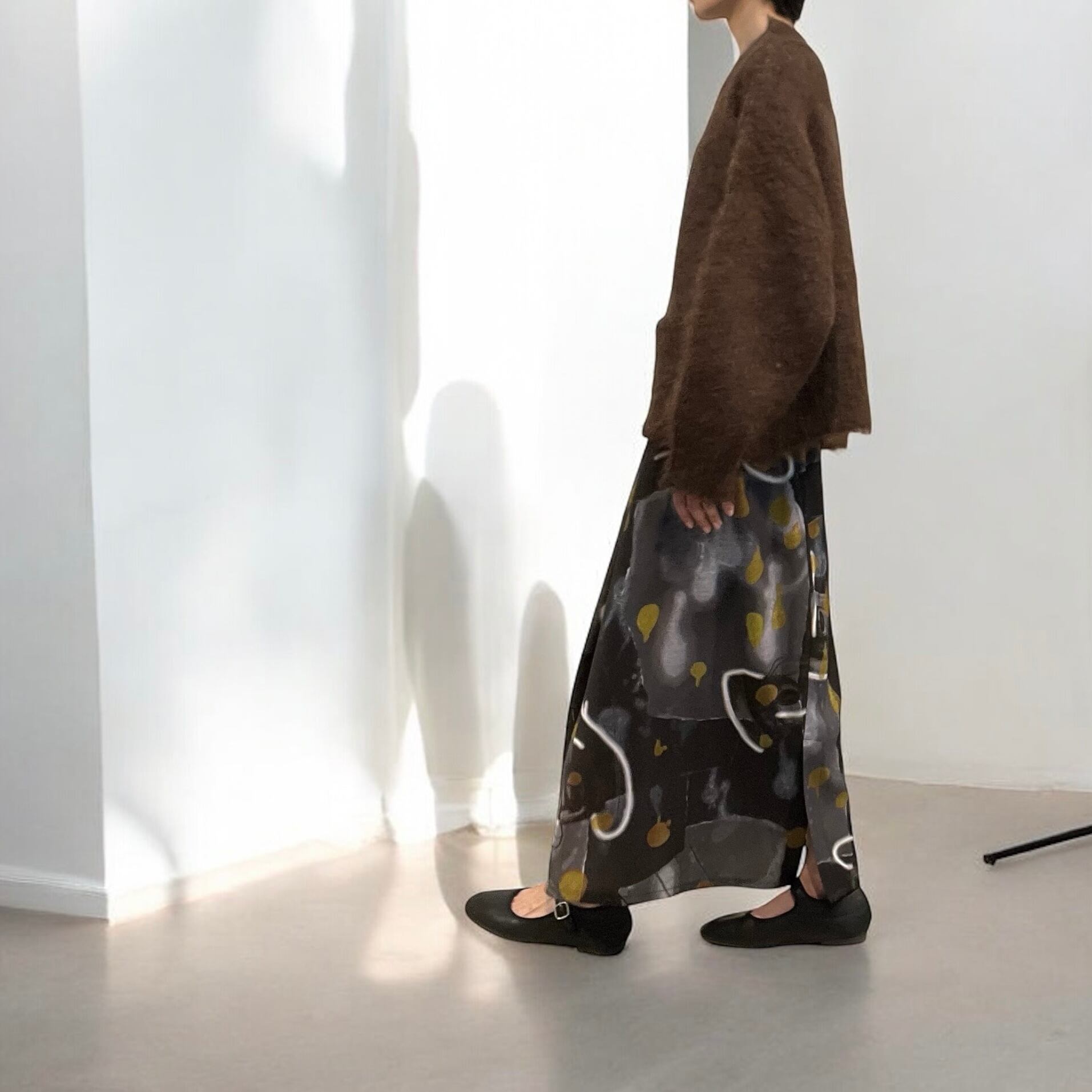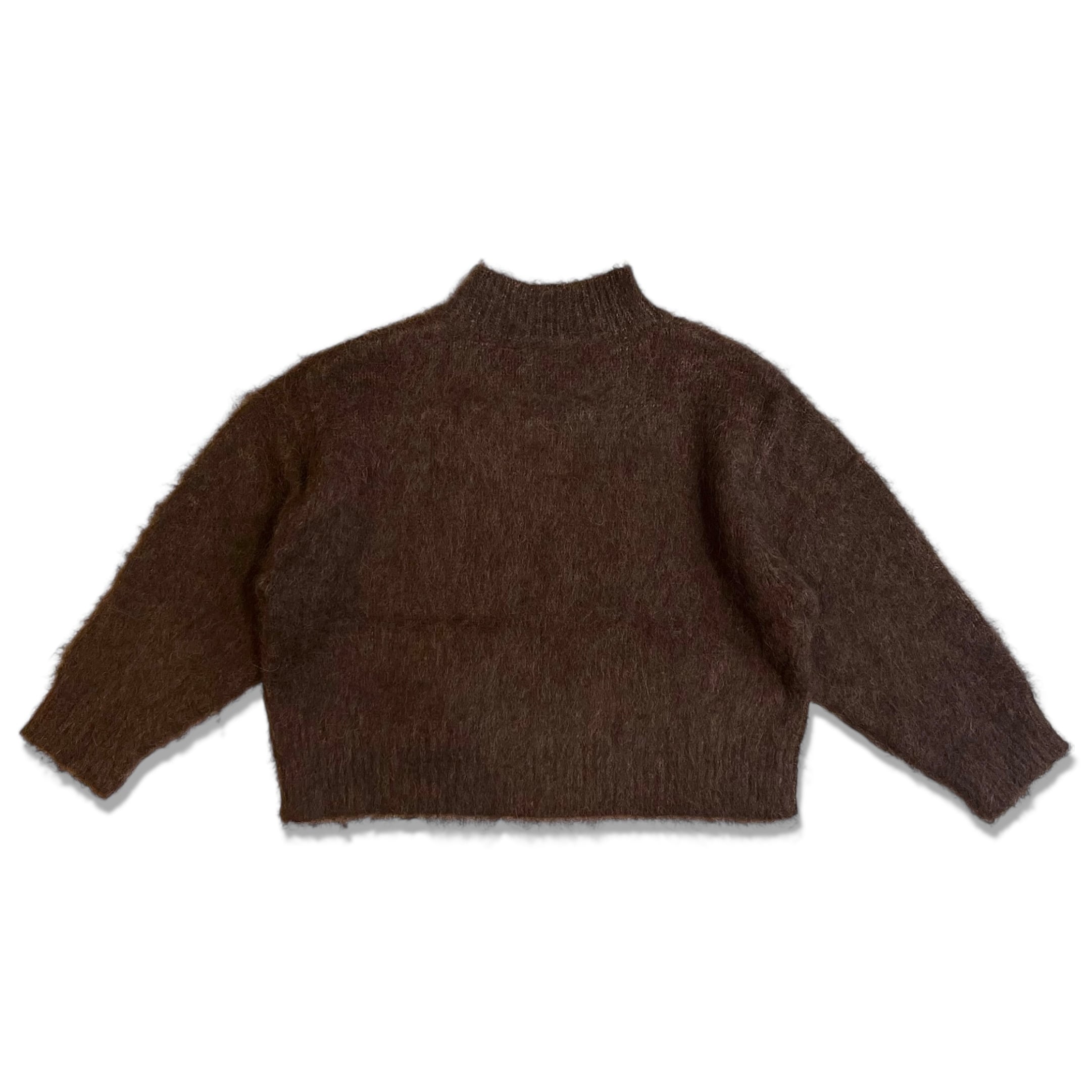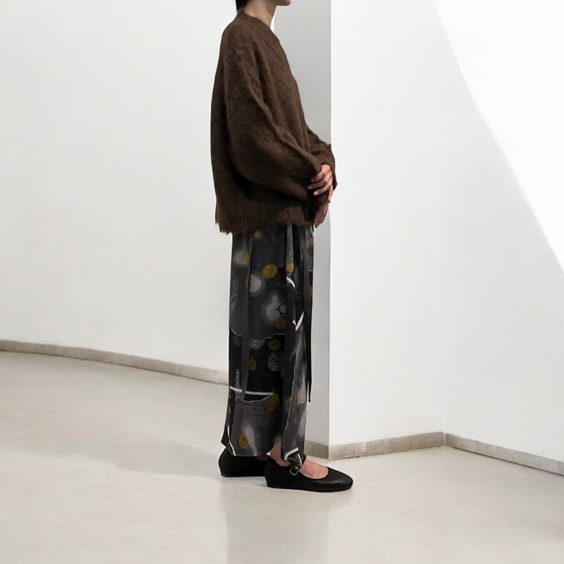 2種類の異なった色と表情の毛糸を一緒に編見込み、成形後に起毛加工を施し深みのある表情を目指したウールアルパカ混のセーター。