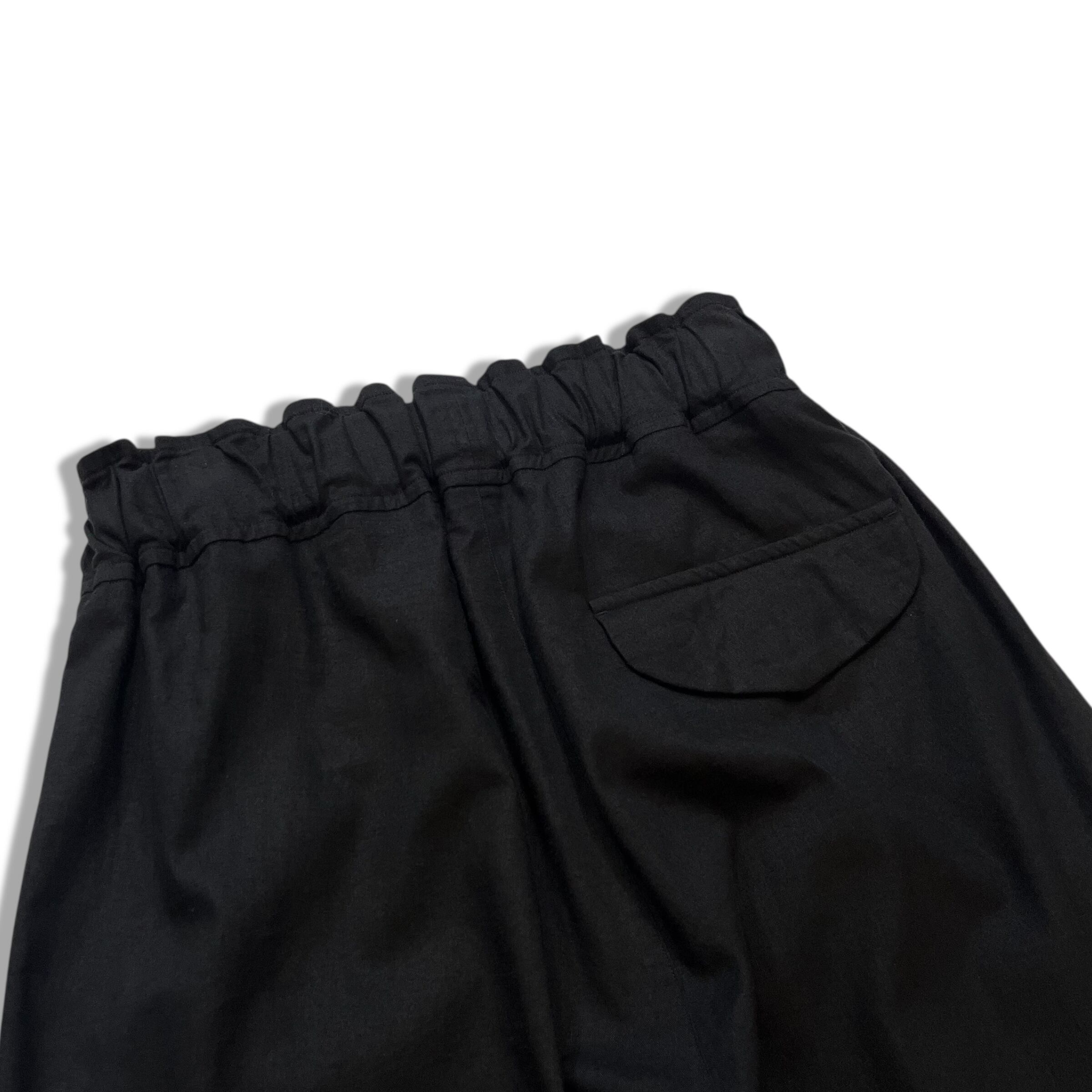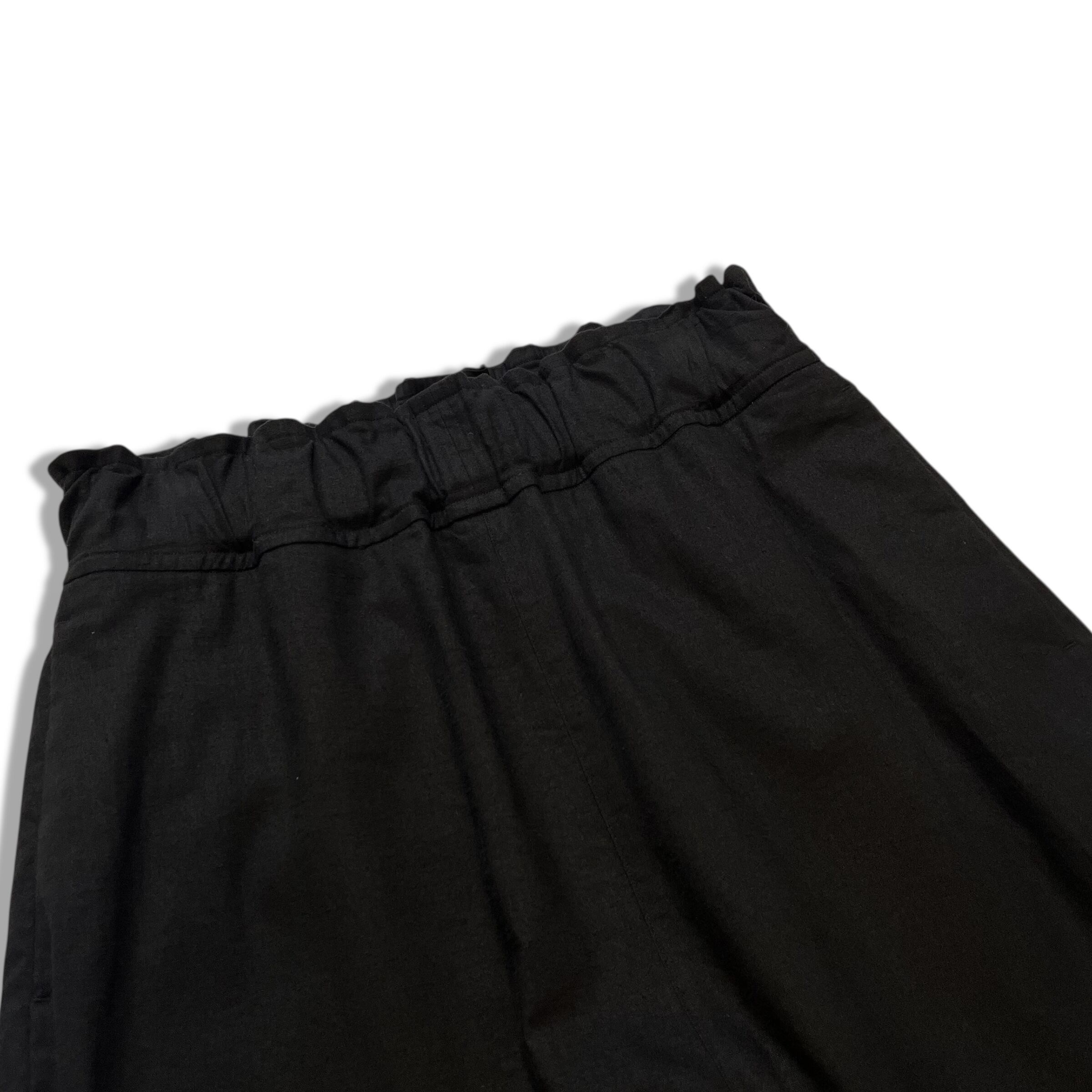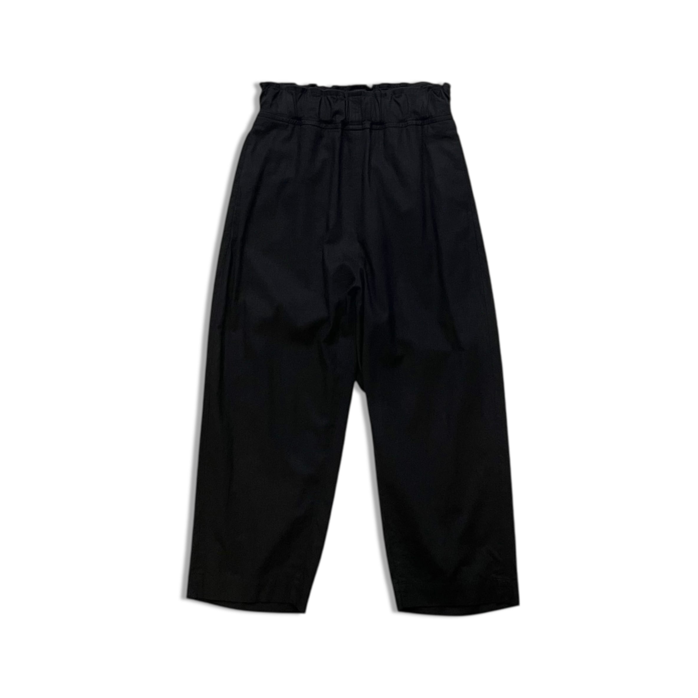 ウエストゴムと紐のイージー仕様、ワイドなストレートシルエット。