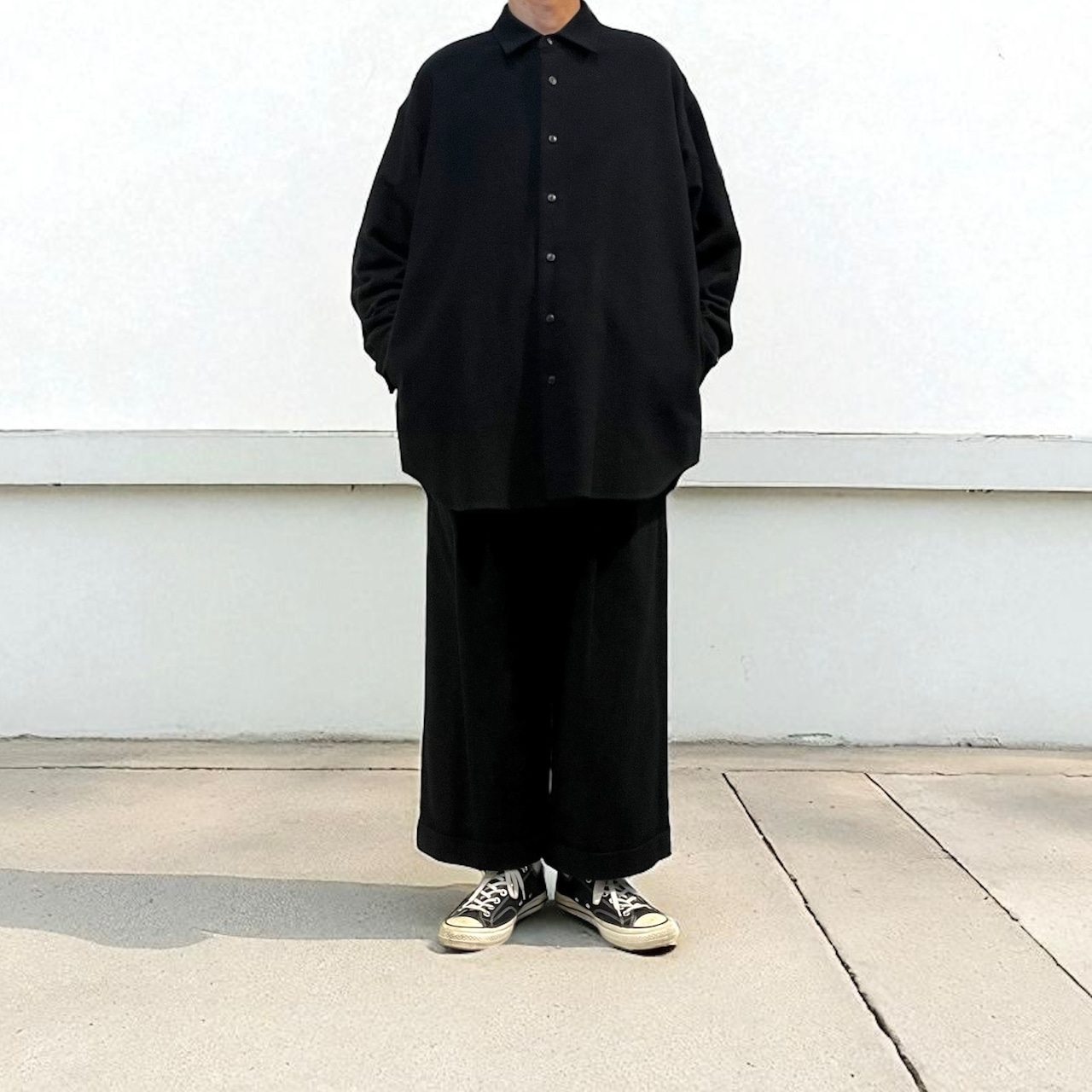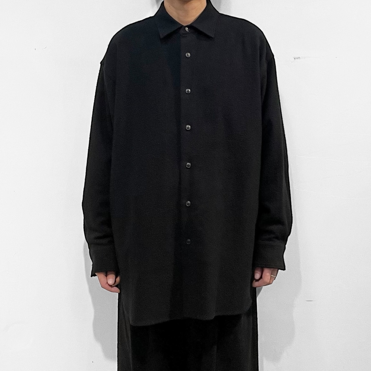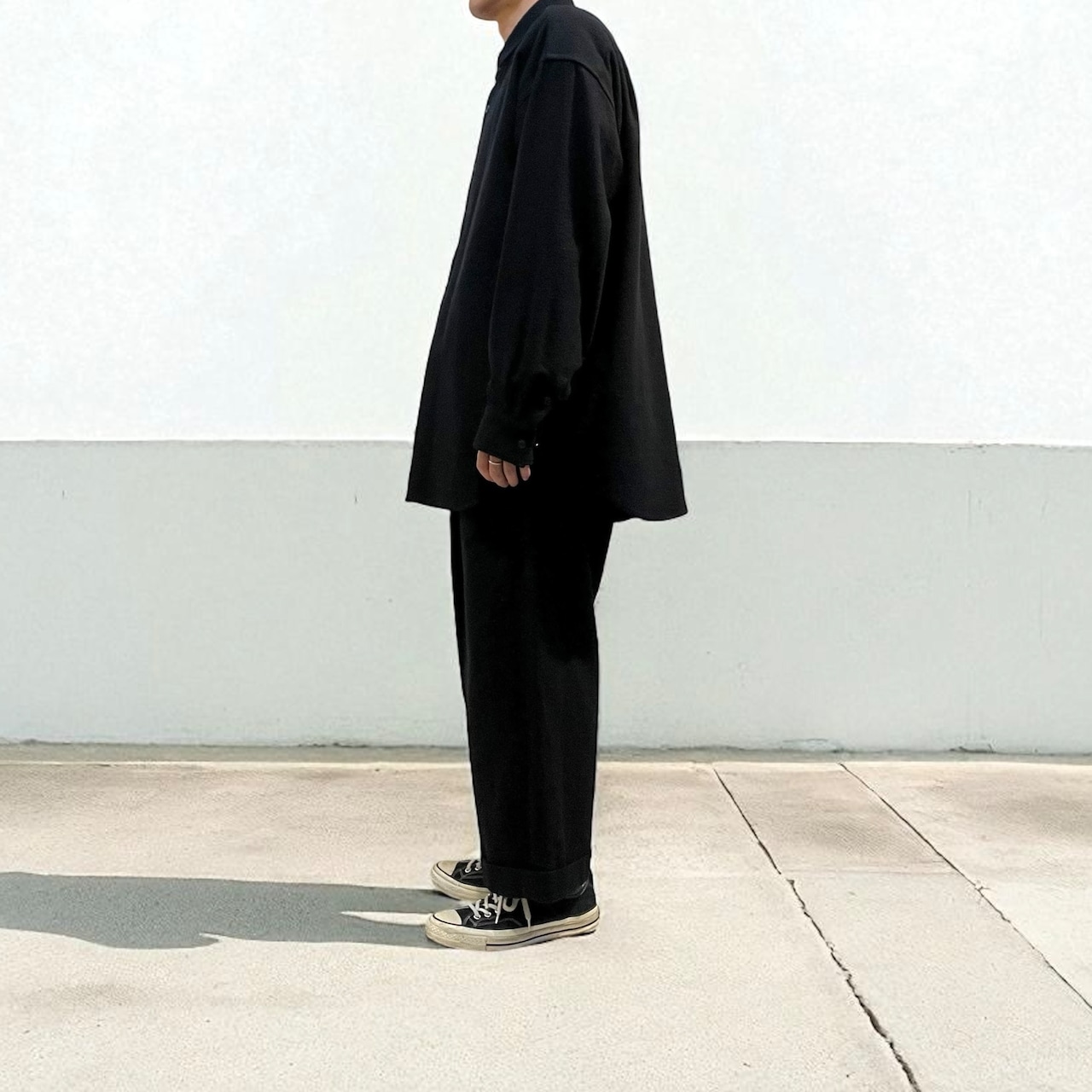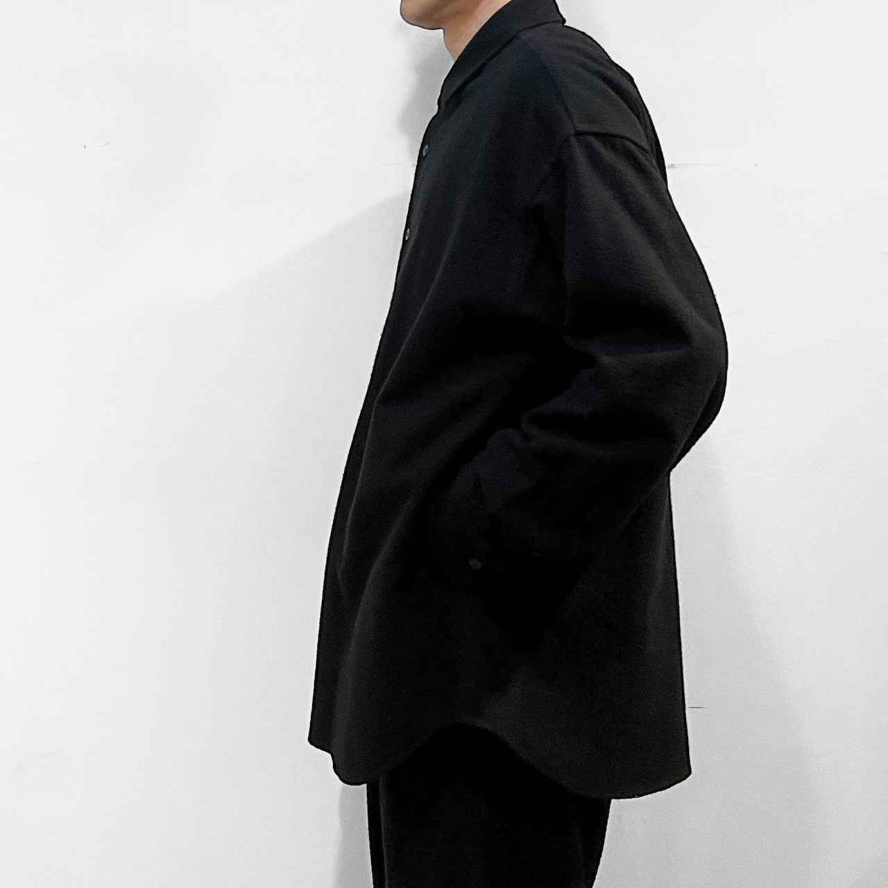 大きくドロップしたショルダーライン、ゆったりと広い身幅、力の抜けたルーズなサイズ感が特徴。
