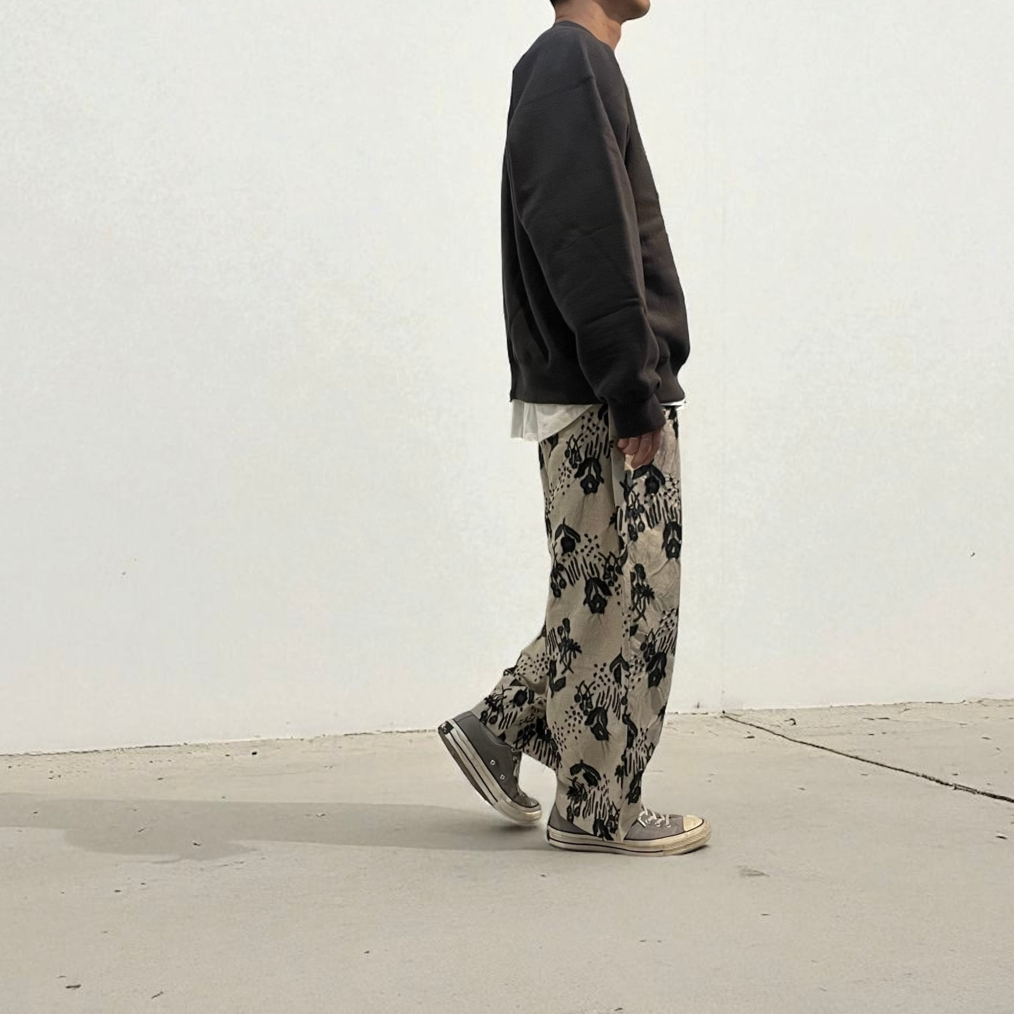 素材の表情も良く柄物ですが案外合わせやすく、シンプルな合わせでもコーディネートの変化を楽しめるパンツになっています。