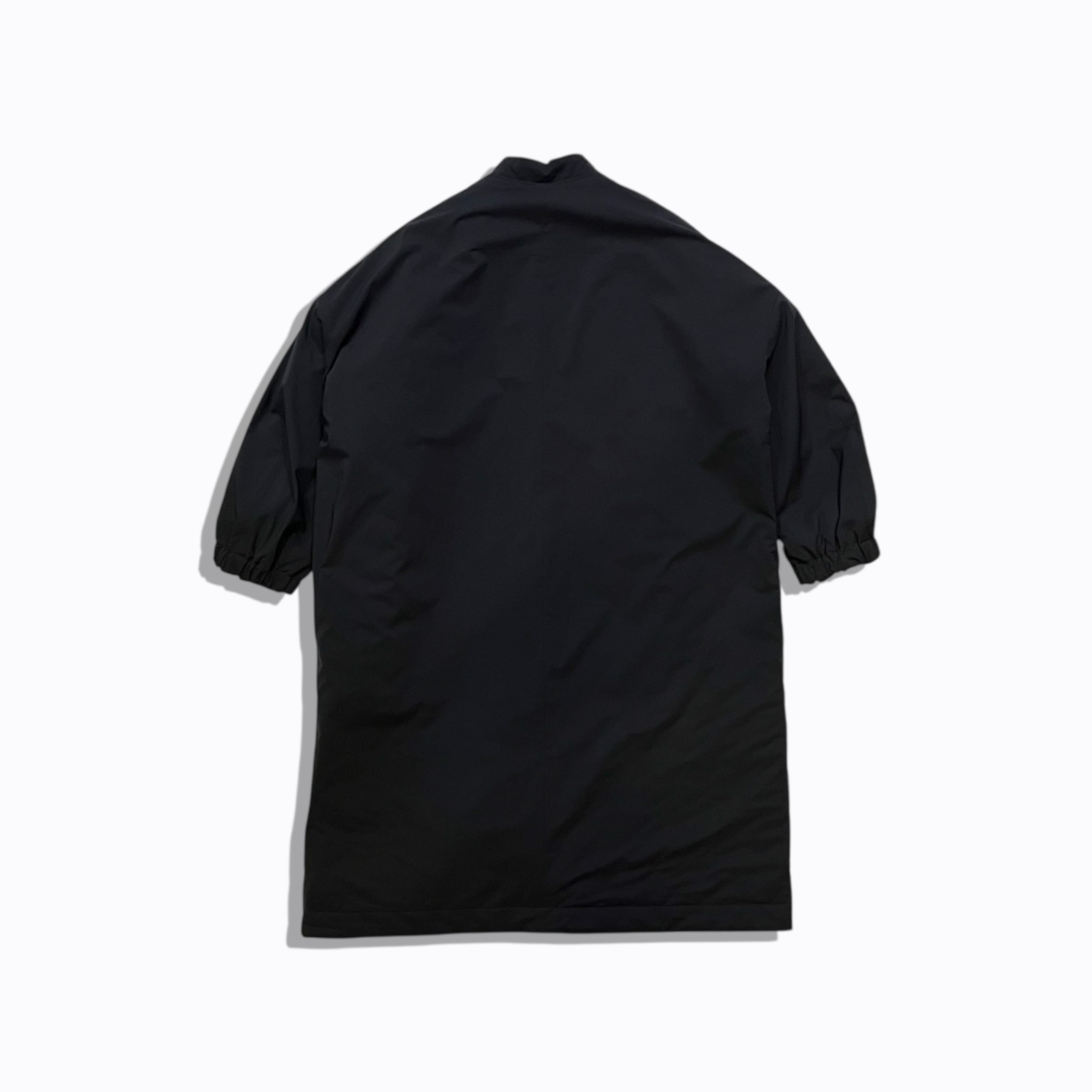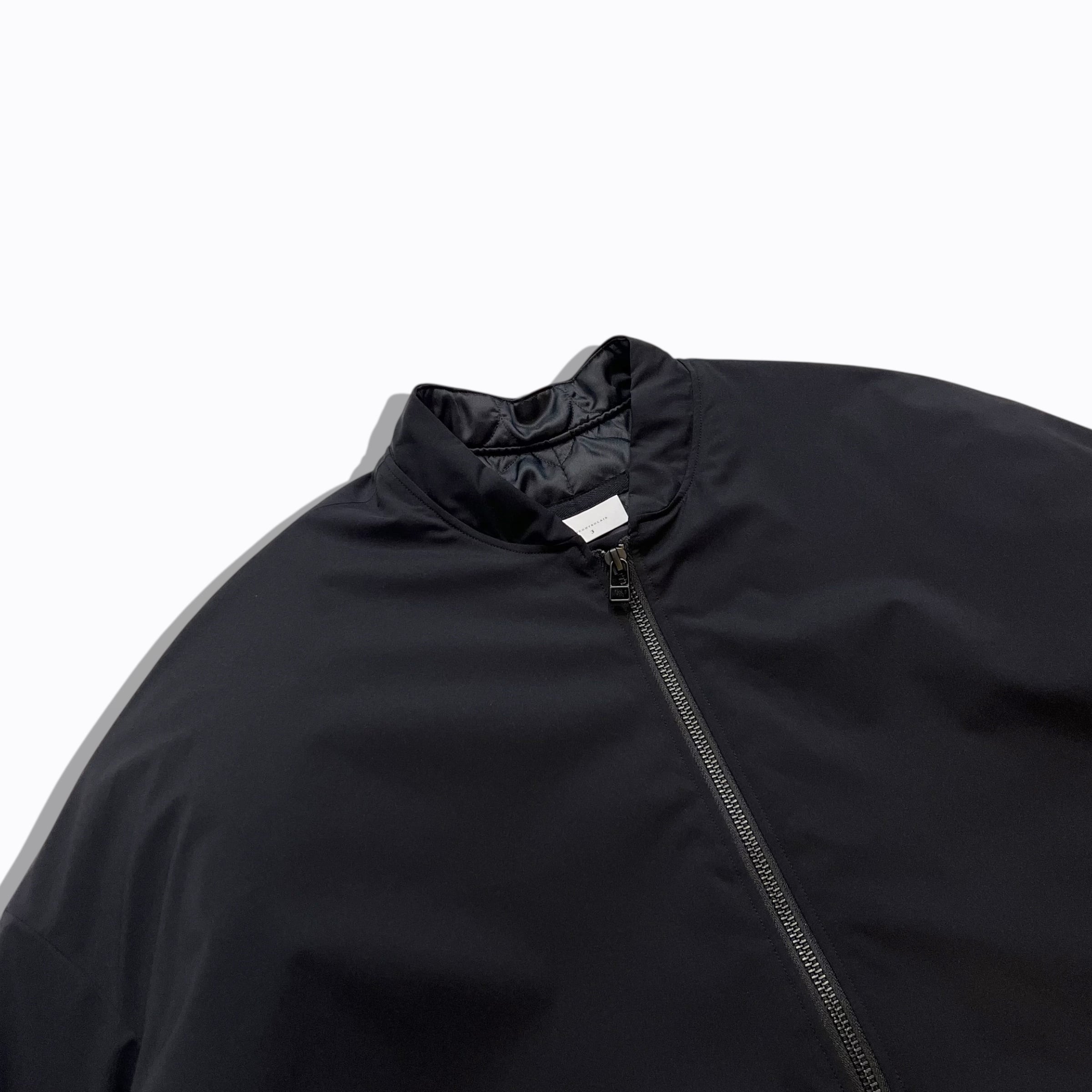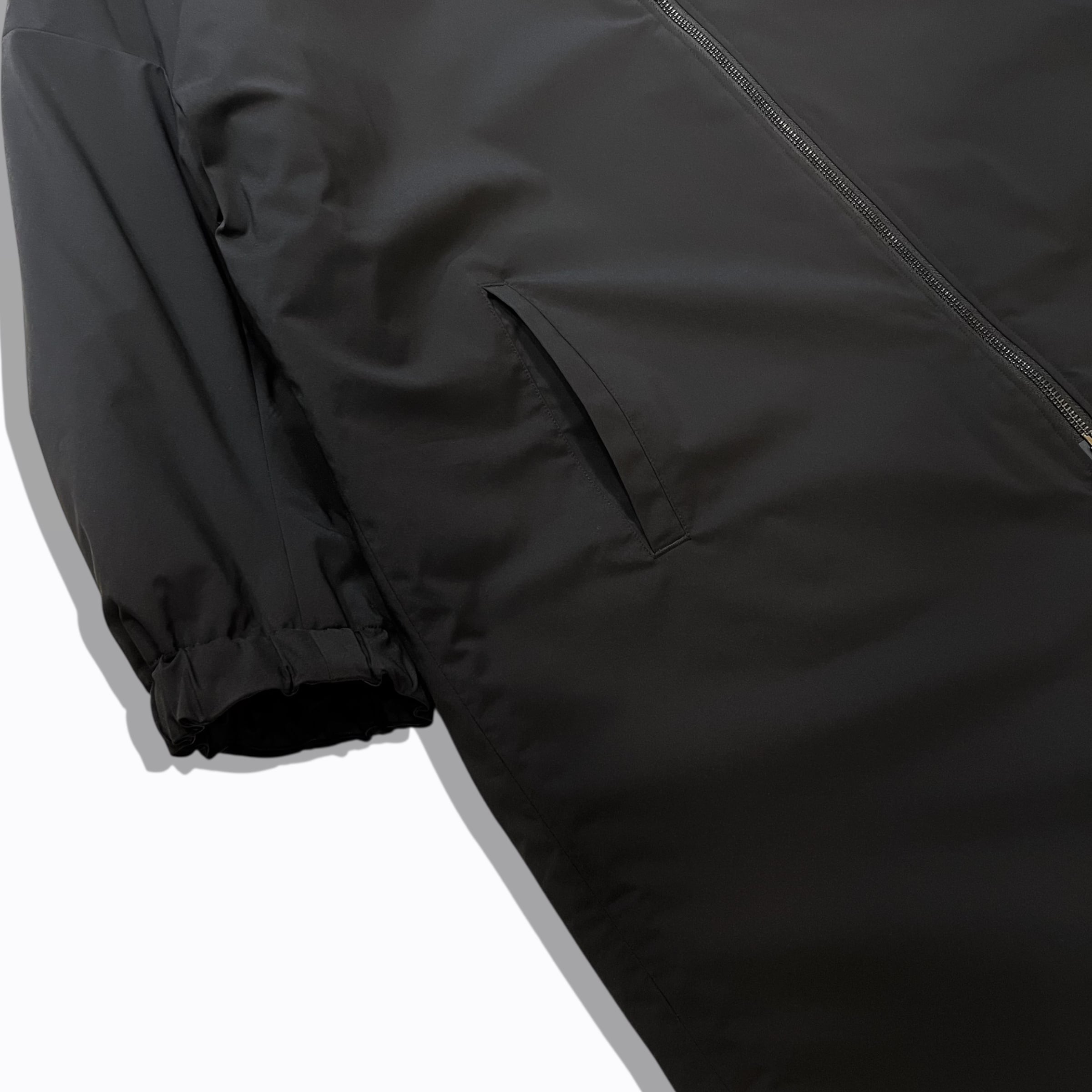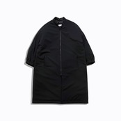 前中心ジップ、袖口ギャザー仕様、ドロップショルダーのオーバーサイズシルエット。