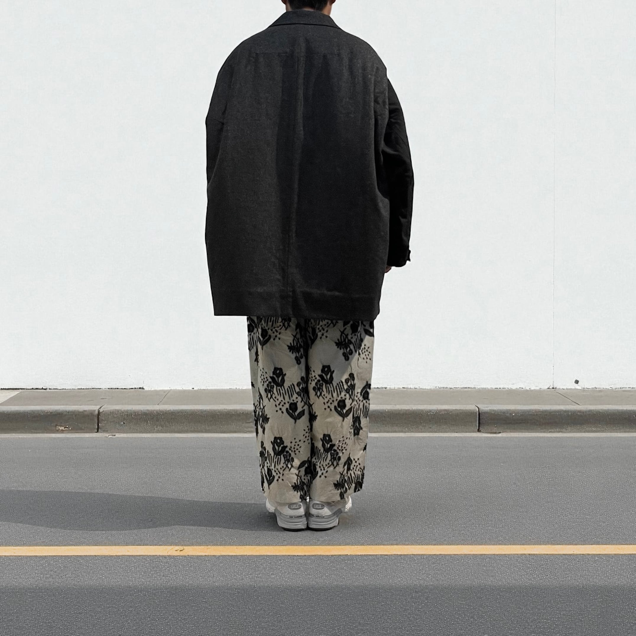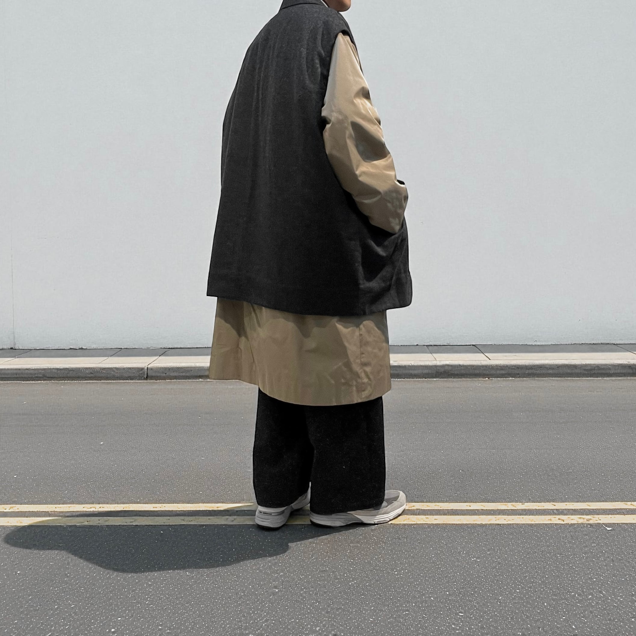 テーラードカラーにフラップポケット、オーバーサイズシルエットが特徴で、感覚的には、ベストというよりノースリーブのアウターです。