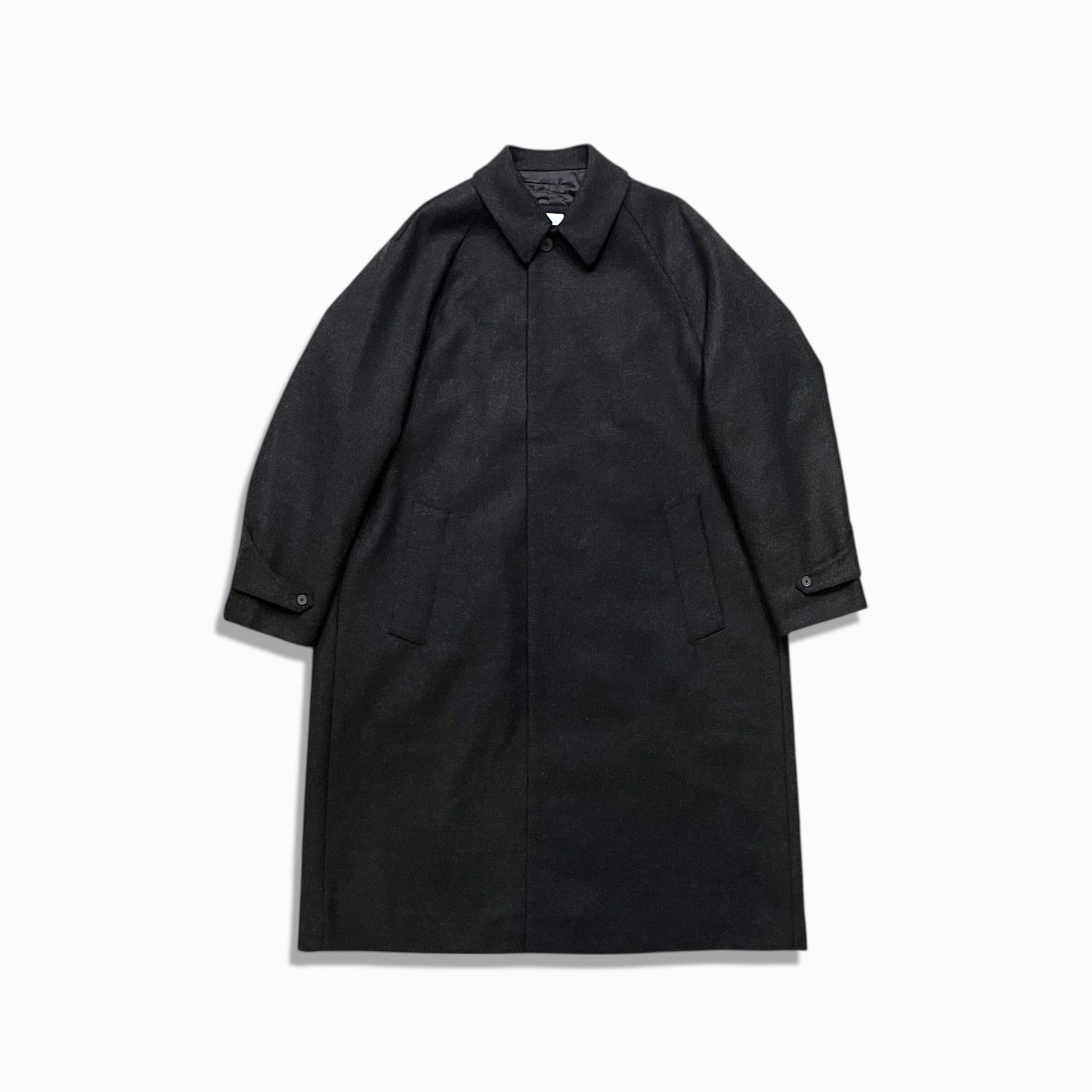 とてもメンズライクなスタンダード高密フラノ生地のユニセックスなステンカラーコート。