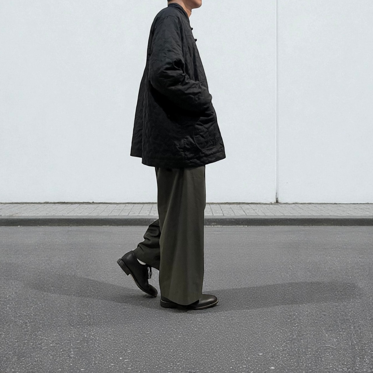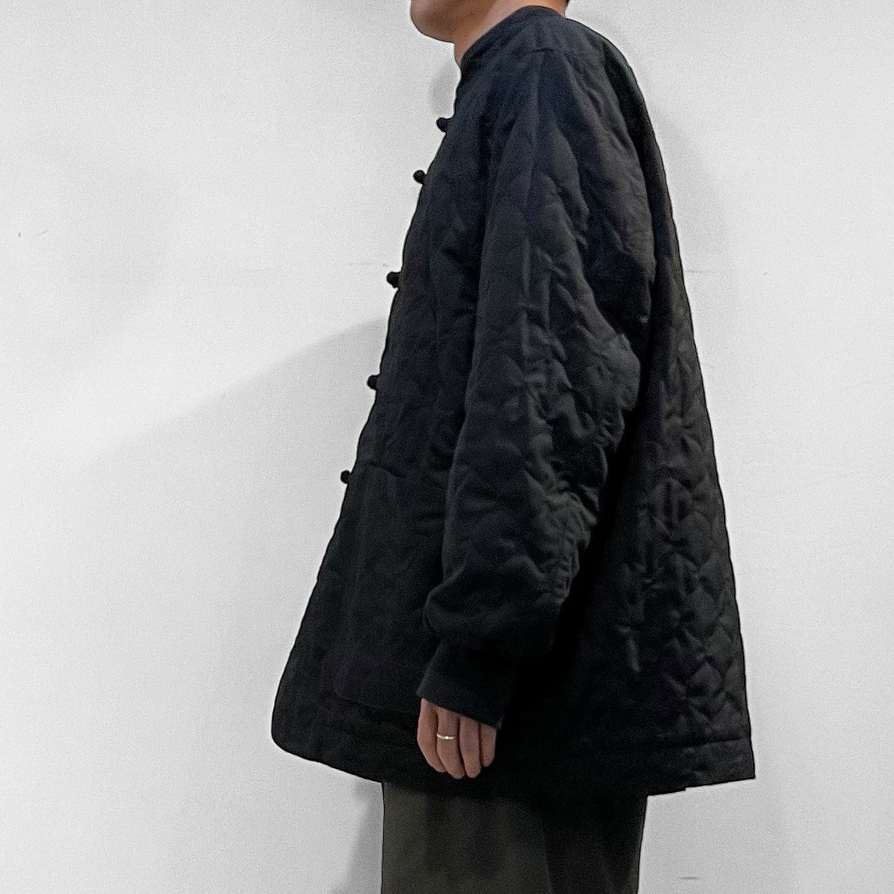 スタンドカラー、程よいジャストなサイズシルエットにチャイナボタン、袖口リブが特徴的。