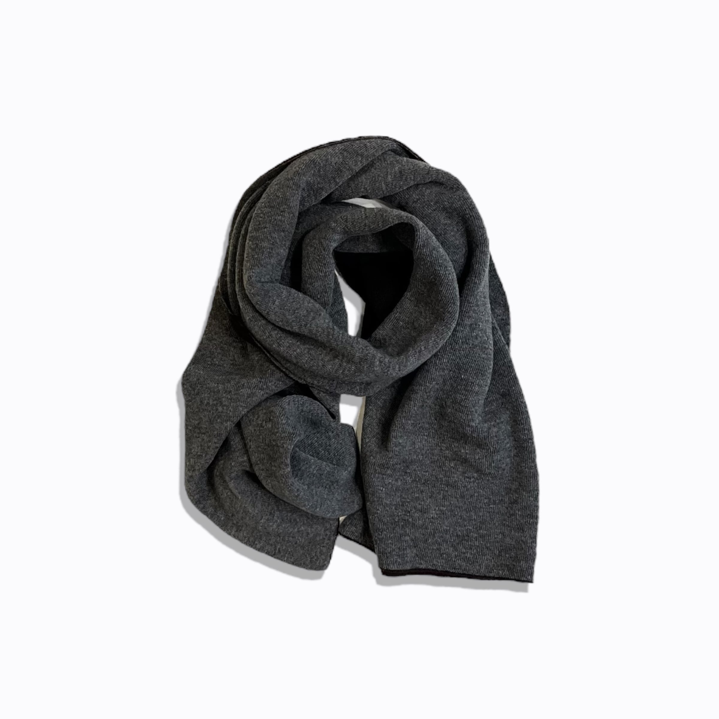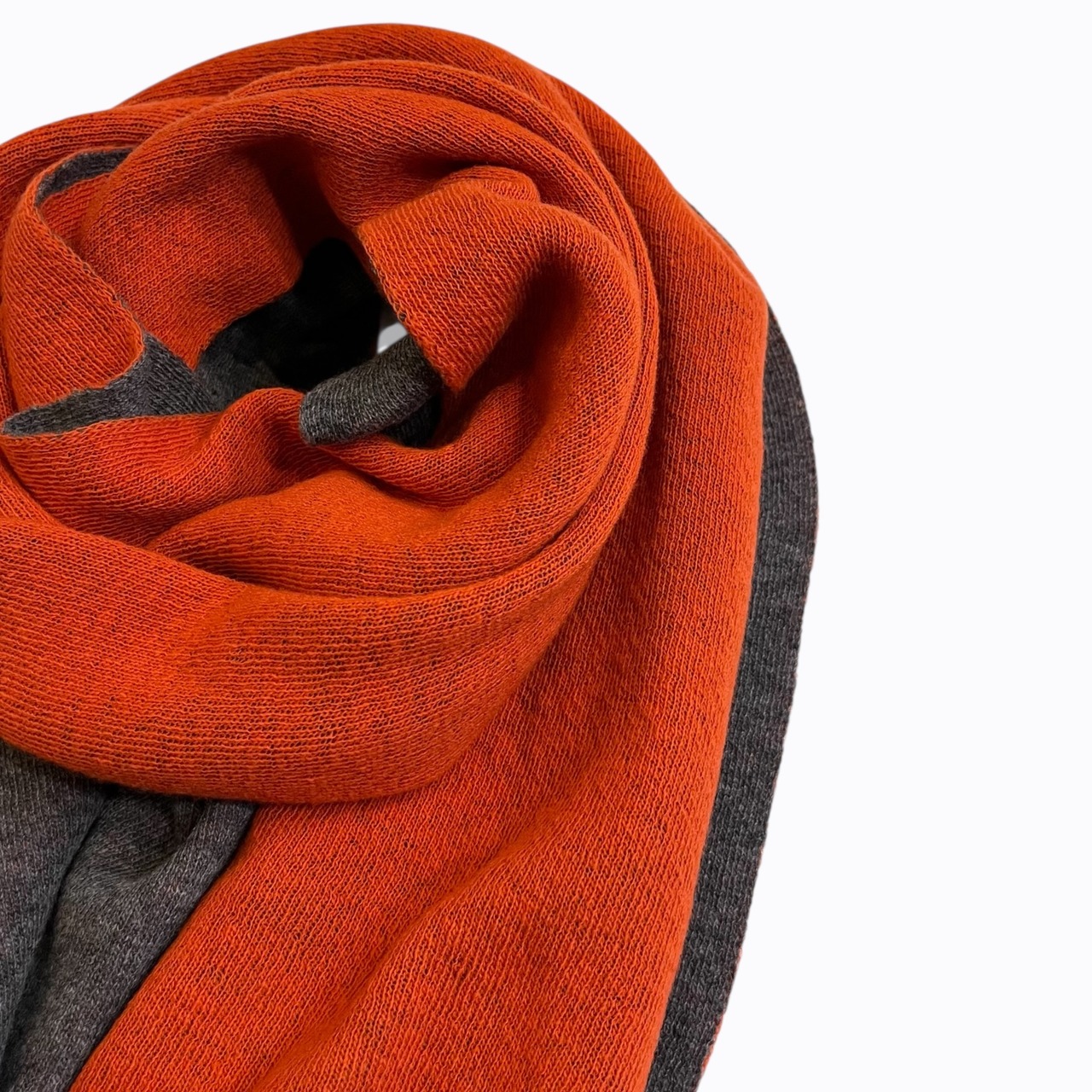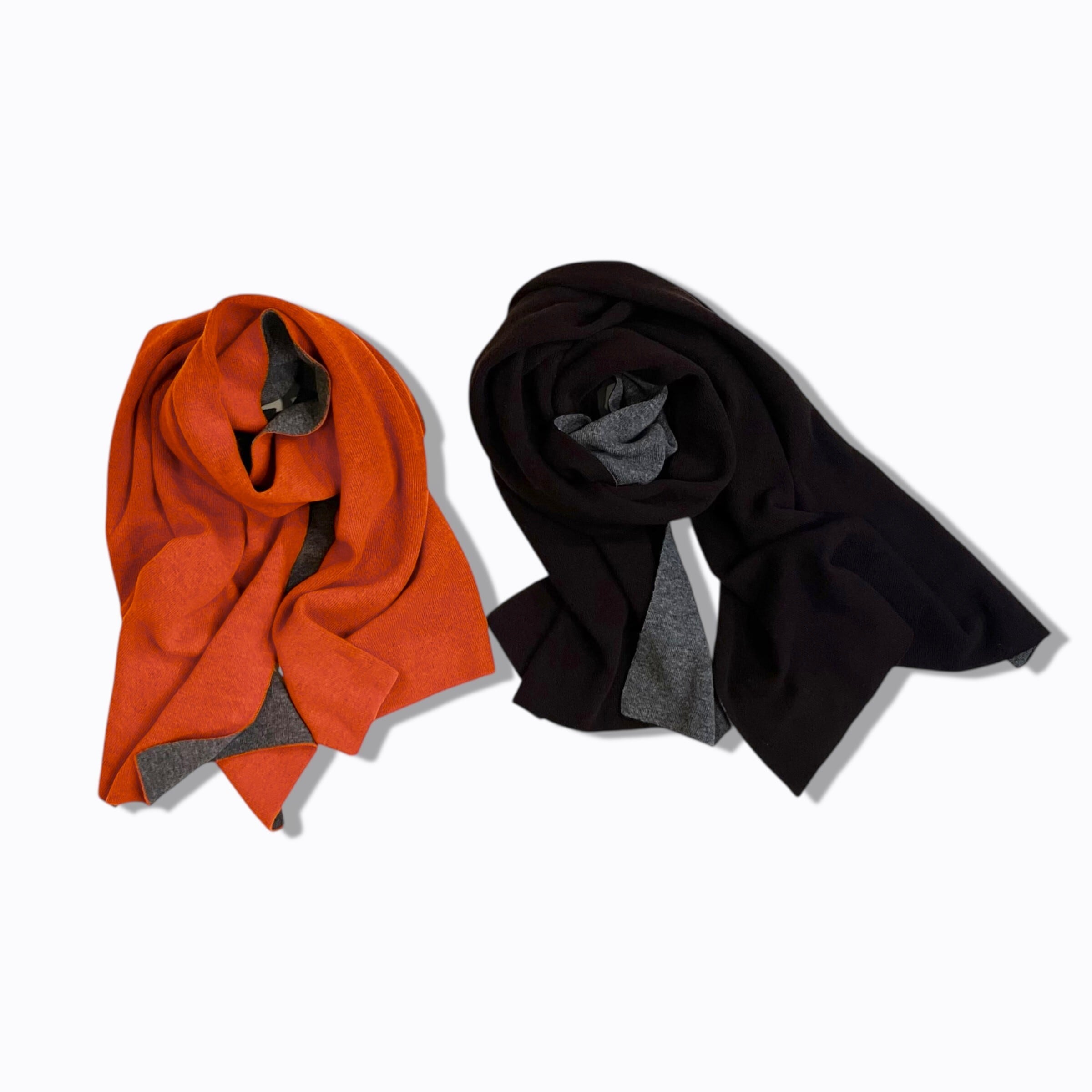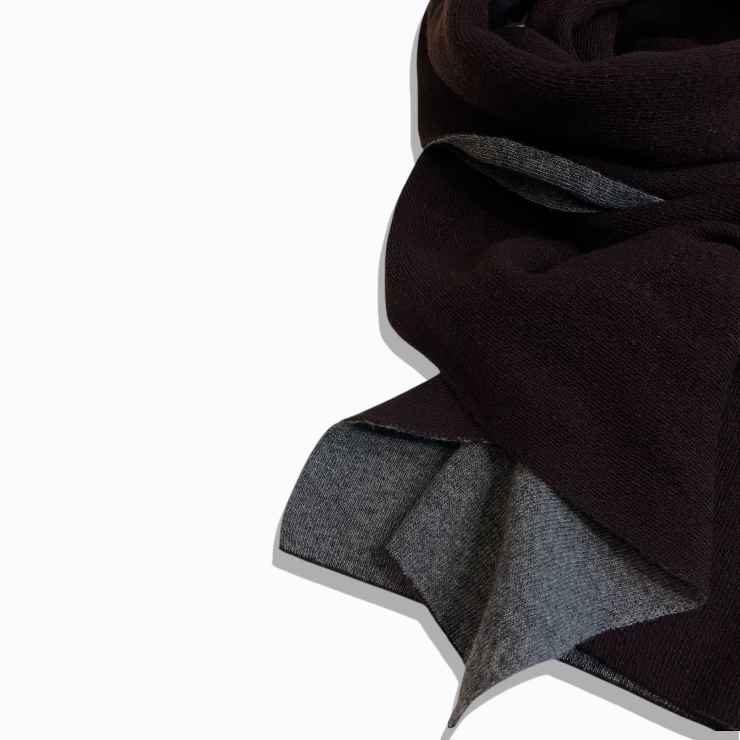 一般的なマフラーよりもやや幅広で肩に掛けても良し、マフラーの様に巻いてもボリュームがあり暖かさを確保してくれます。表裏のカラーが違うので使い方によって様々なアレンジが楽しめます。