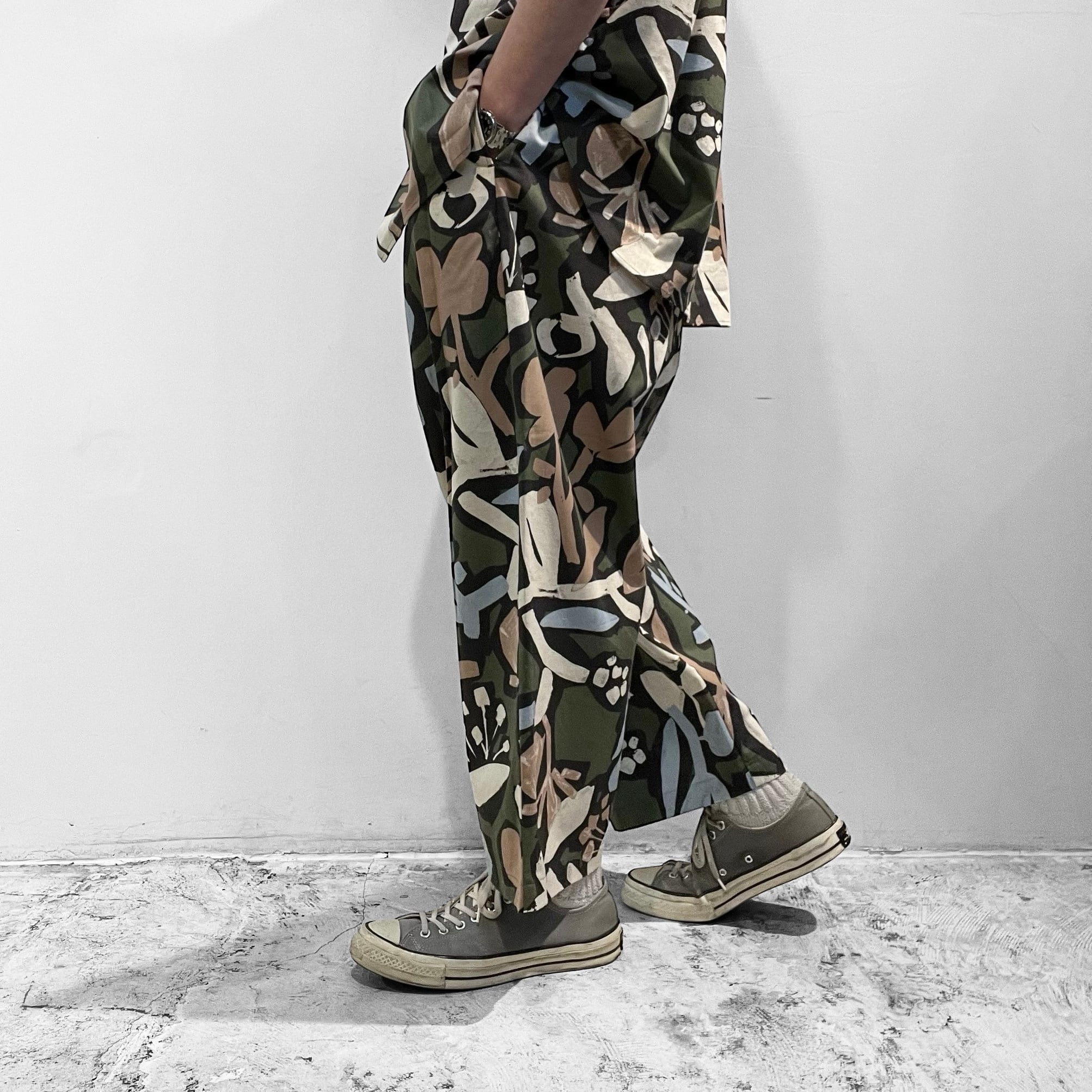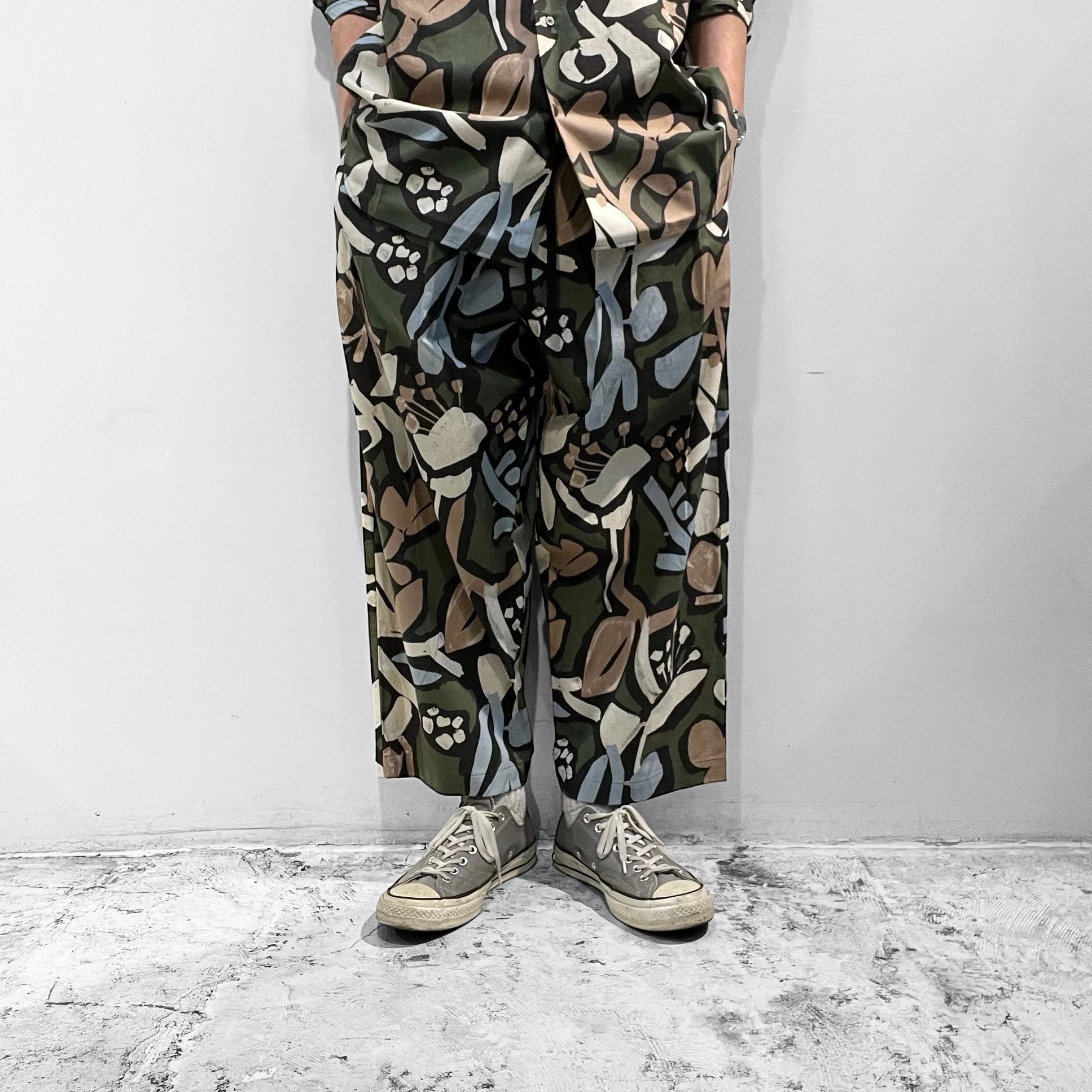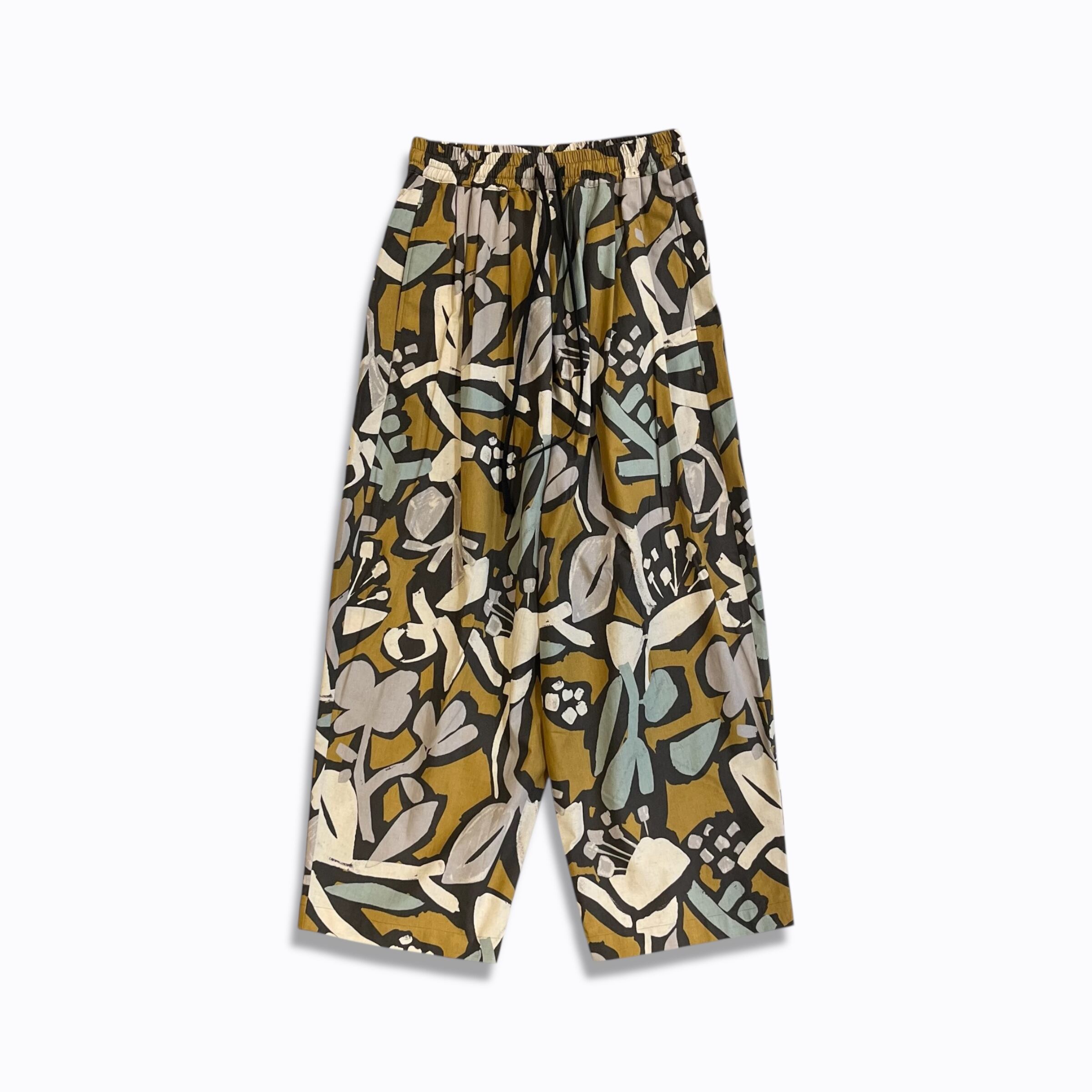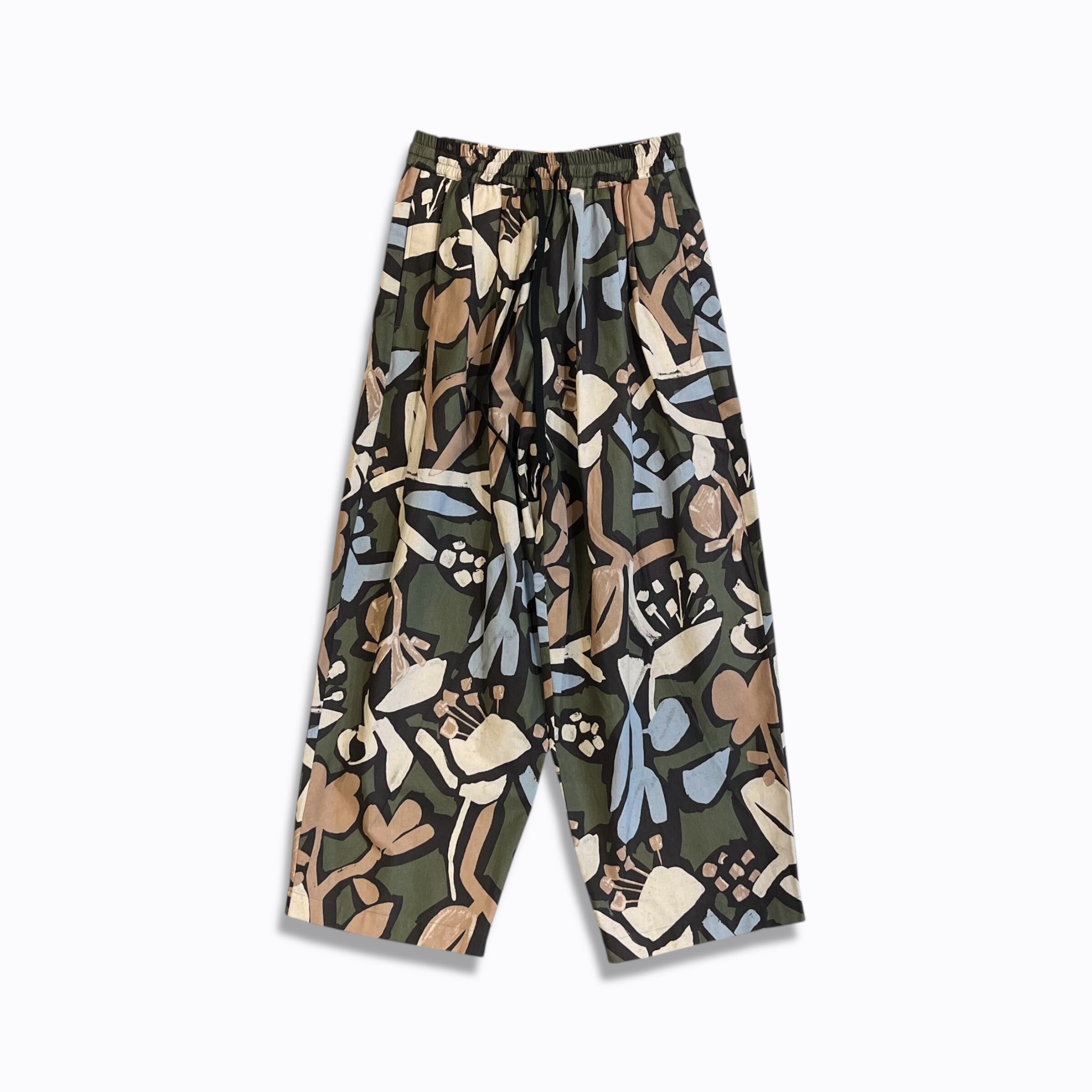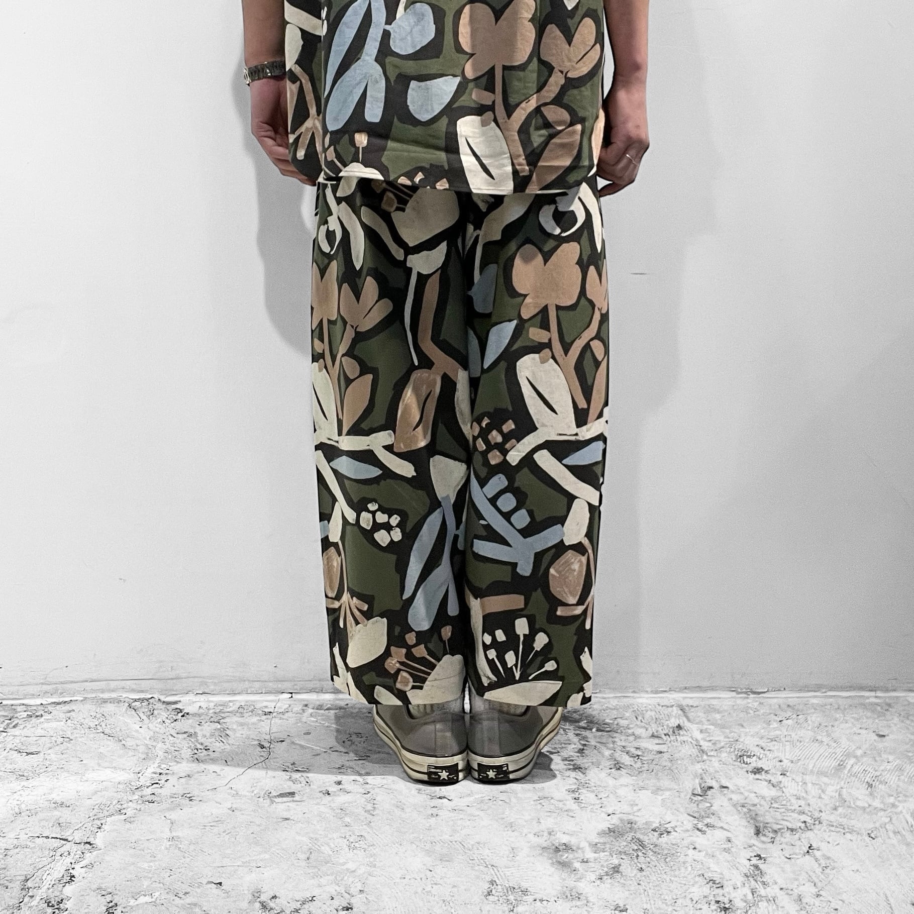 シーチング生地に顔料でフラワープリントを施した生地を使用したユニセックスなワイドイージーパンツ。