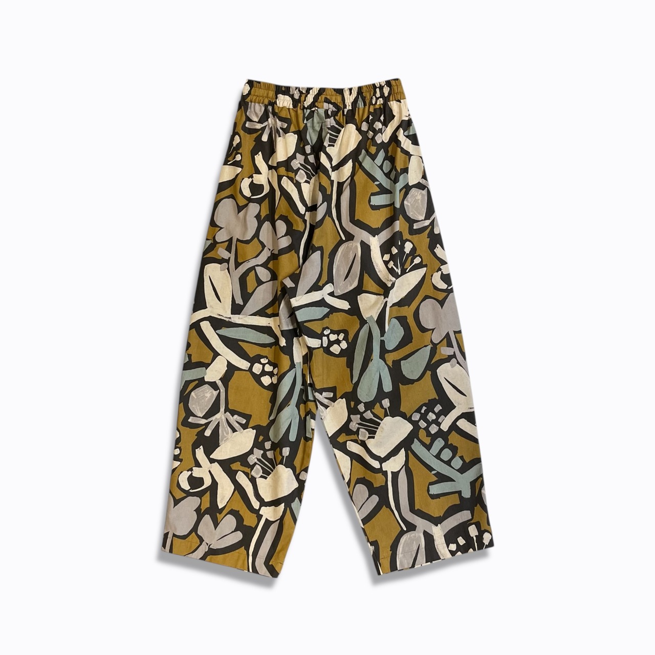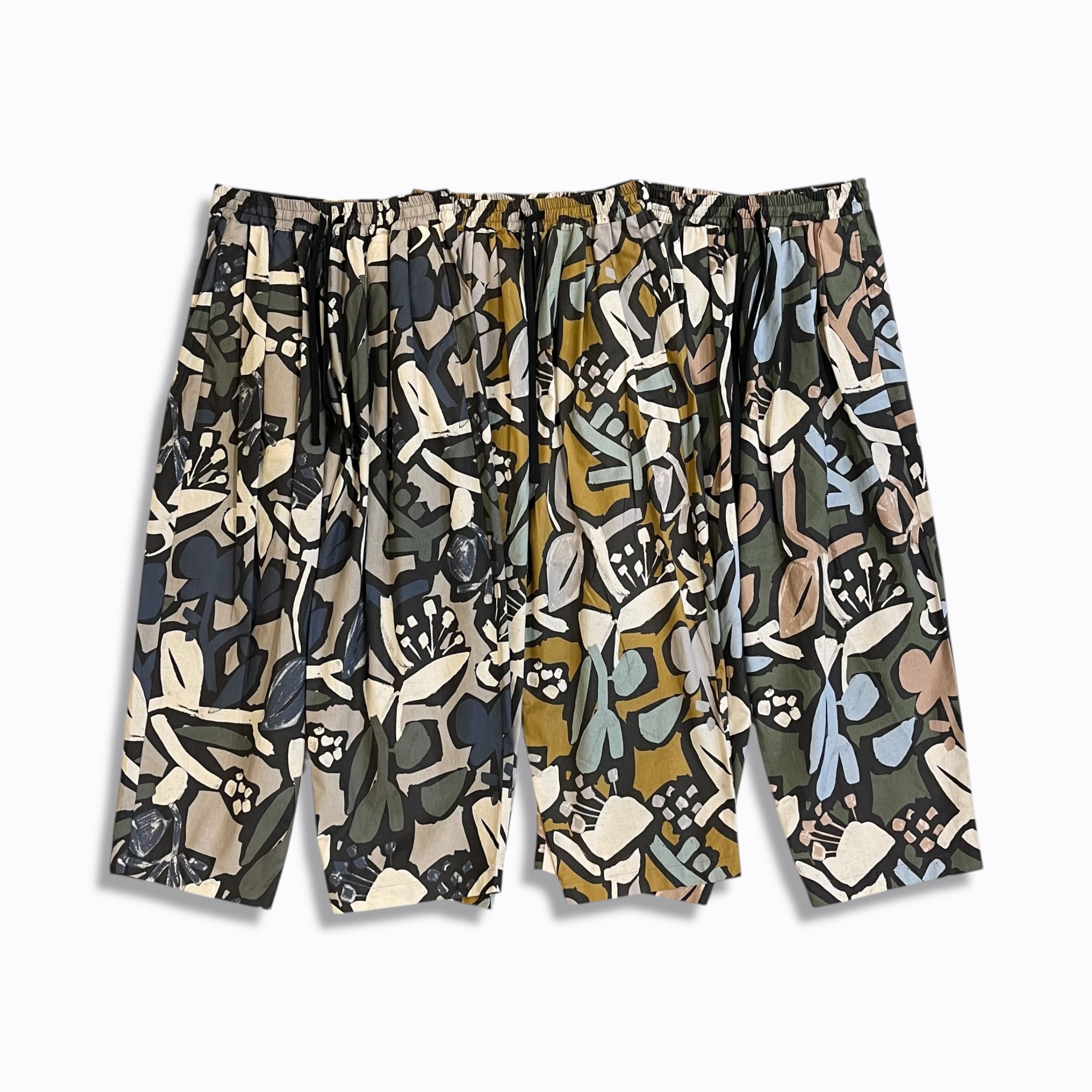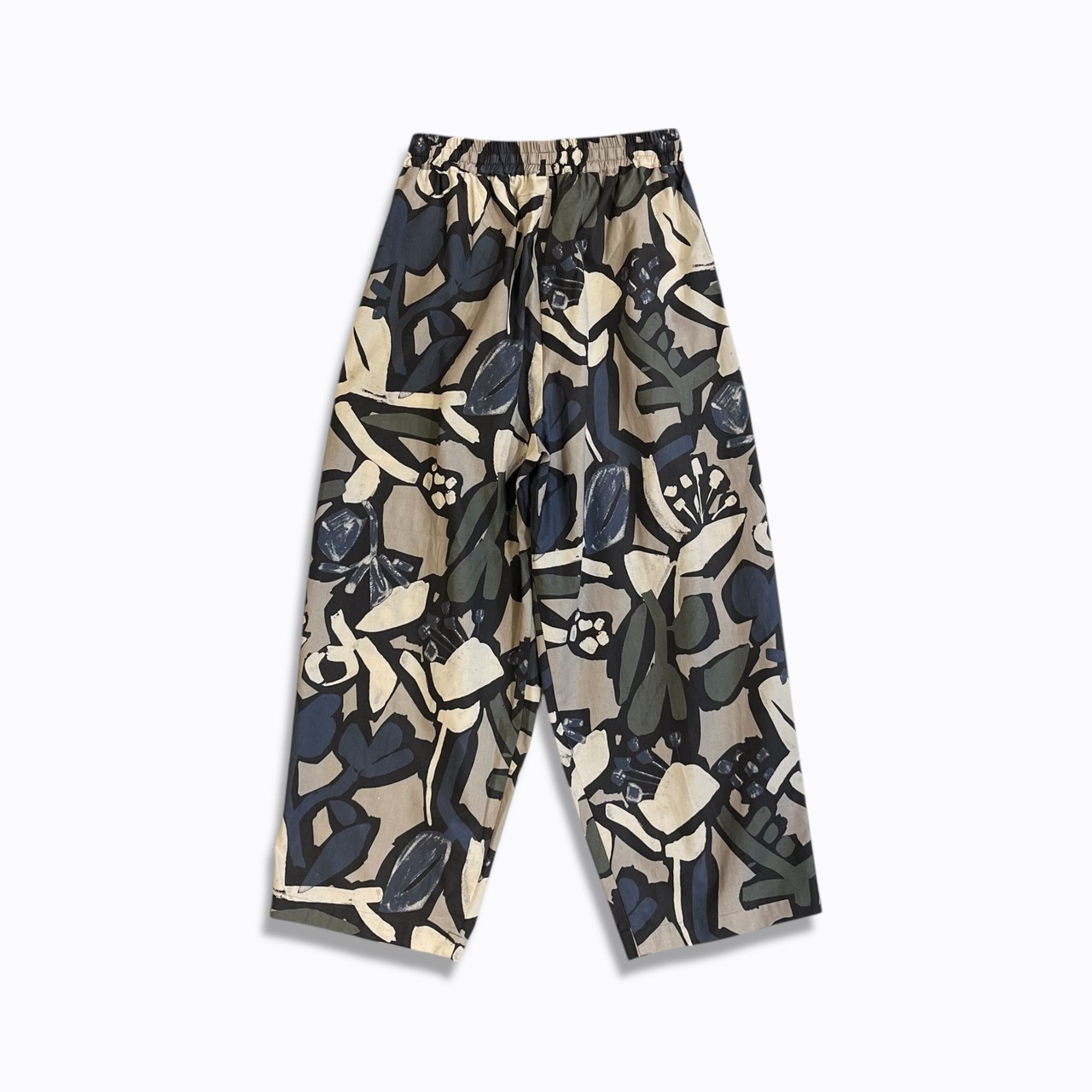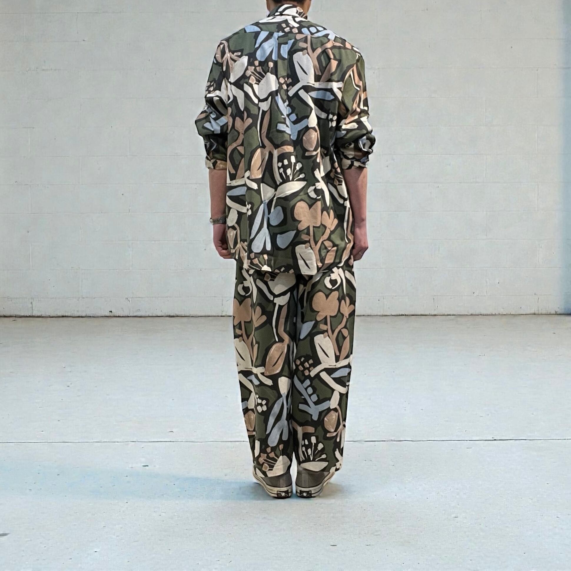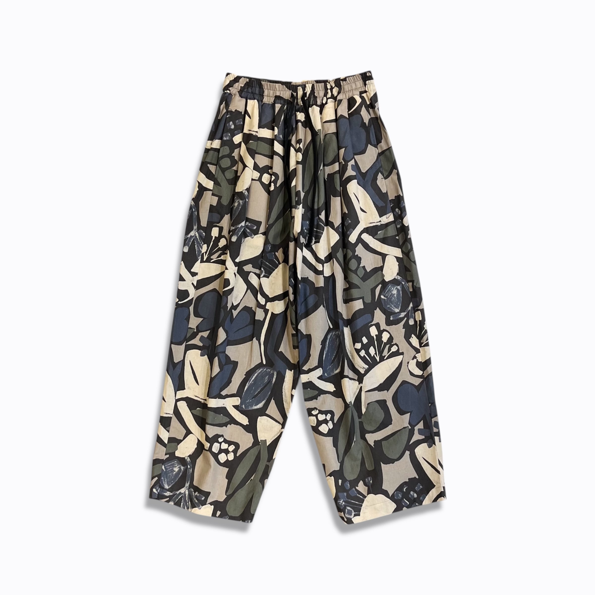 シーチング生地に顔料でフラワープリントを施した生地を使用したユニセックスなワイドイージーパンツ。