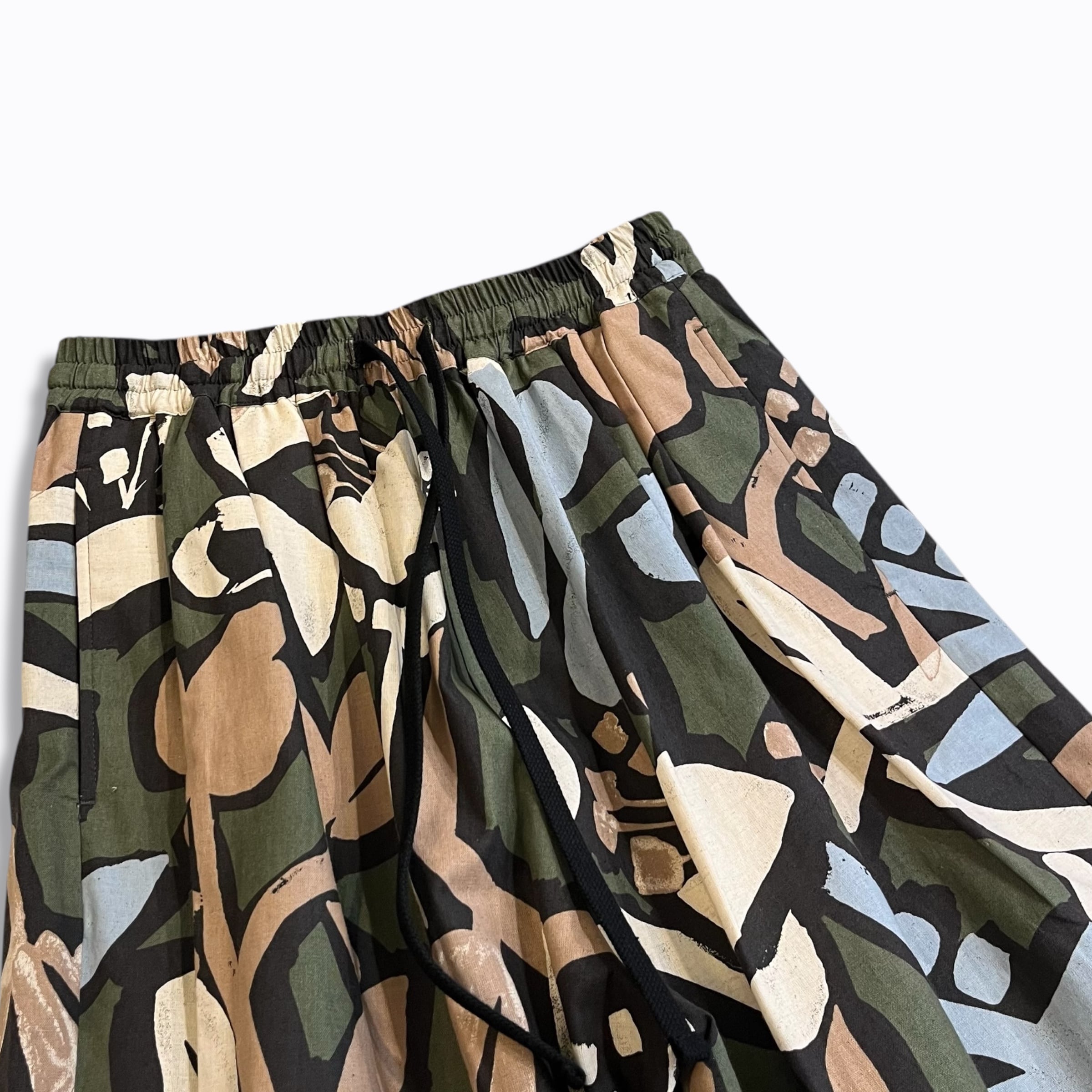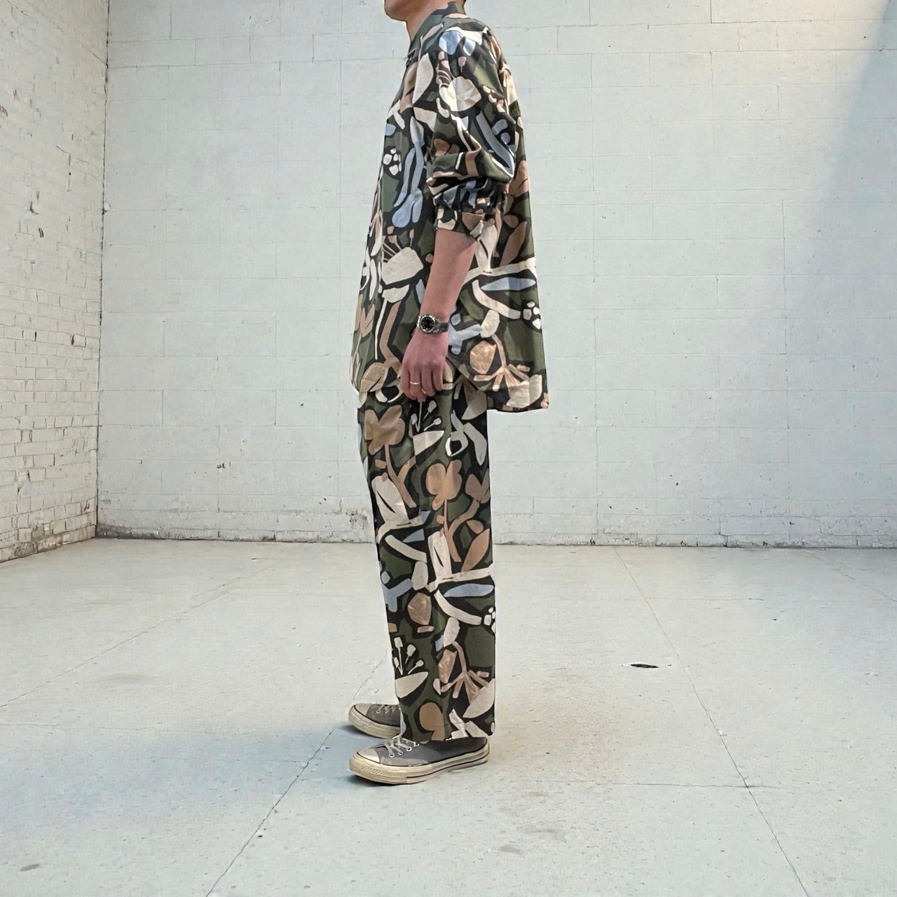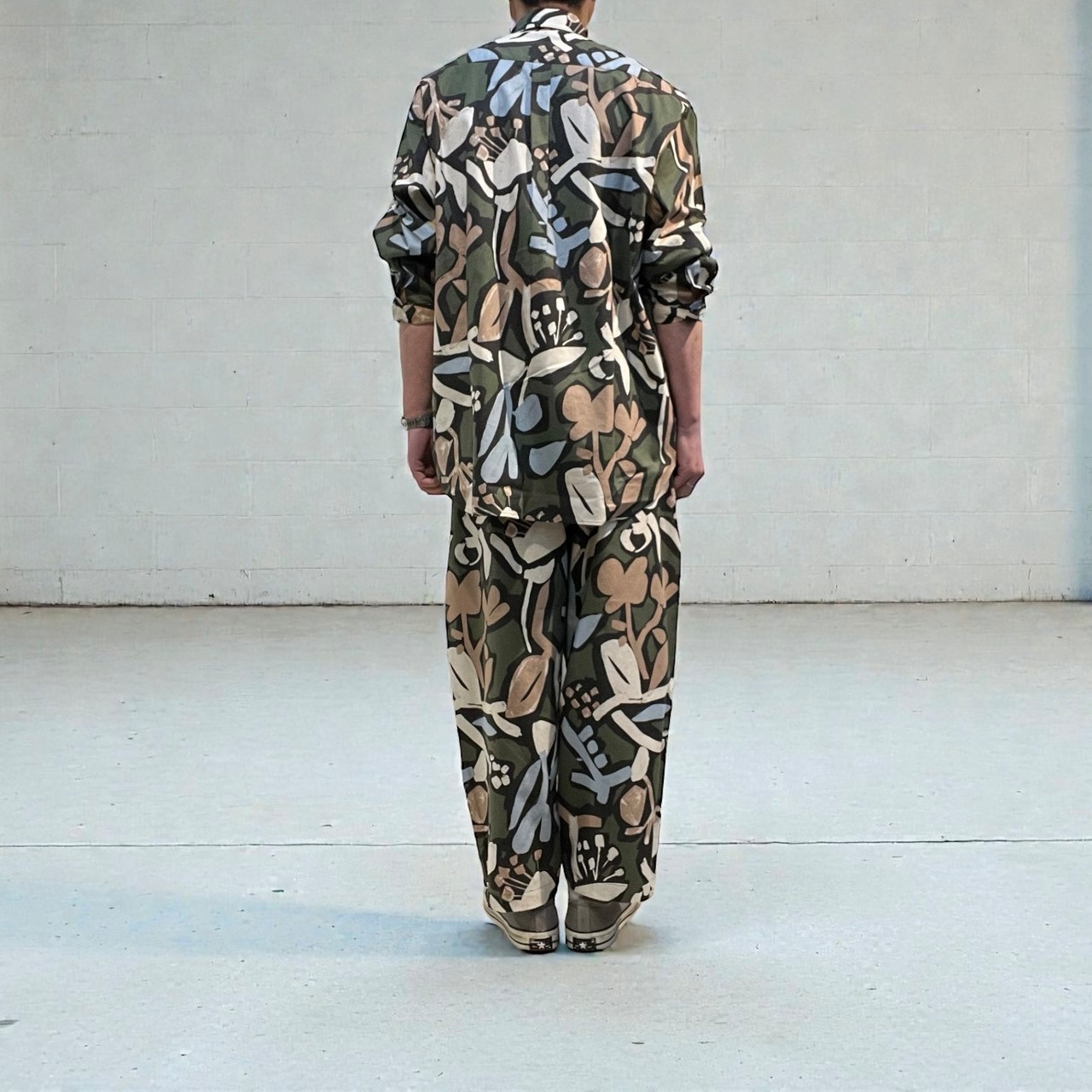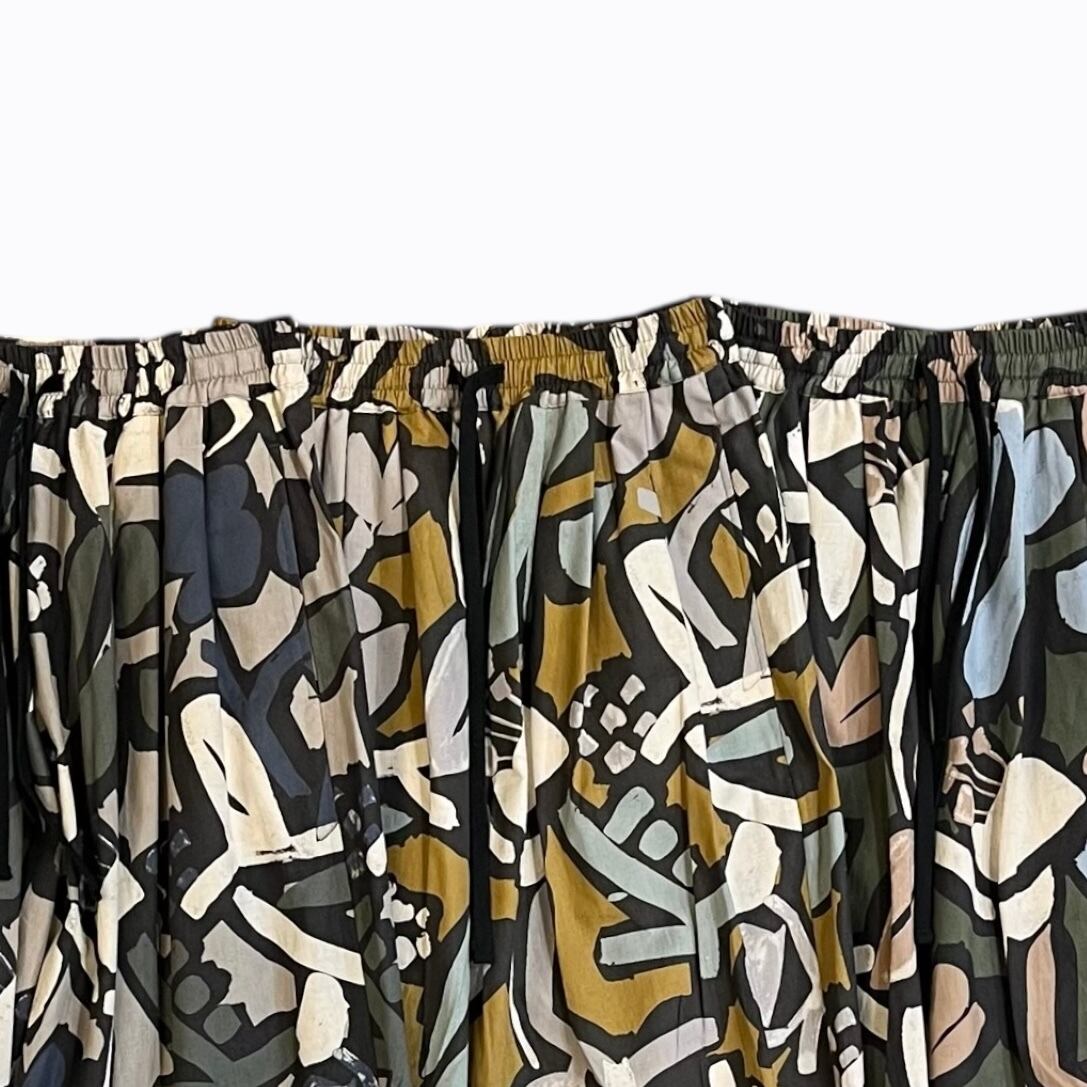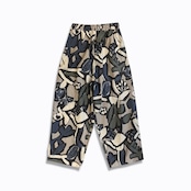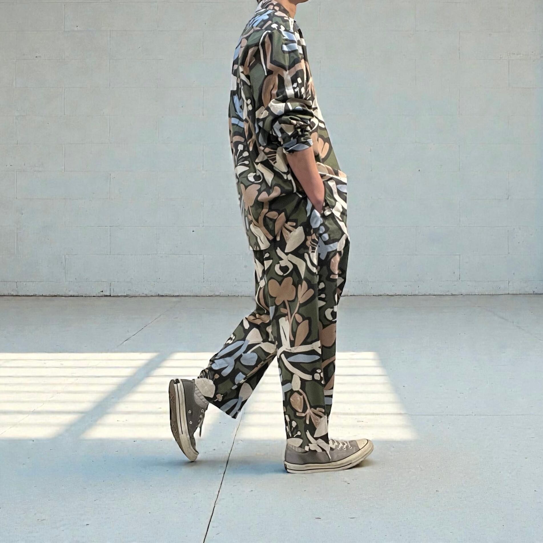 シーチング生地に顔料でフラワープリントを施した生地を使用したユニセックスなワイドイージーパンツ。