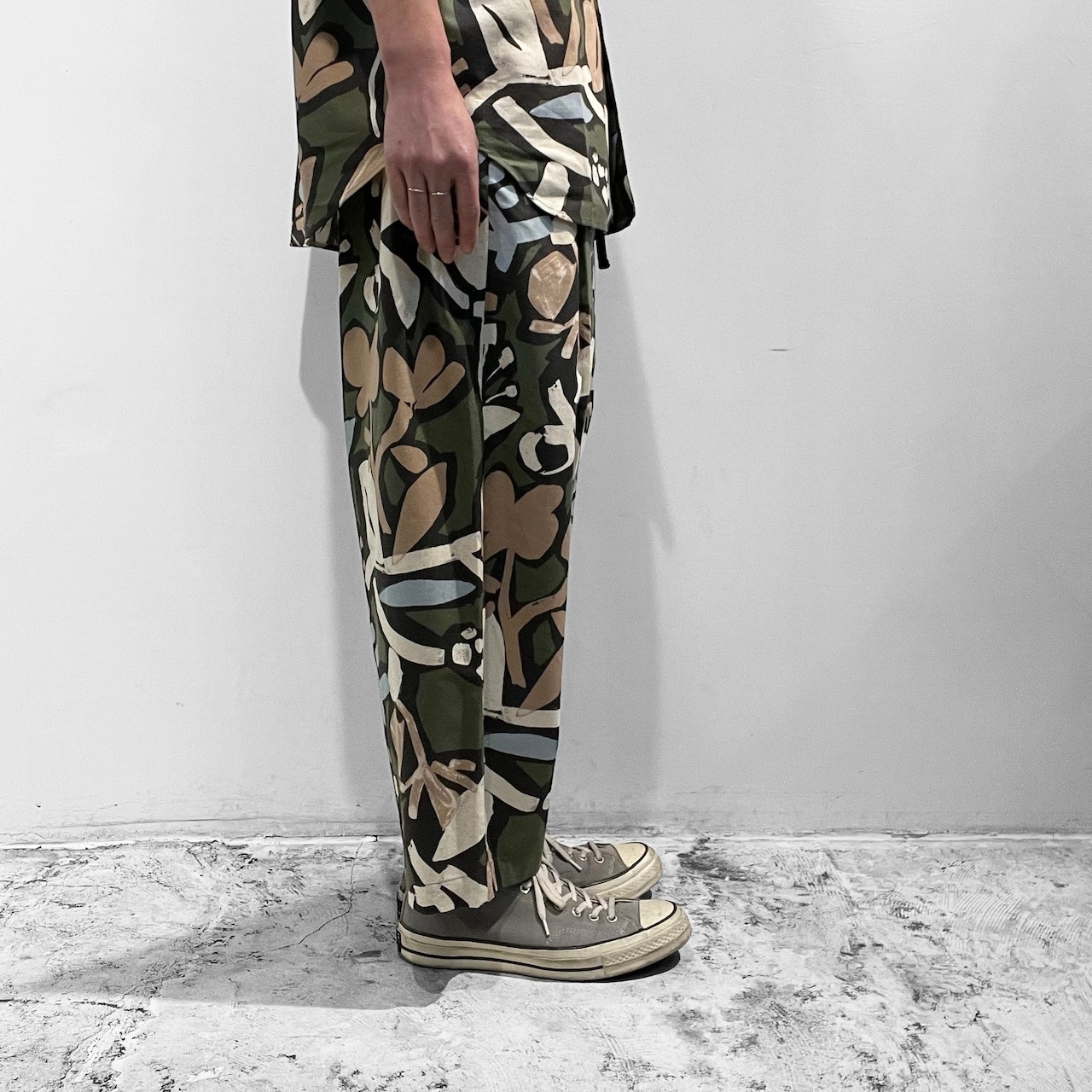 アートタッチな花柄プリントをデリケートに扱わず、USED製品を扱うようにイージーに捉え、洗濯したり着用する度に表情に変化が現れ、経年劣化が楽しめるギャップのあるパンツに仕上がっています。