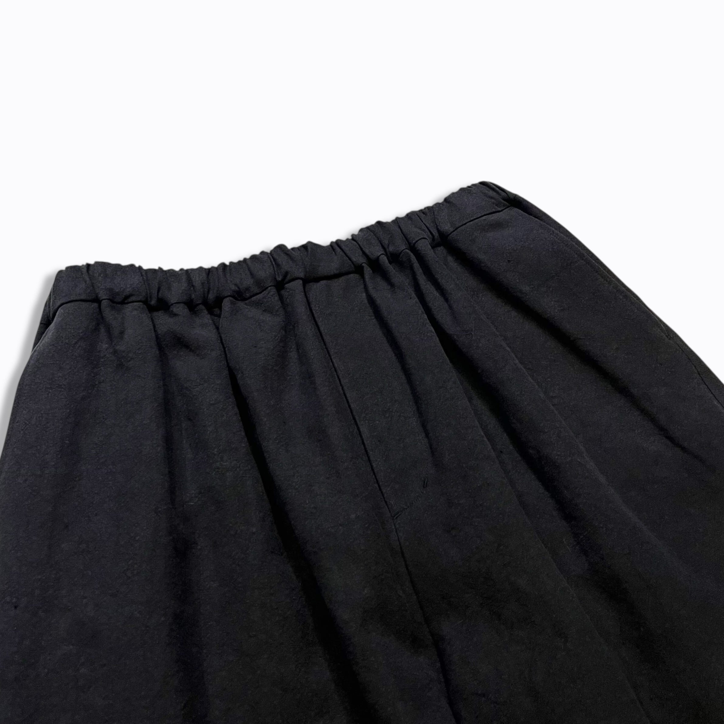 ウエストゴムと紐のイージー仕様、ゆったりとしたテーパード気味のワイドなシルエット。