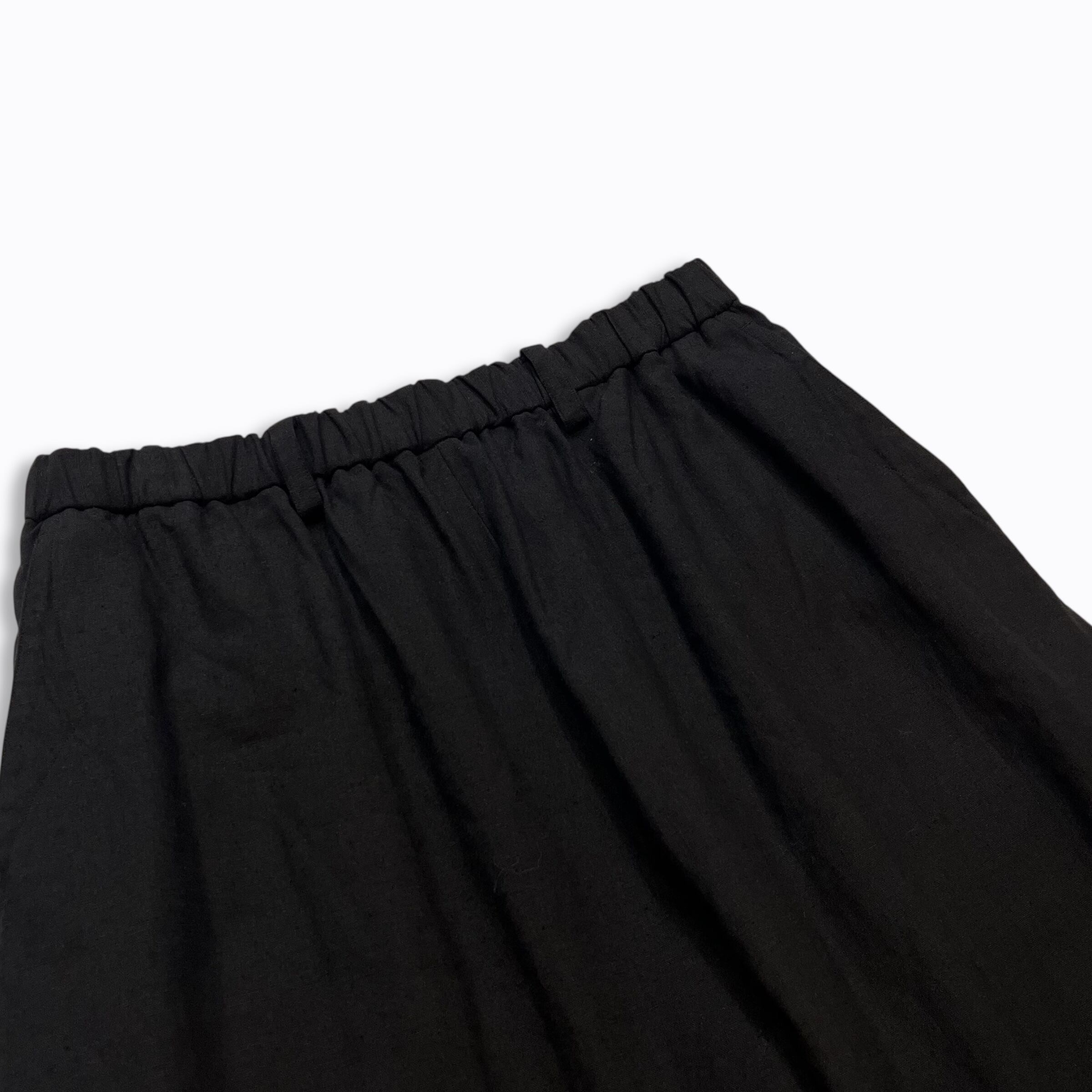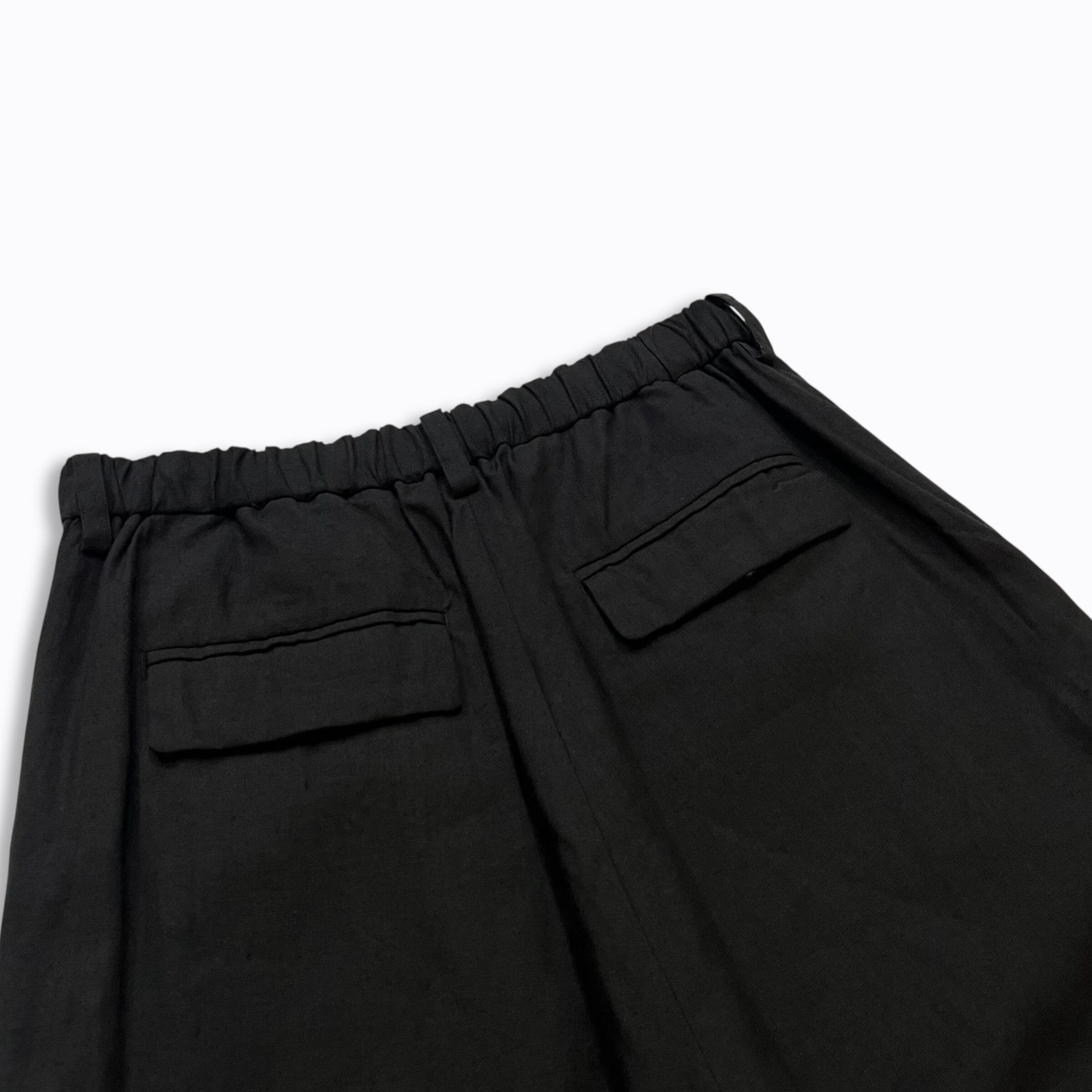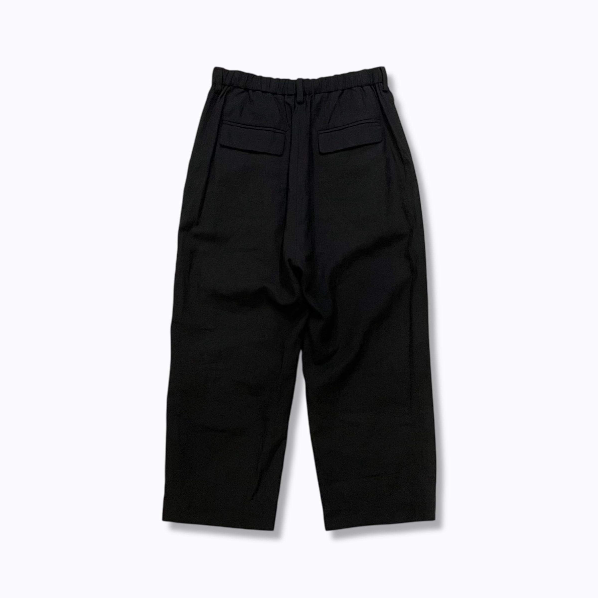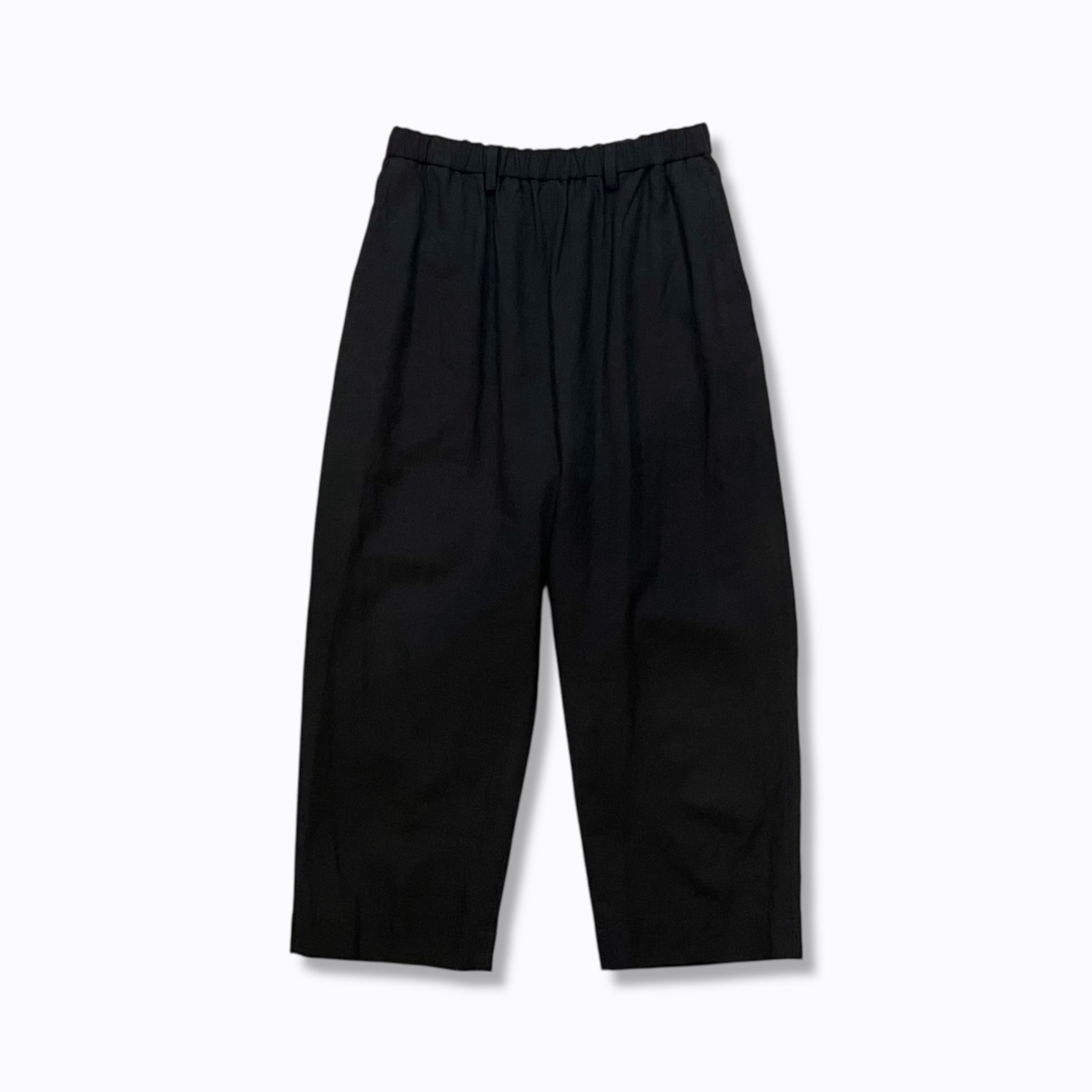 ウエスト紐付きのイージー仕様、程よいユルさもあるワイドでありながらスッキリとしたキレイなシルエットが特徴的。
