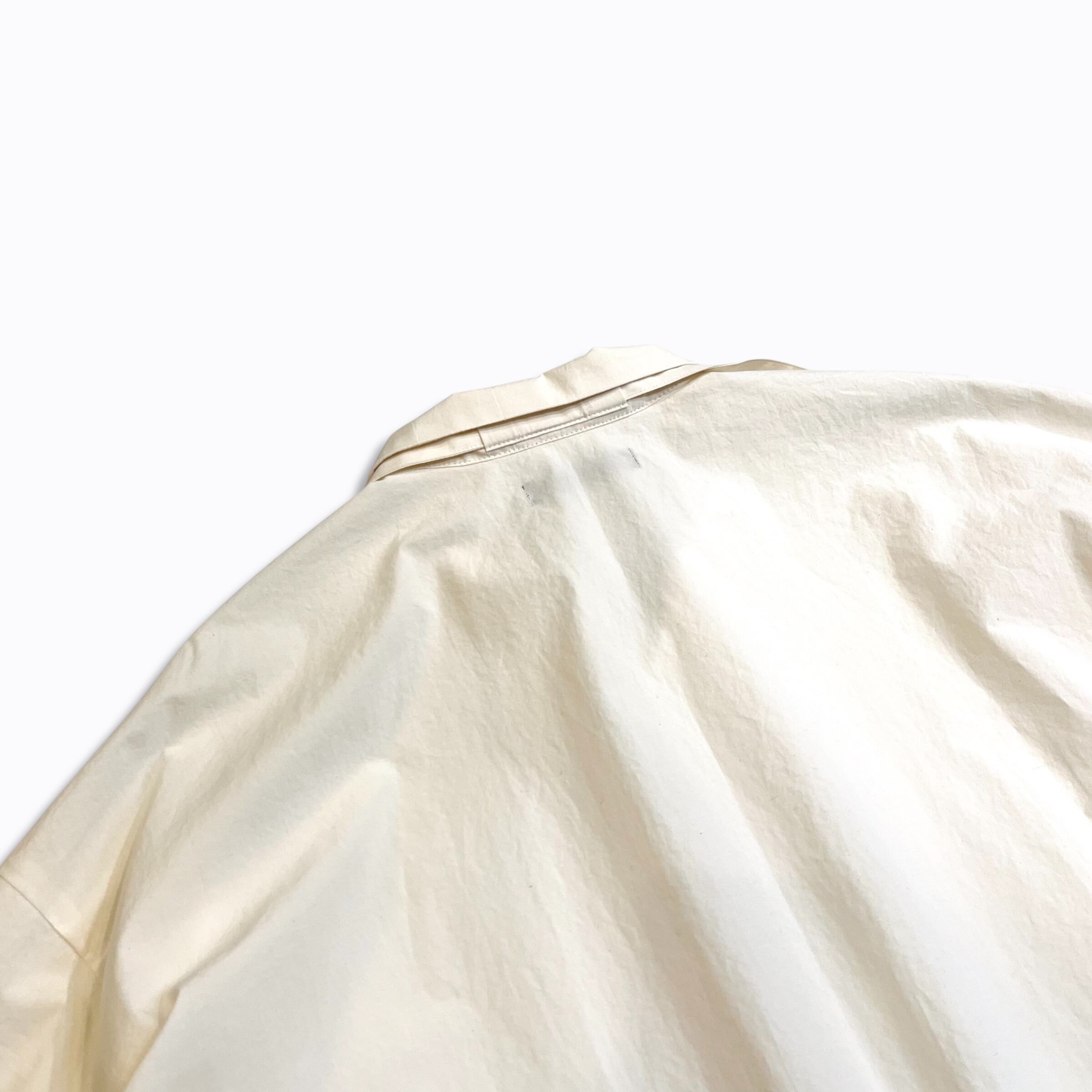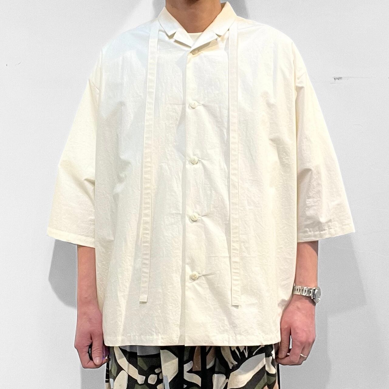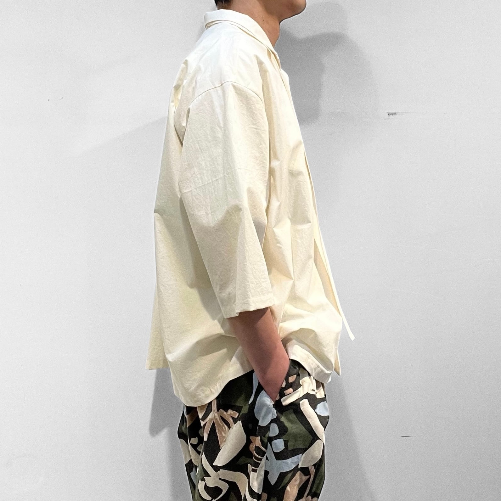 0番手のメキシカン超長綿糸を使用したタイプライター素材に洗い加工を施した表情豊かな天然素材、ユニセックスなオープンカラーシャツ。