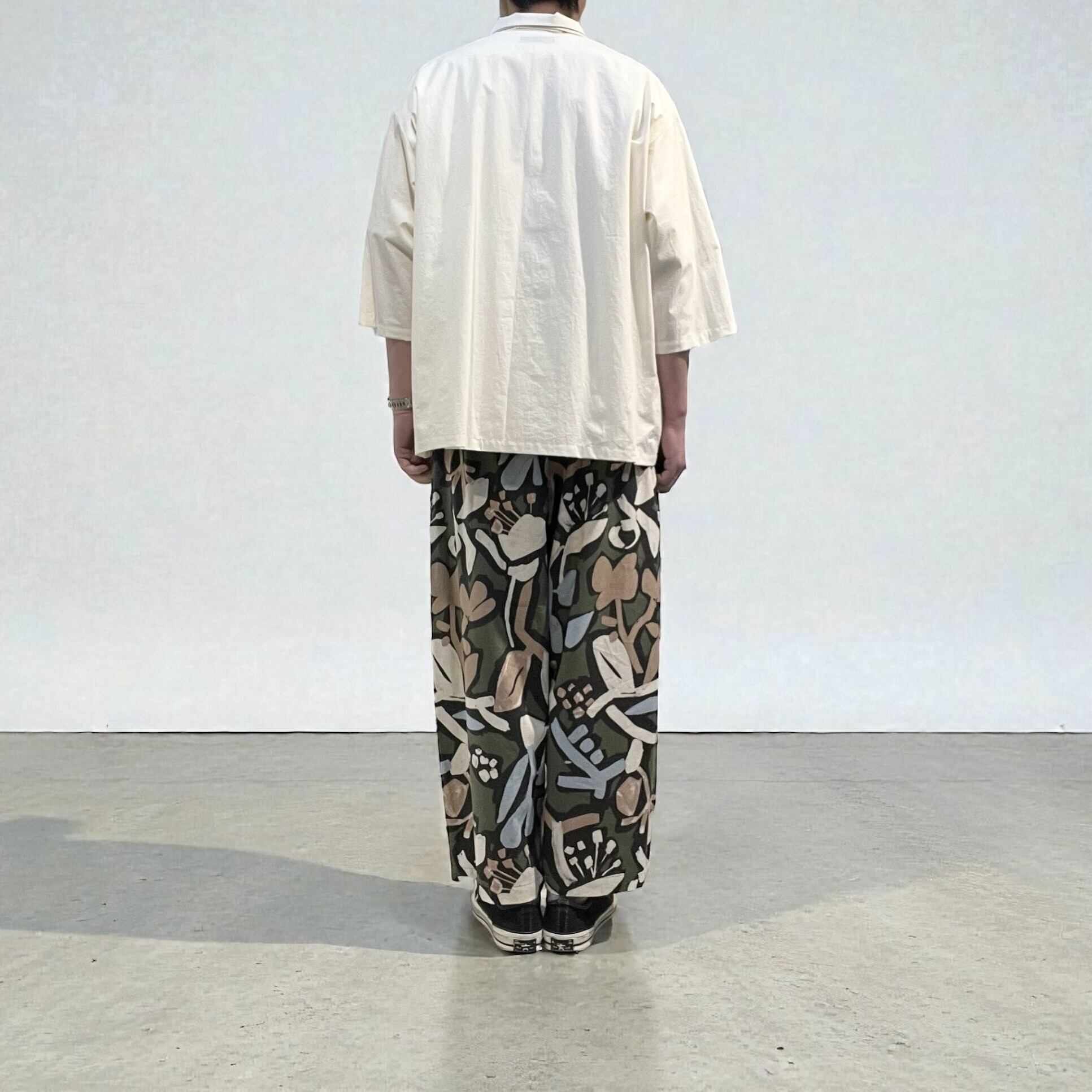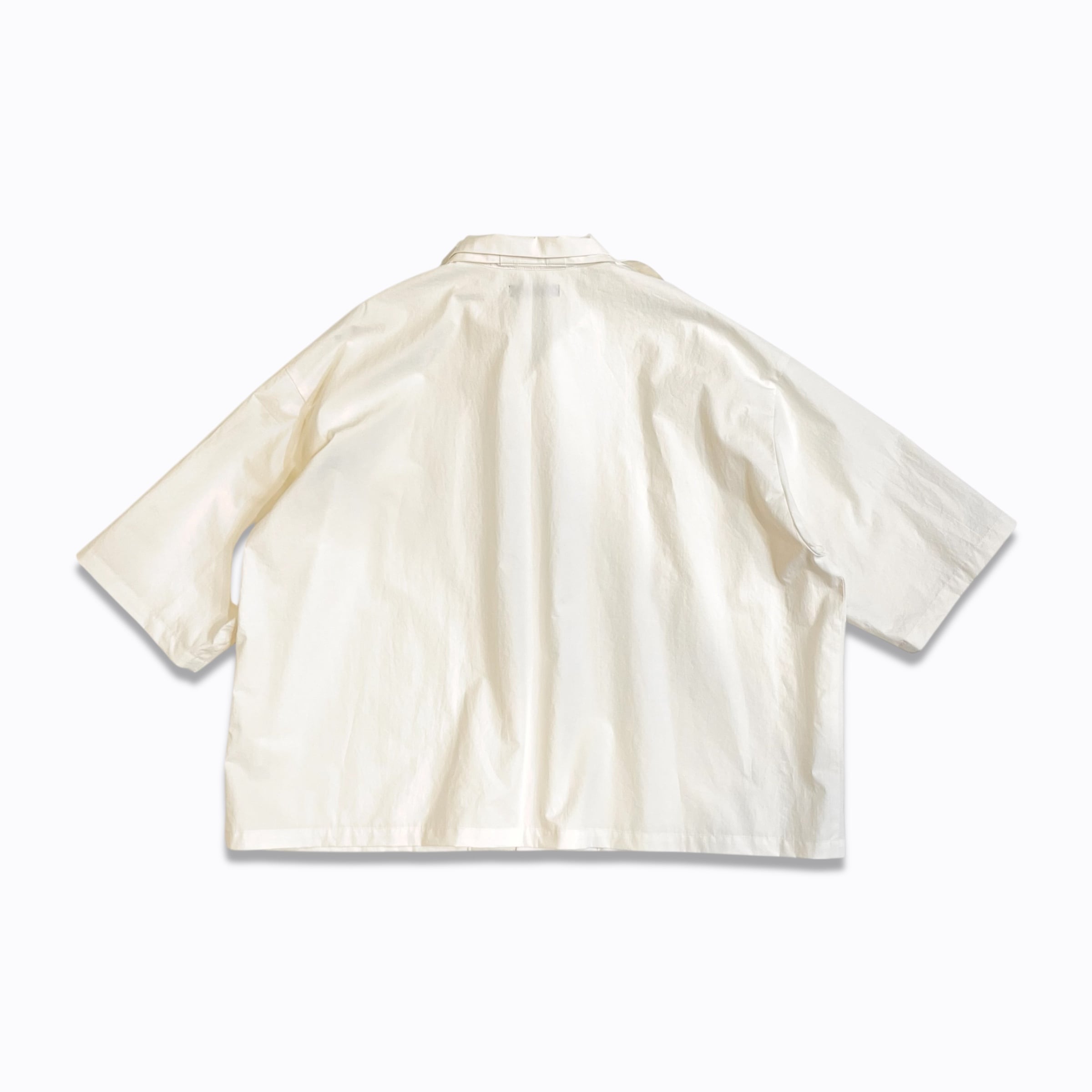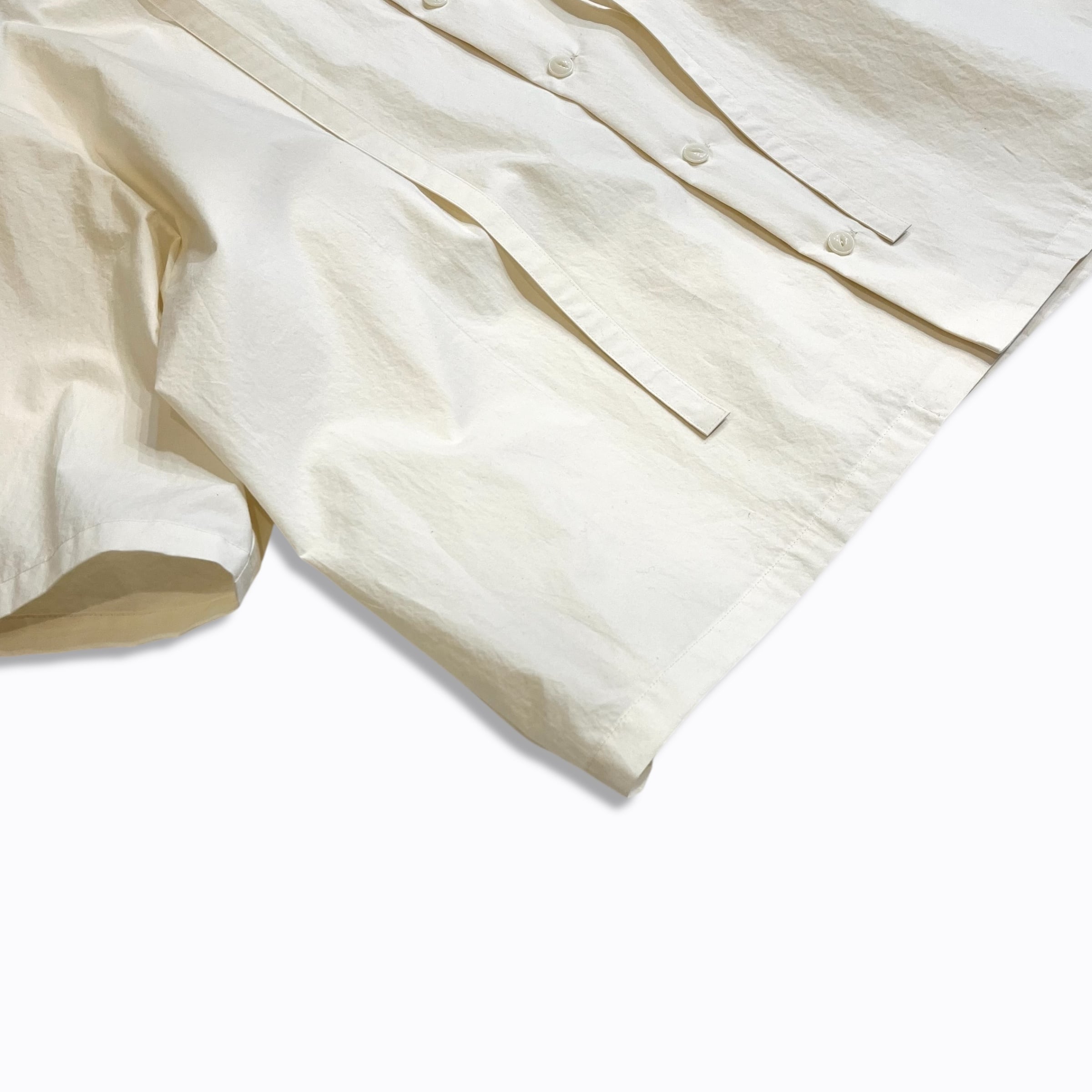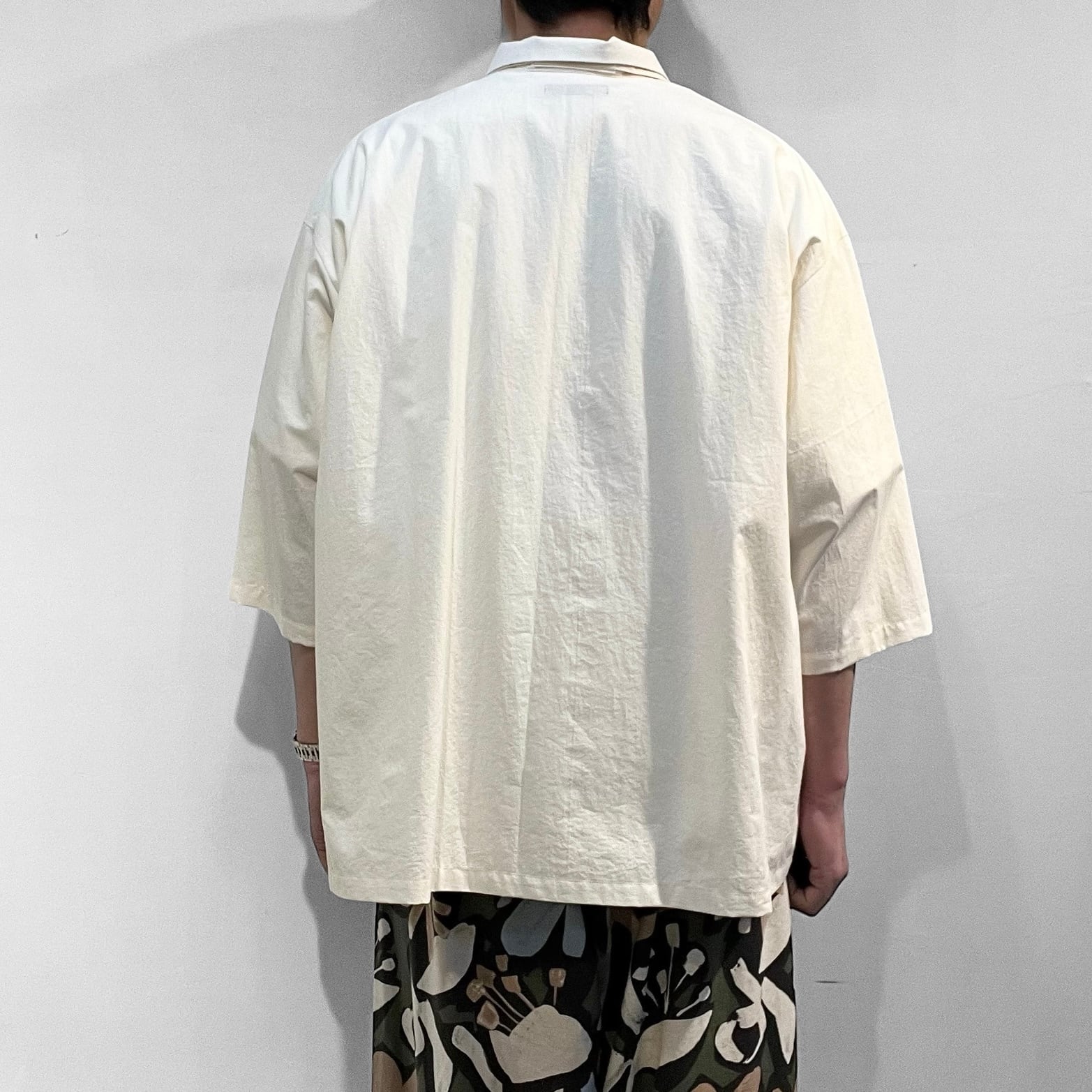 0番手のメキシカン超長綿糸を使用したタイプライター素材に洗い加工を施した表情豊かな天然素材、ユニセックスなオープンカラーシャツ。