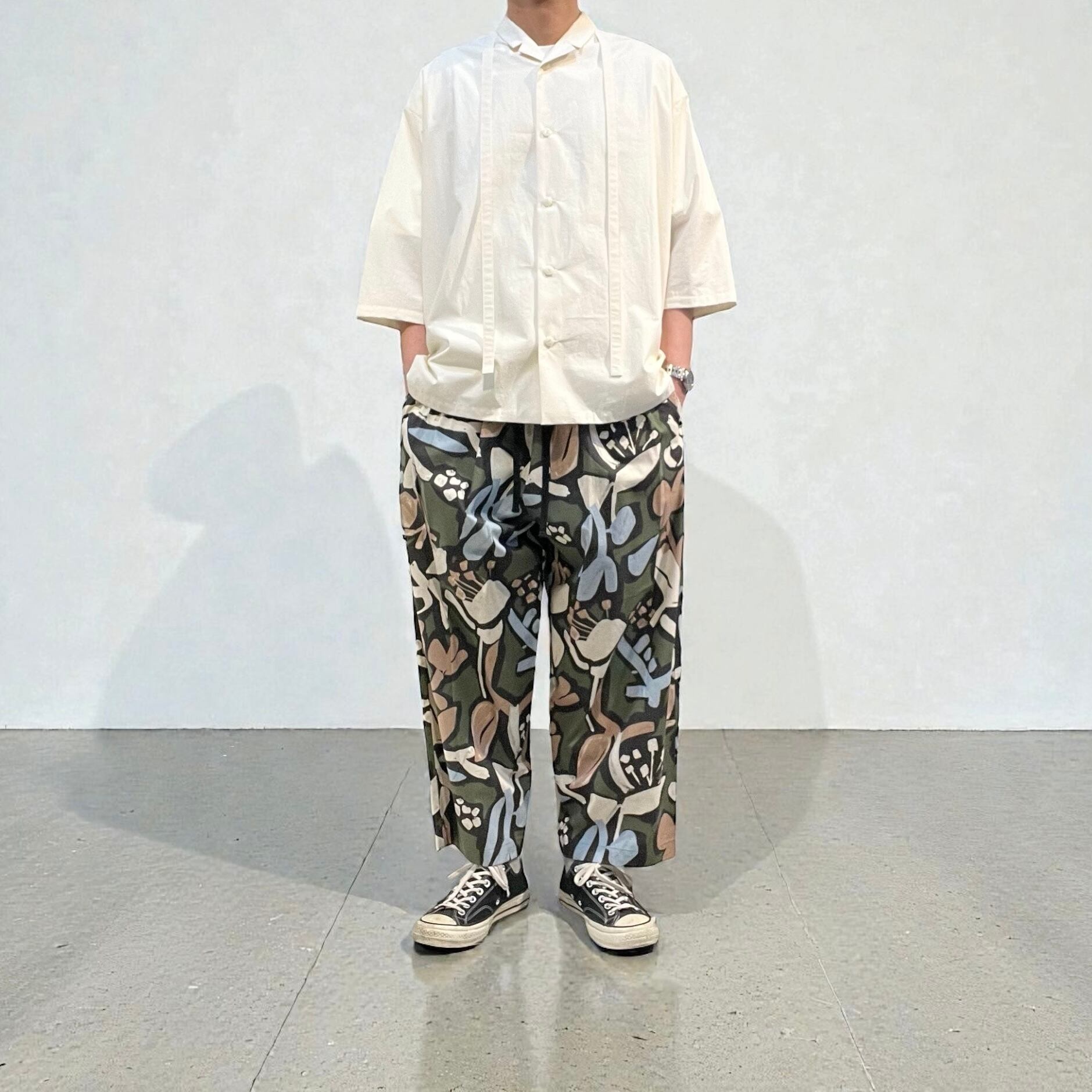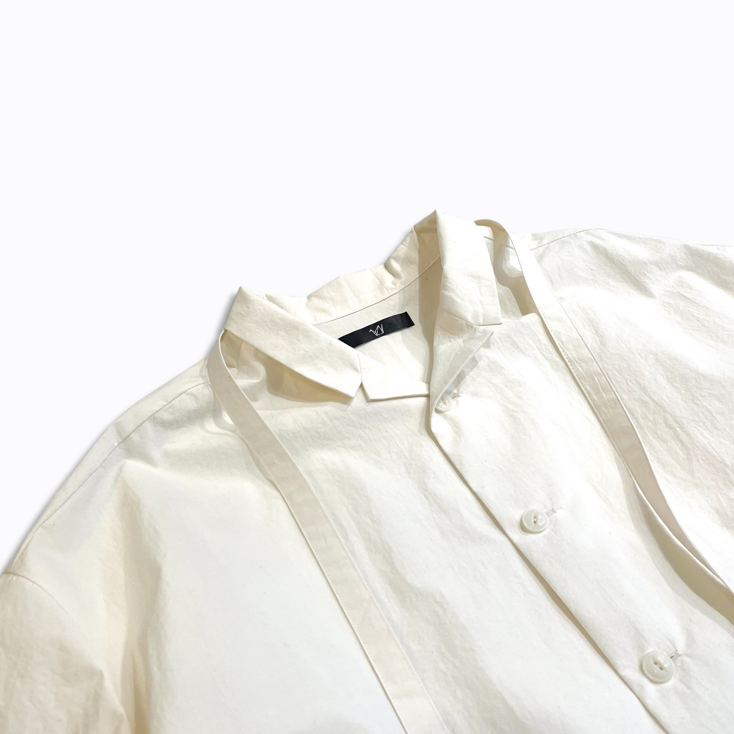 開衿仕立て、七分袖に後ろ襟に同素材の紐を通し変化を加えたデザイン。どんなアイテムとも合わせやすく、シンプルで汎用性の高い一枚です。