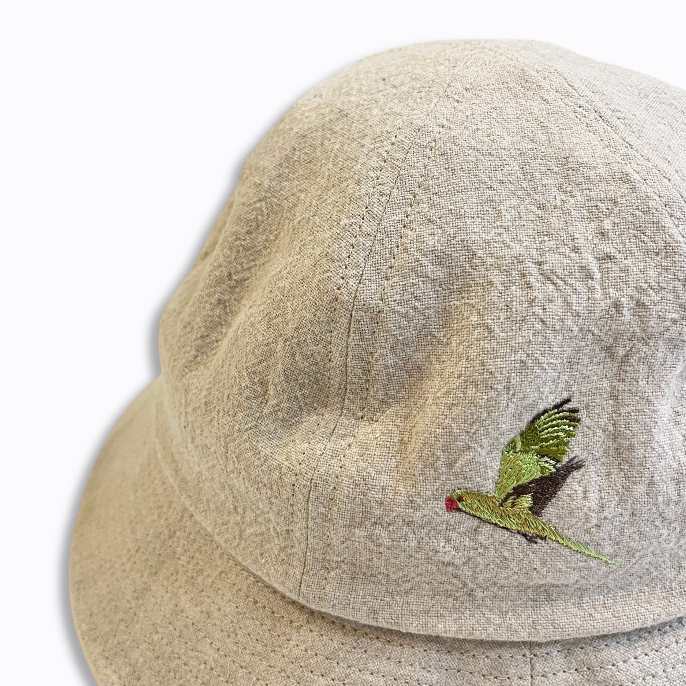 天然素材ならではの奥深い表情の生地とサイドにさり気なく刺繍したインコが力の抜けた絶妙なバランス。