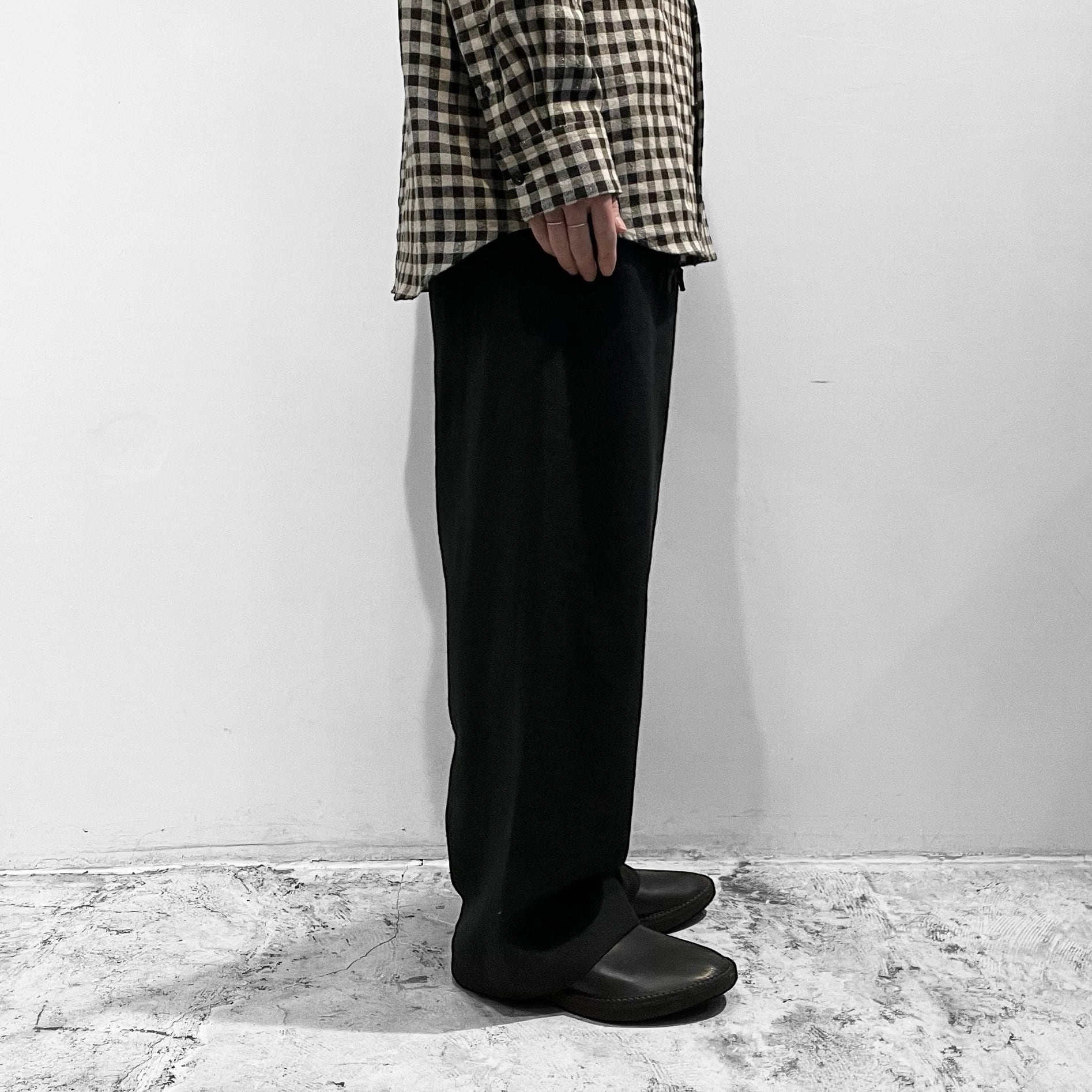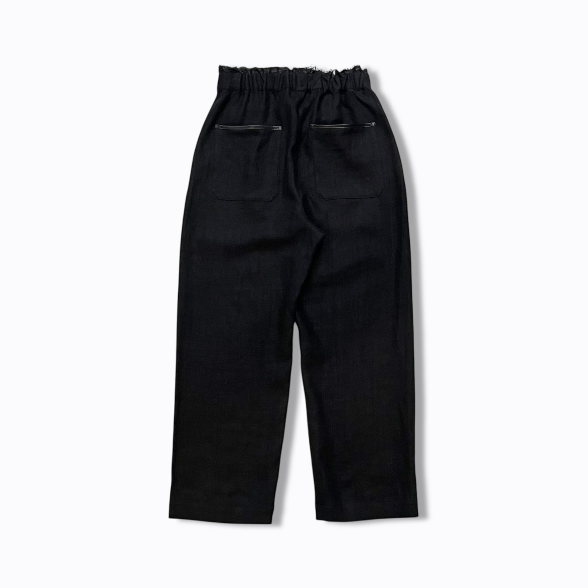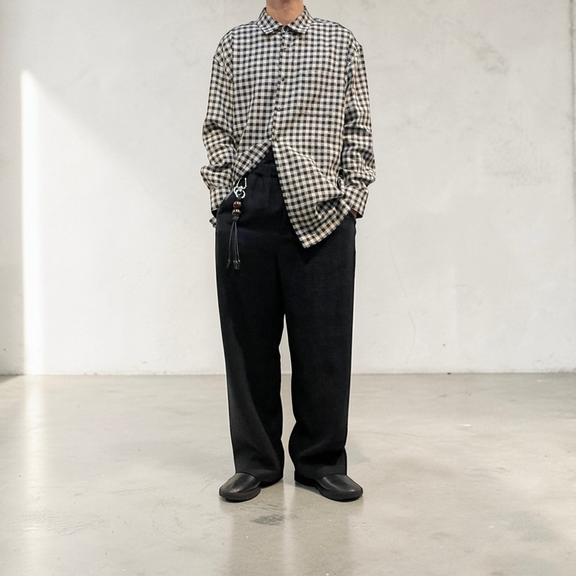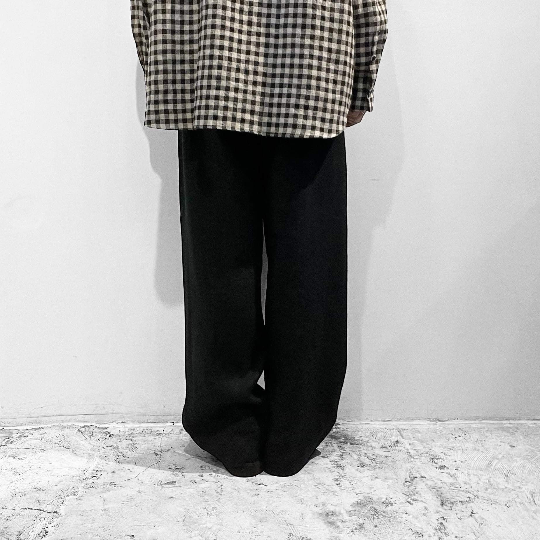 ウエストゴムと紐のイージー仕様、太めのストレートシルエットに、脇のシームを排した設計により、布の落ち感や陰影がなめらかに現れ素材そのものの表情を引き立たせています。