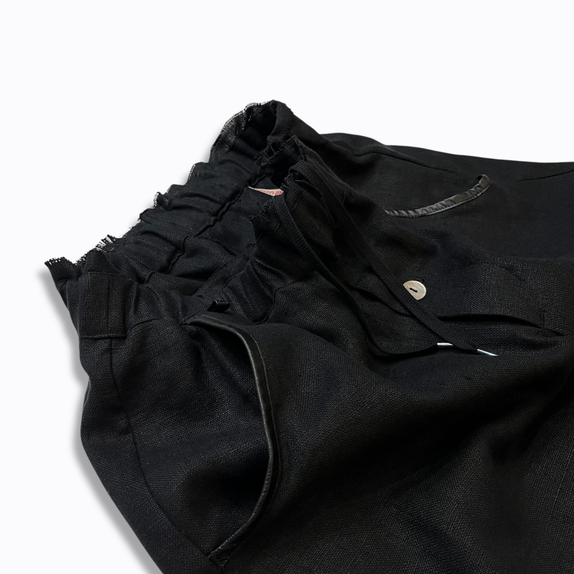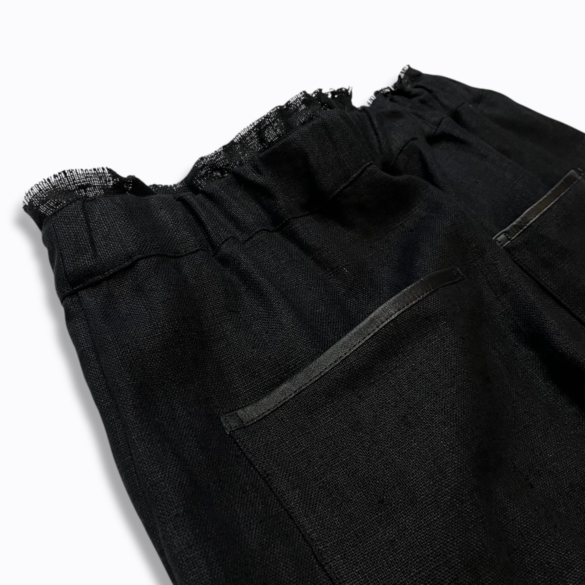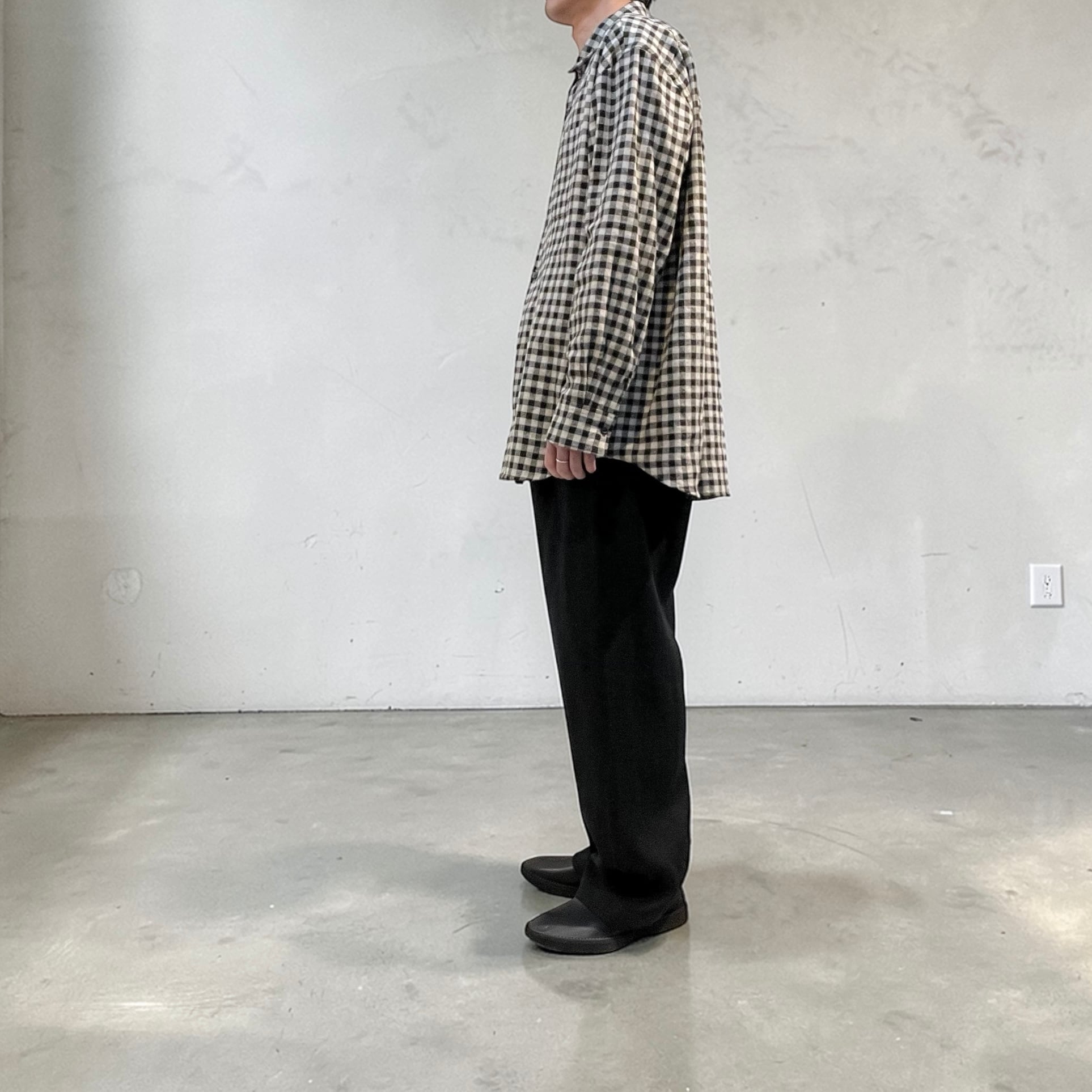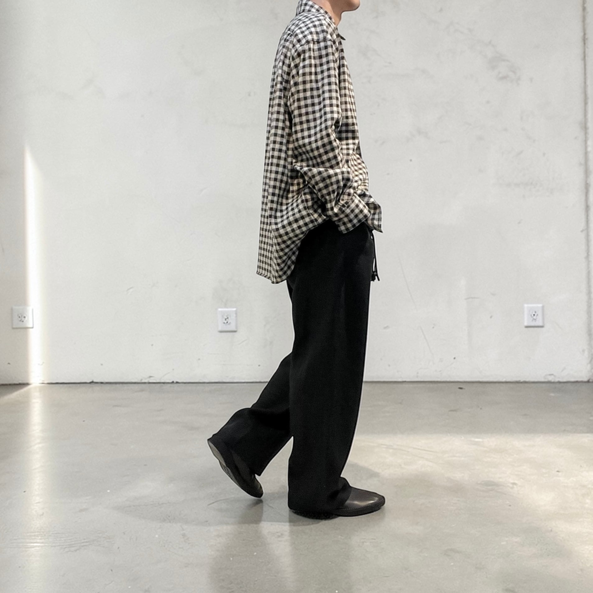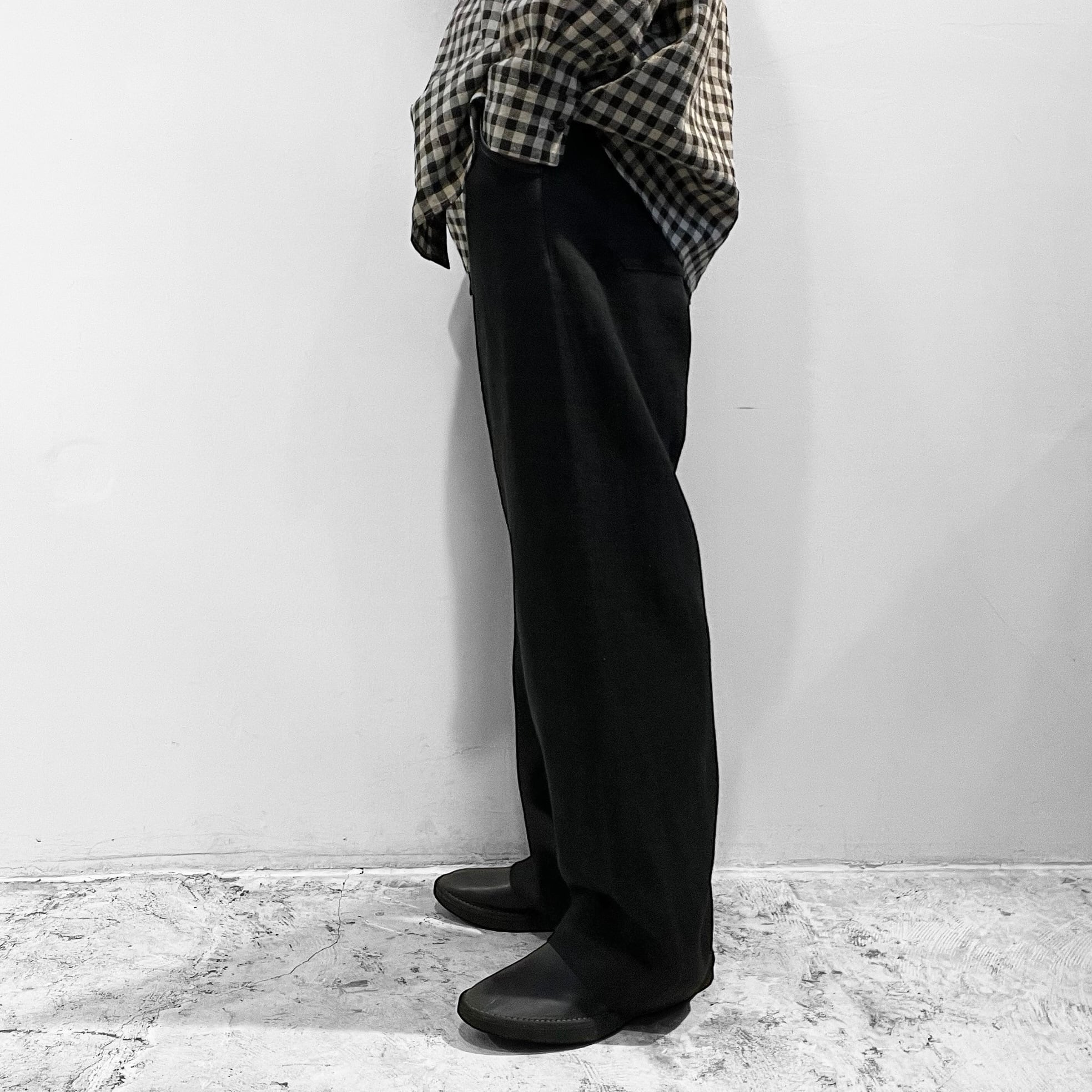 ウエストゴムと紐のイージー仕様、太めのストレートシルエットに、脇のシームを排した設計により、布の落ち感や陰影がなめらかに現れ素材そのものの表情を引き立たせています。