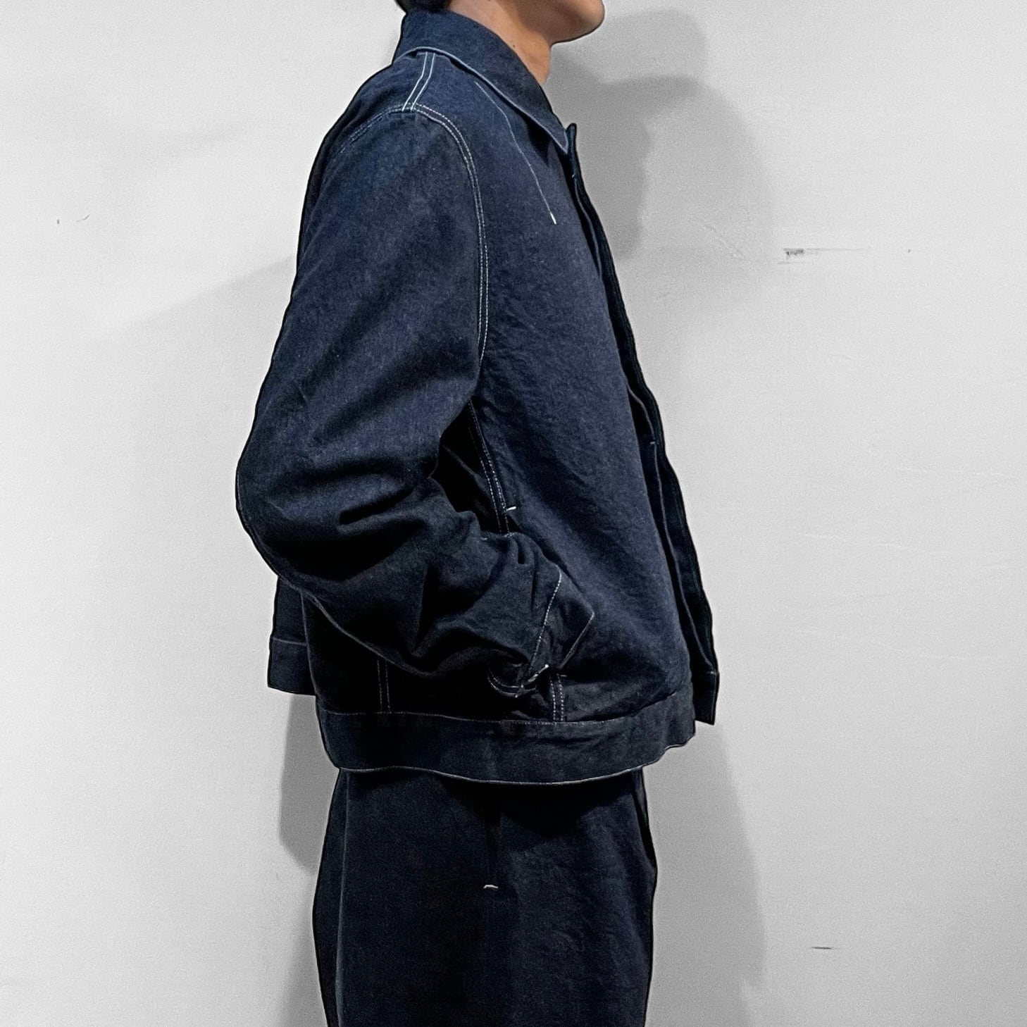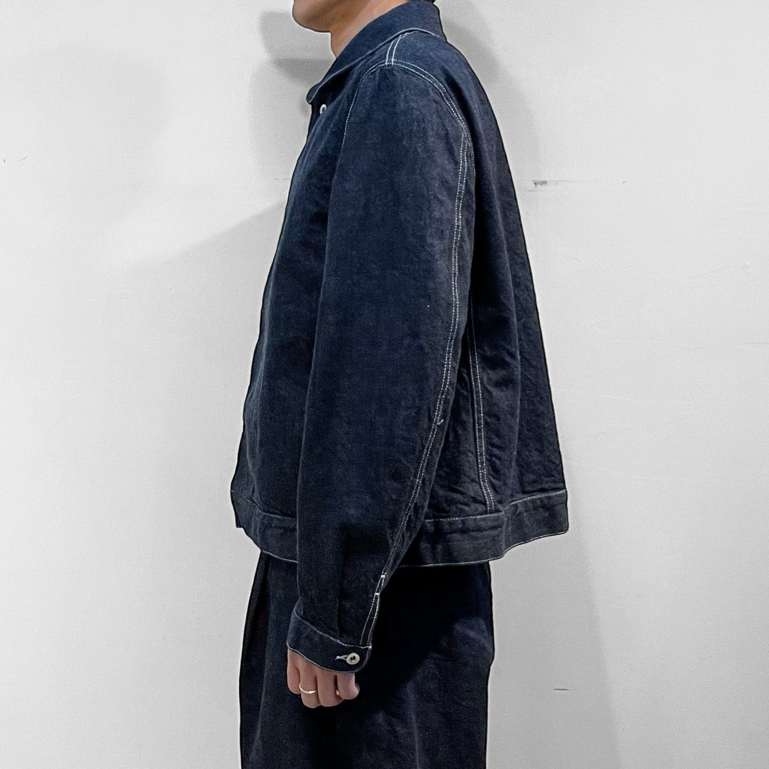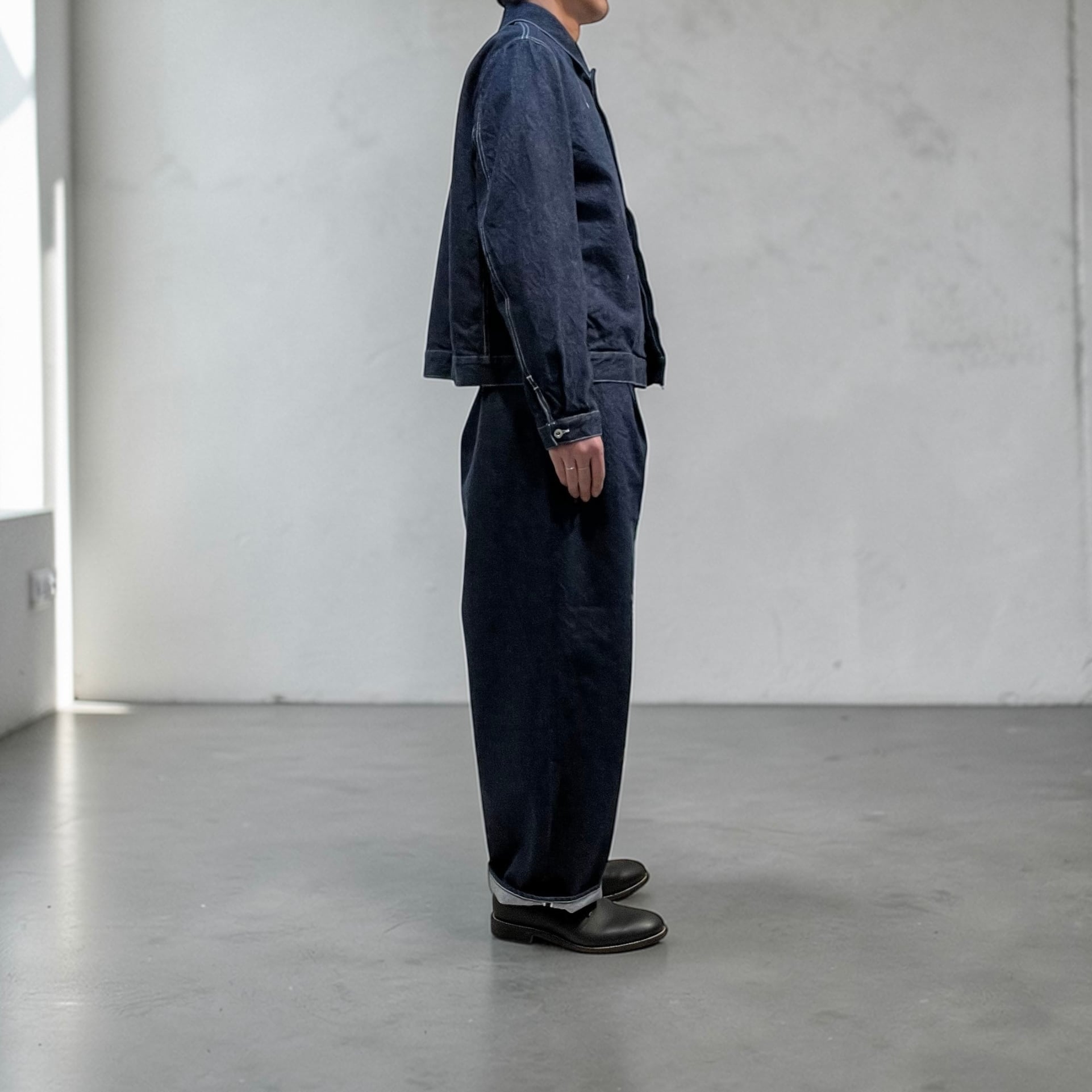ステンカラー、第二釦以下比翼仕立て、両脇シームポケット付き、前立て見返し端セルビッチ使いのミニマルなルックスに程々のサイズシルエット。