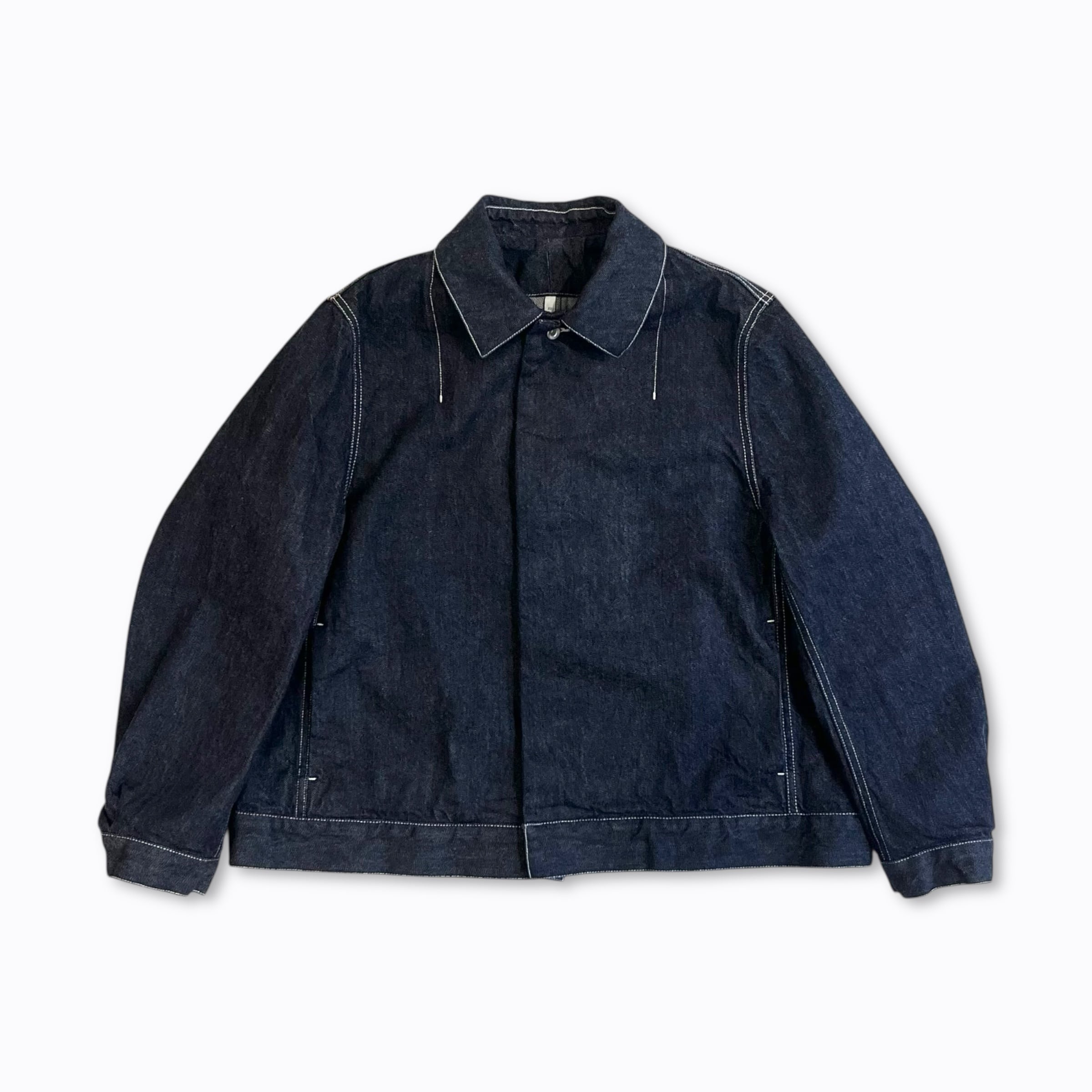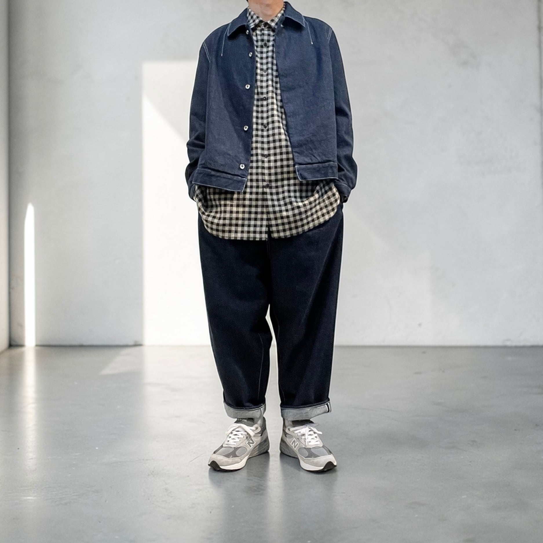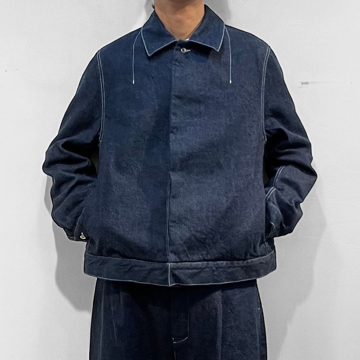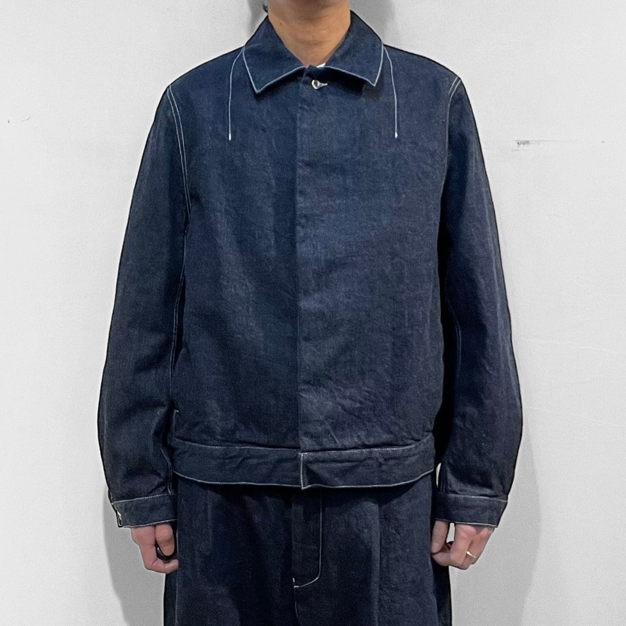 ステンカラー、第二釦以下比翼仕立て、両脇シームポケット付き、前立て見返し端セルビッチ使いのミニマルなルックスに程々のサイズシルエット。