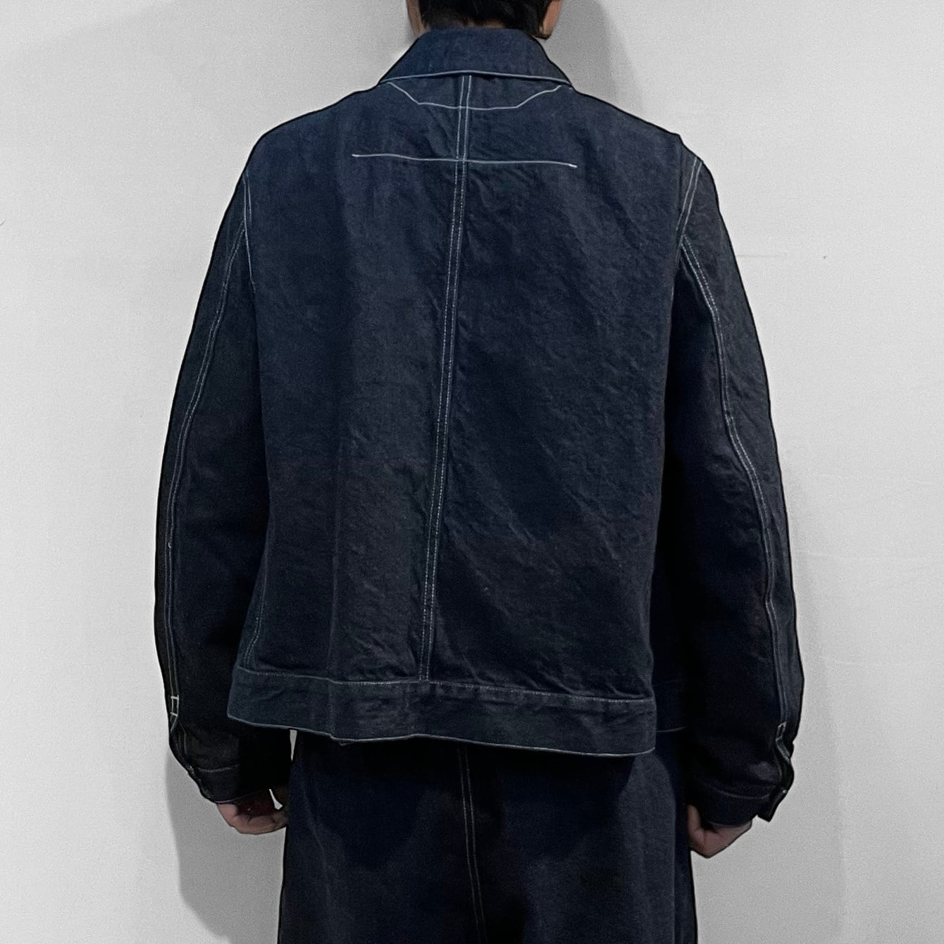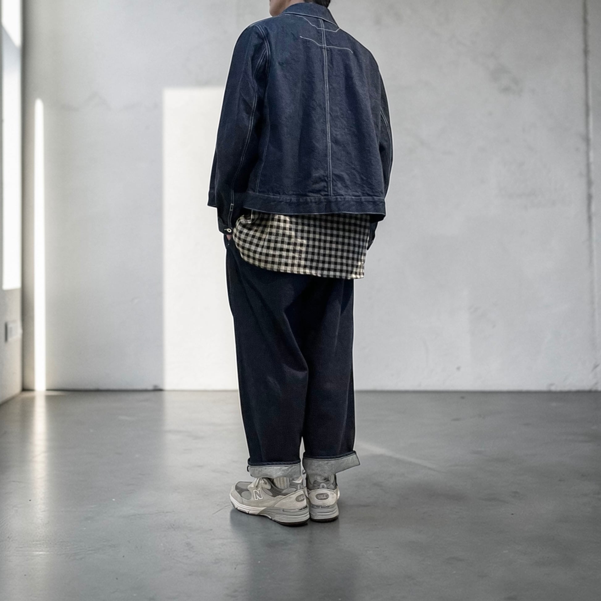 裾が外側に跳ねるパターンなど立体的なパターンで作成され、コンパクトなシルエットに加えストレッチ性の無いデニム生地でありながらも、着用時の身体を動かしやすい形に仕上げています。