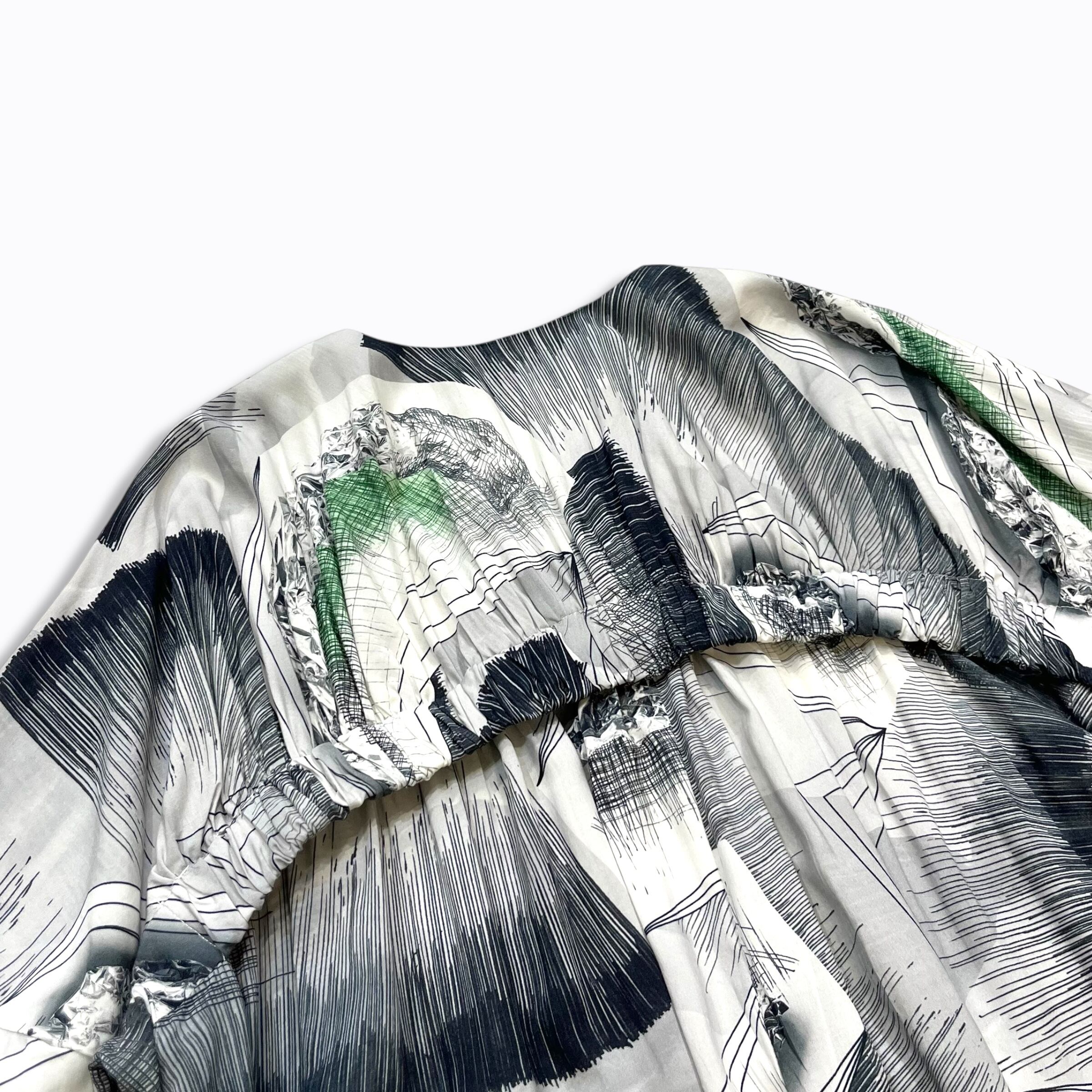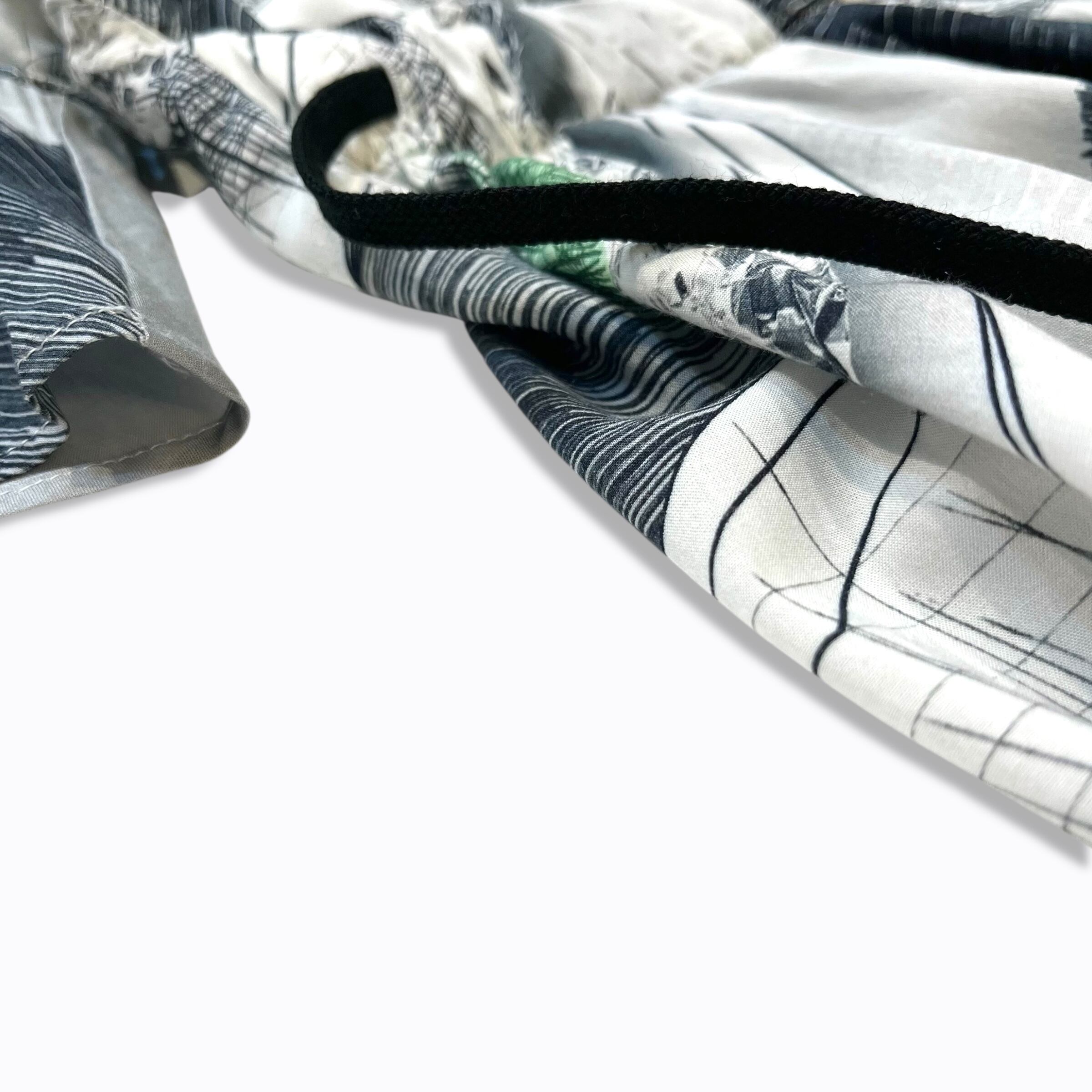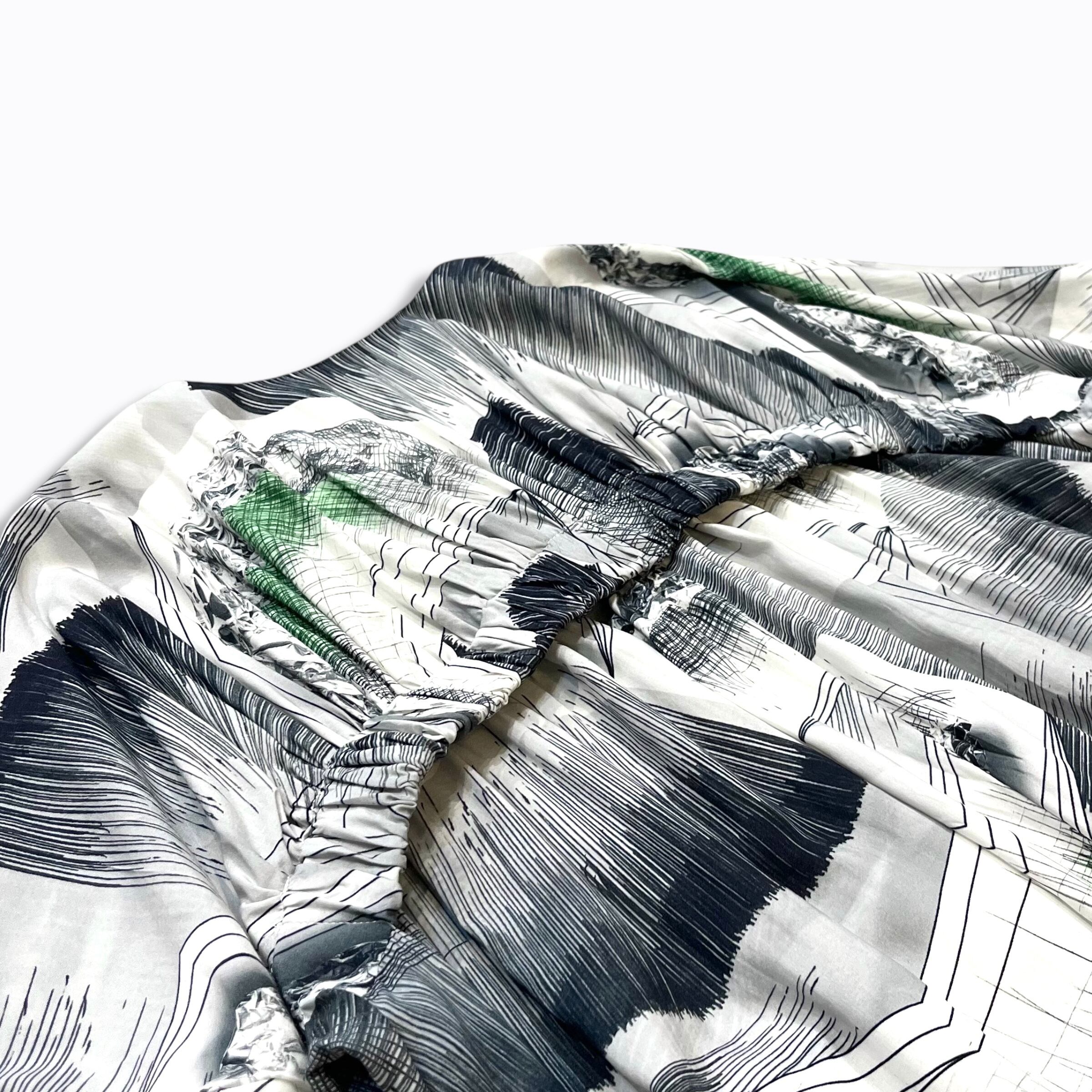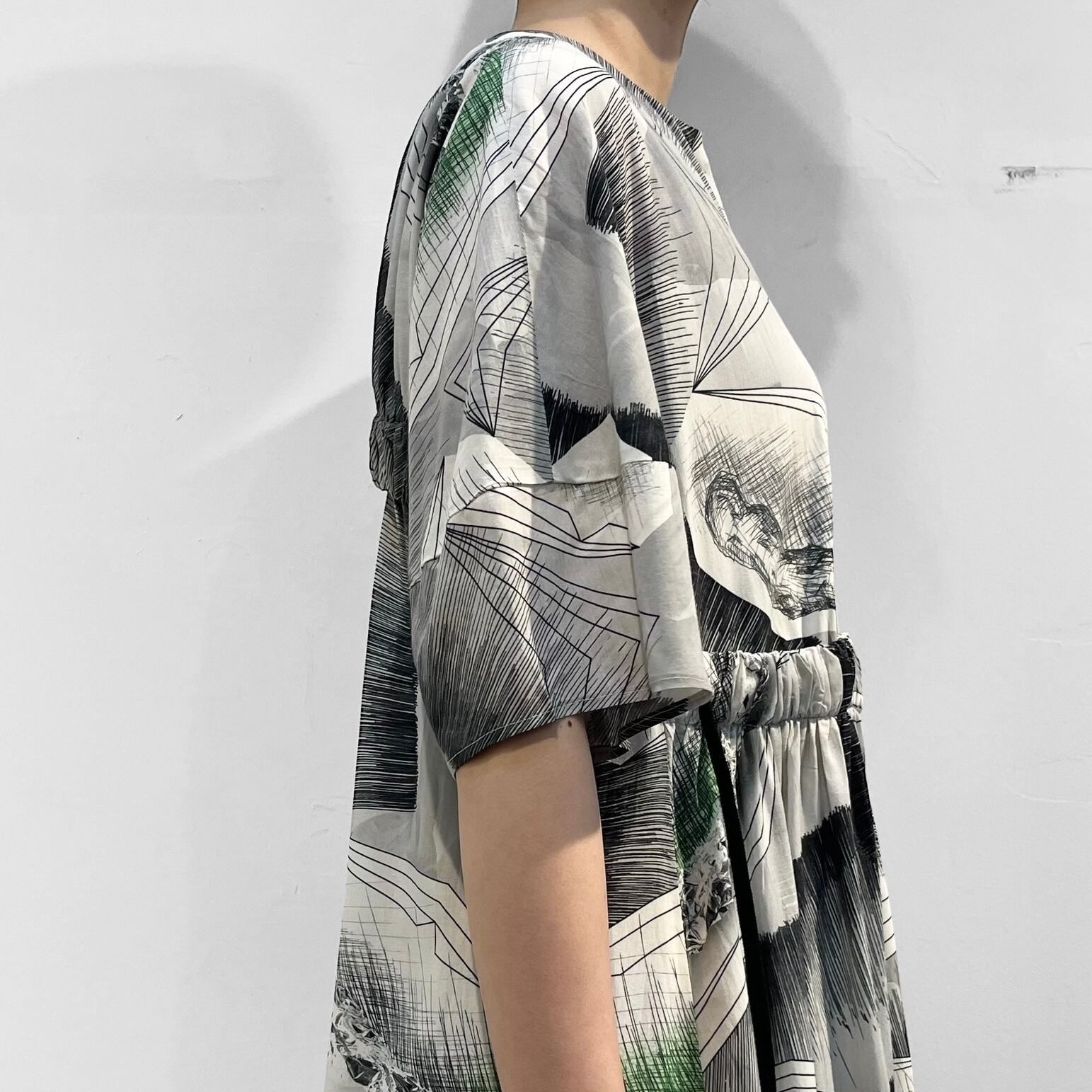 アルミホイルとペンで描かれた「松の木の葉のかたまり」と、ペンで描かれた「松とまつ毛」をモチーフとして生地の柄にしています。
