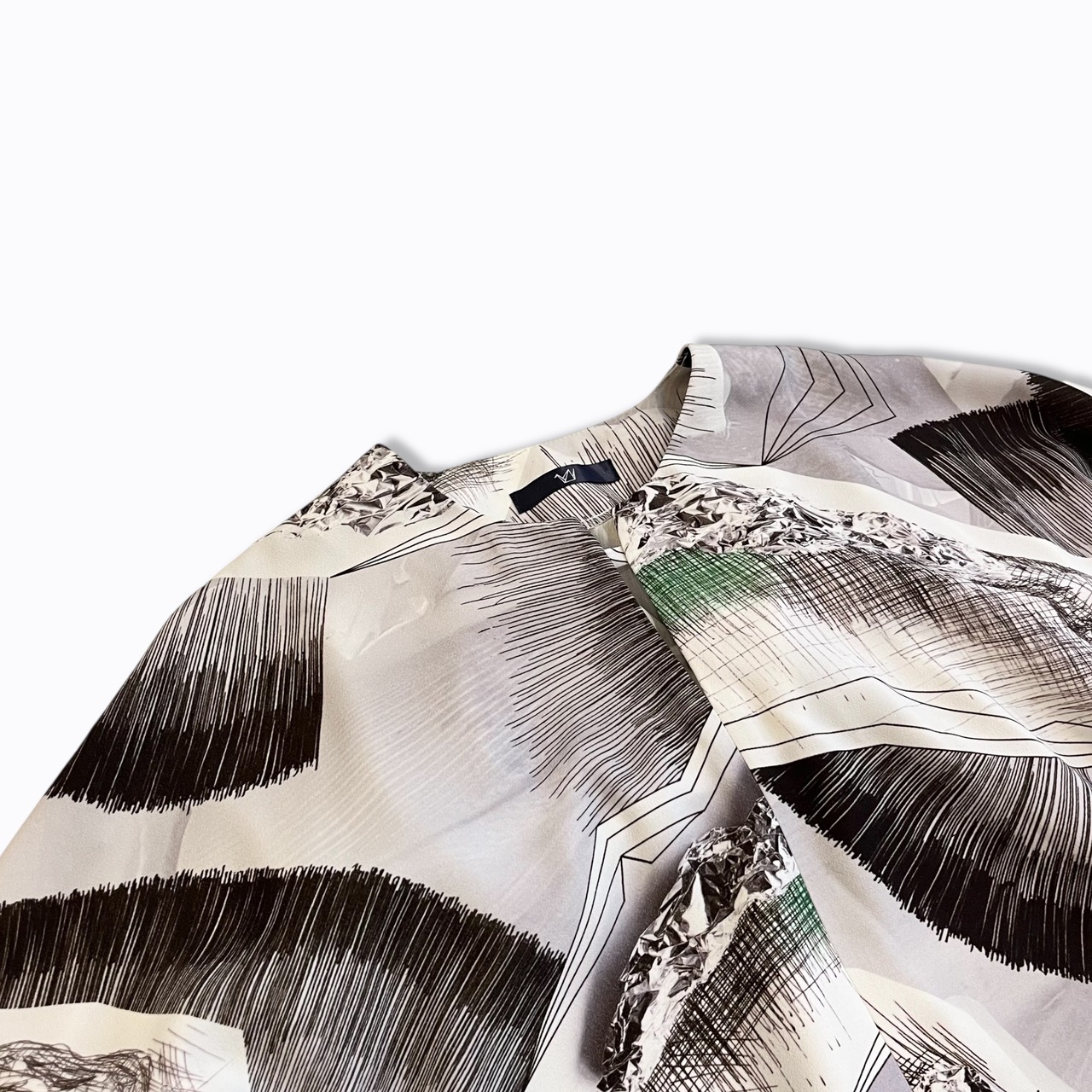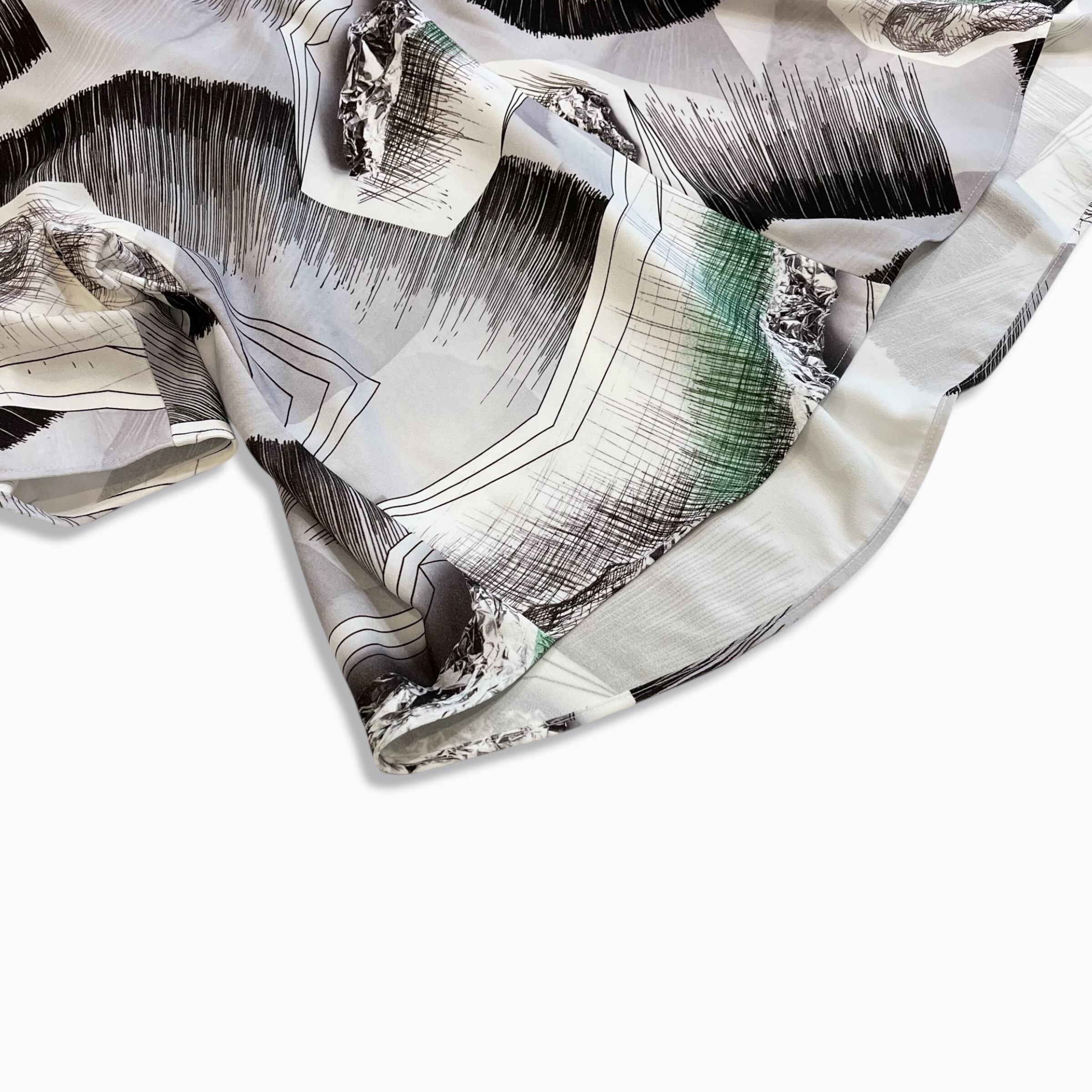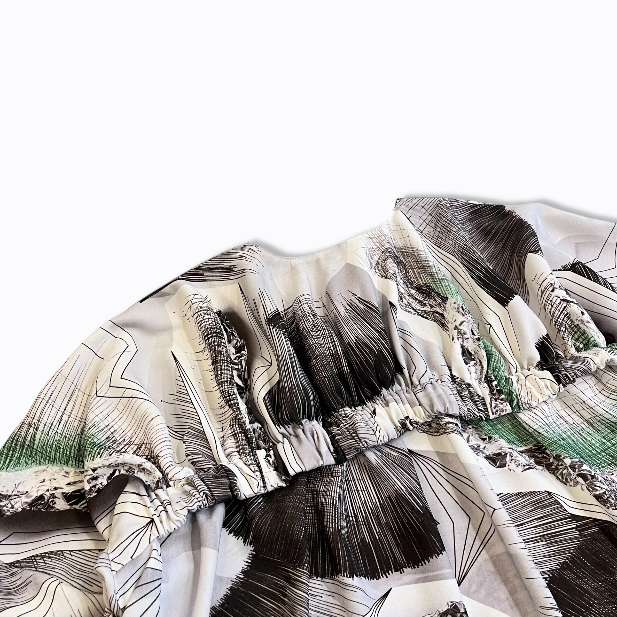 アルミホイルとペンで描かれた「松の木の葉のかたまり」と、ペンで描かれた「松とまつ毛」をモチーフとして生地の柄にしています。