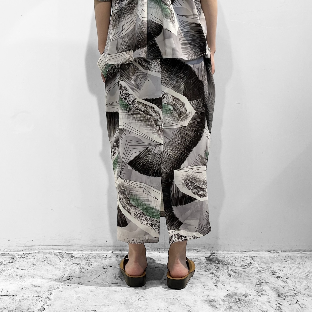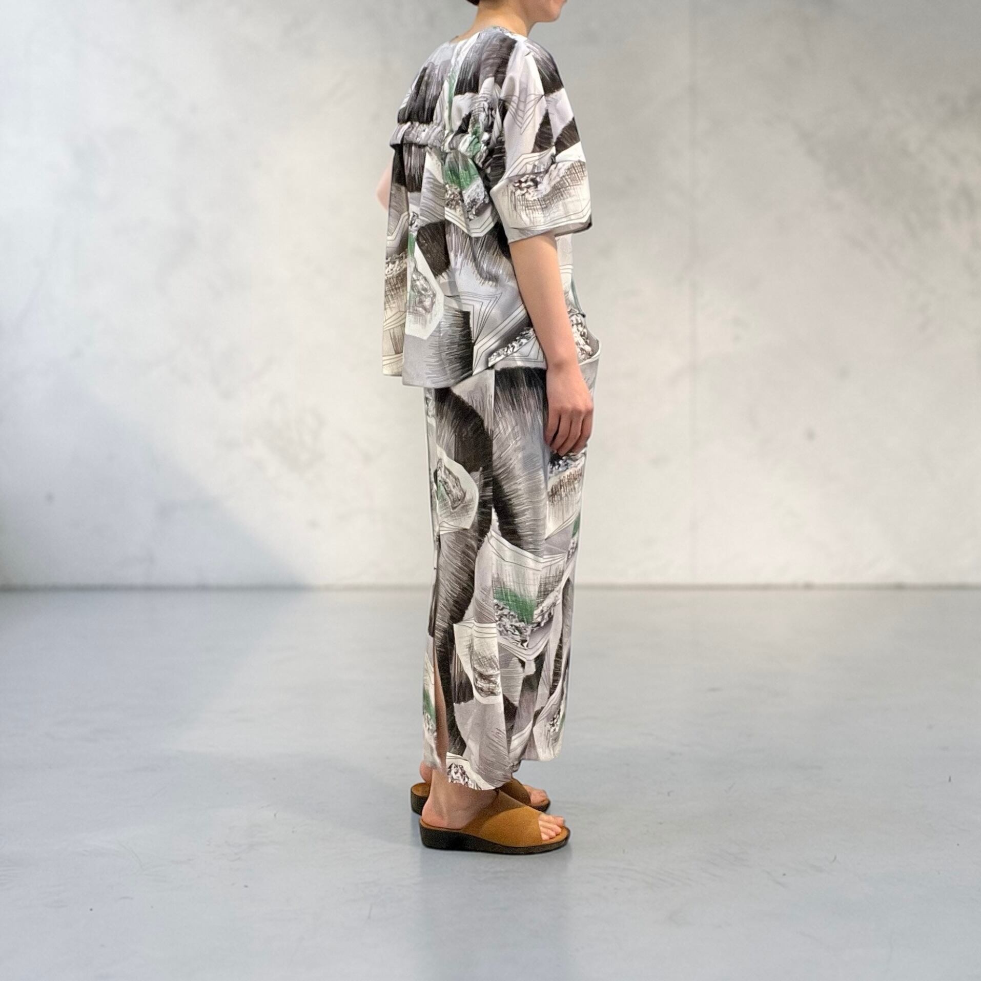 ポケットの様な、脇の立体的な造形と、裾に向かって絞られるテーパードシルエットの対比が印象的なデザインです。