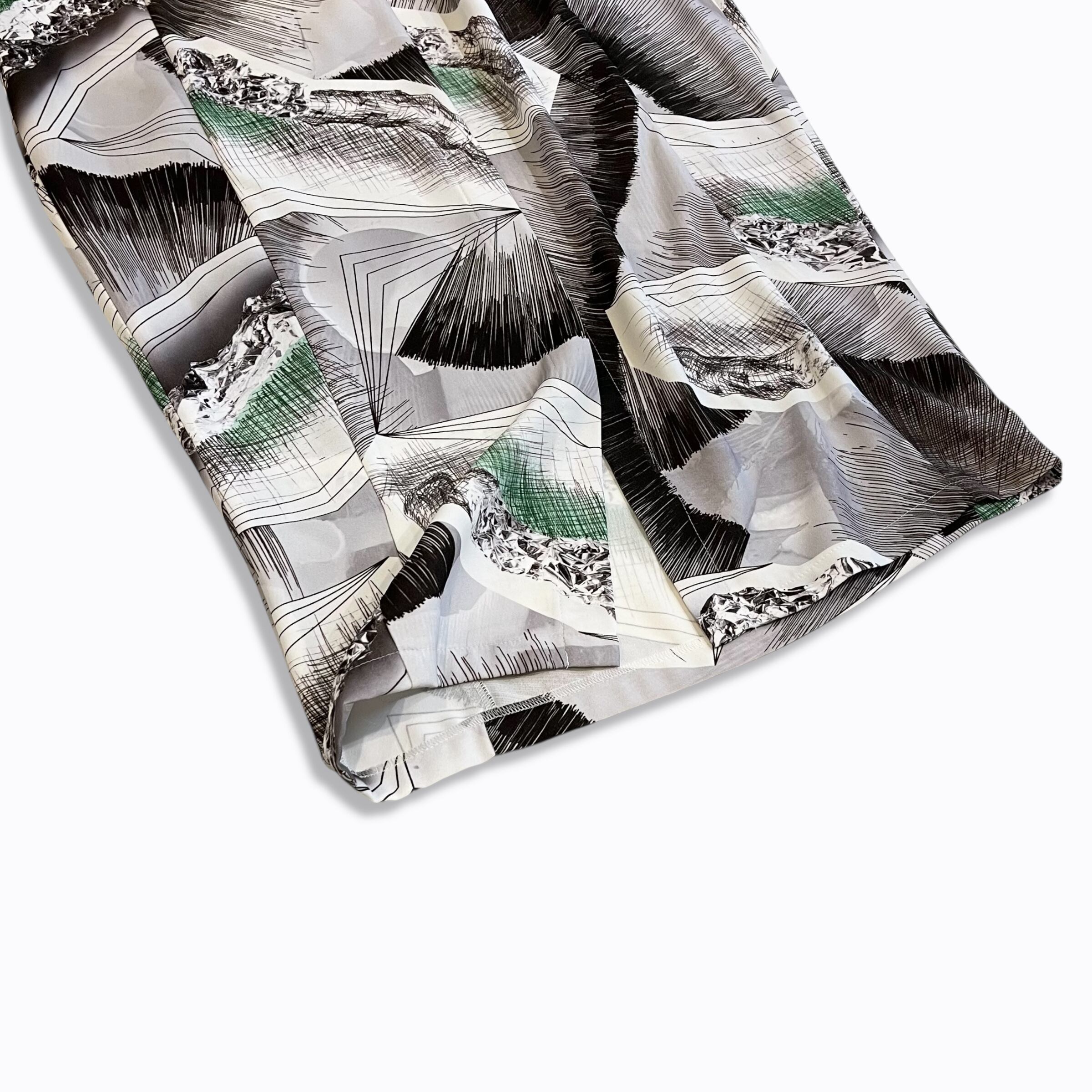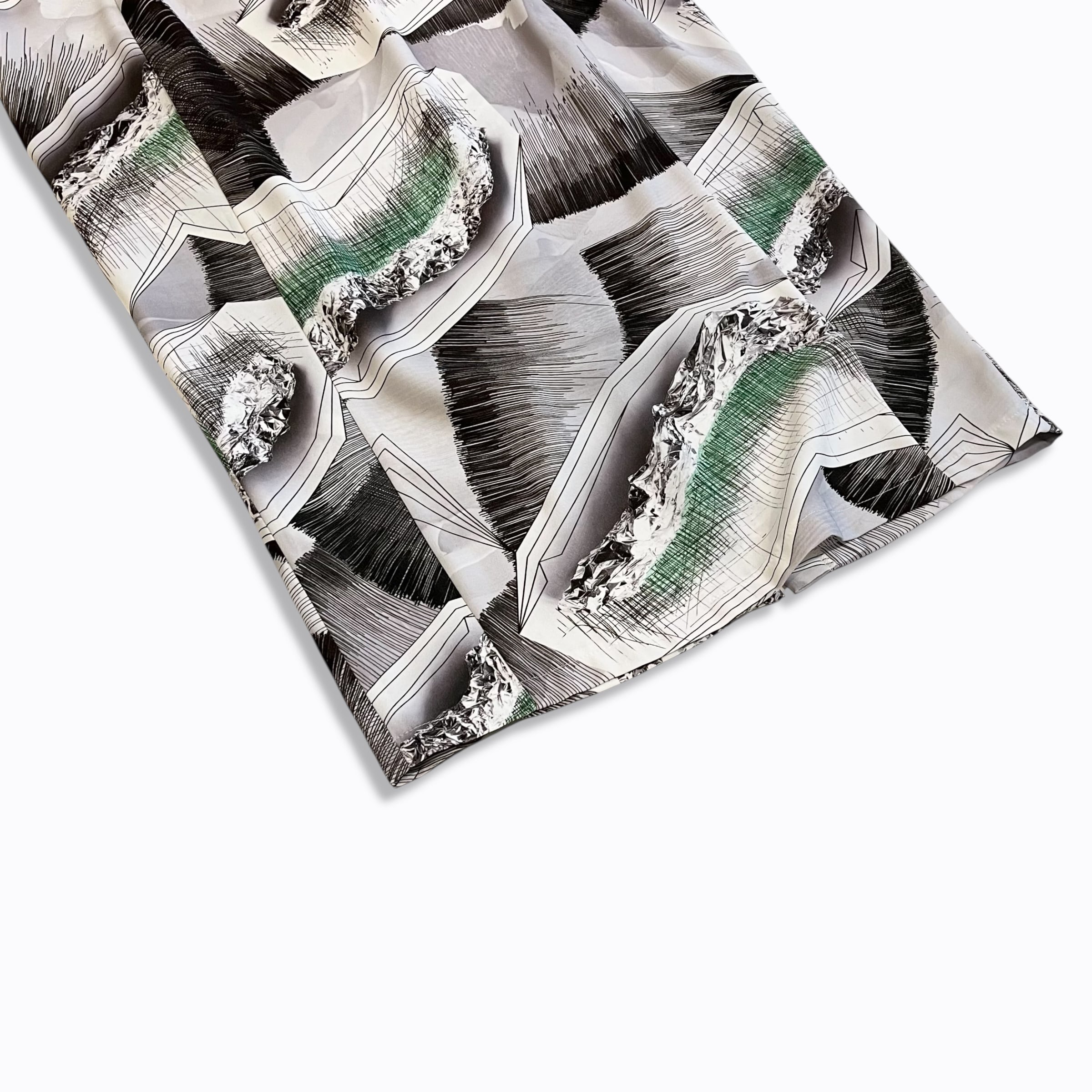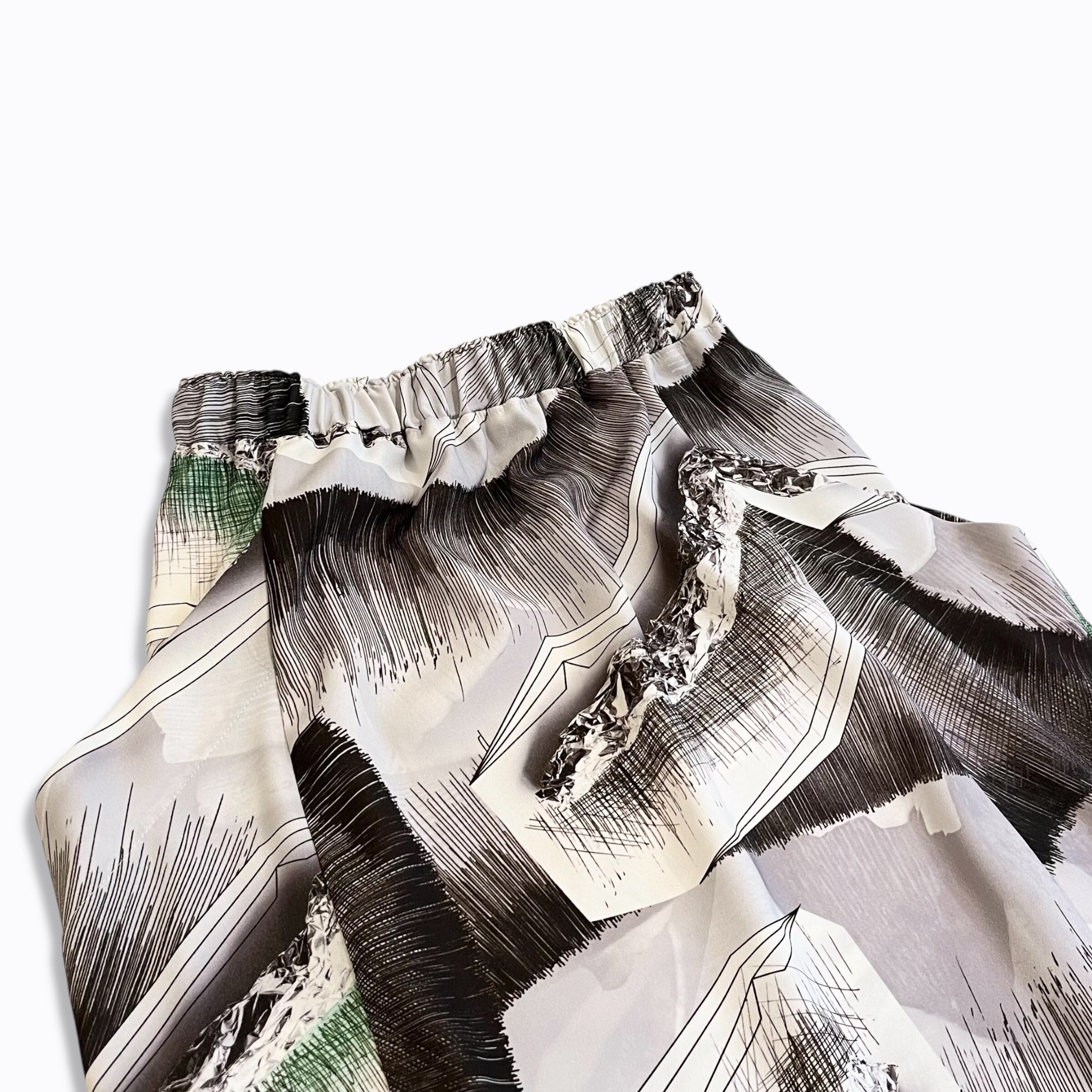 アルミホイルとペンで描かれた「松の木の葉のかたまり」と、ペンで描かれた「松とまつ毛」をモチーフとして生地の柄にしています。
