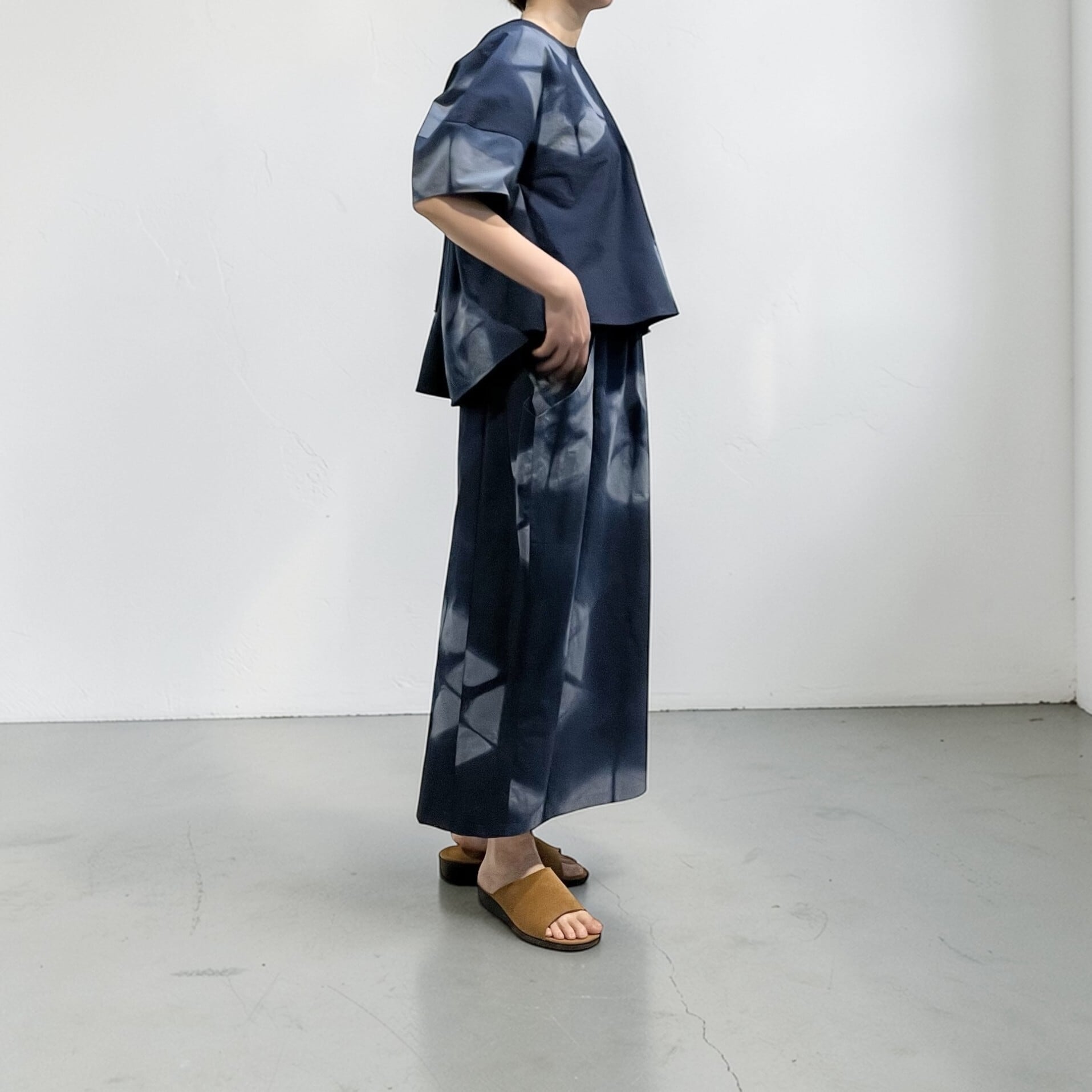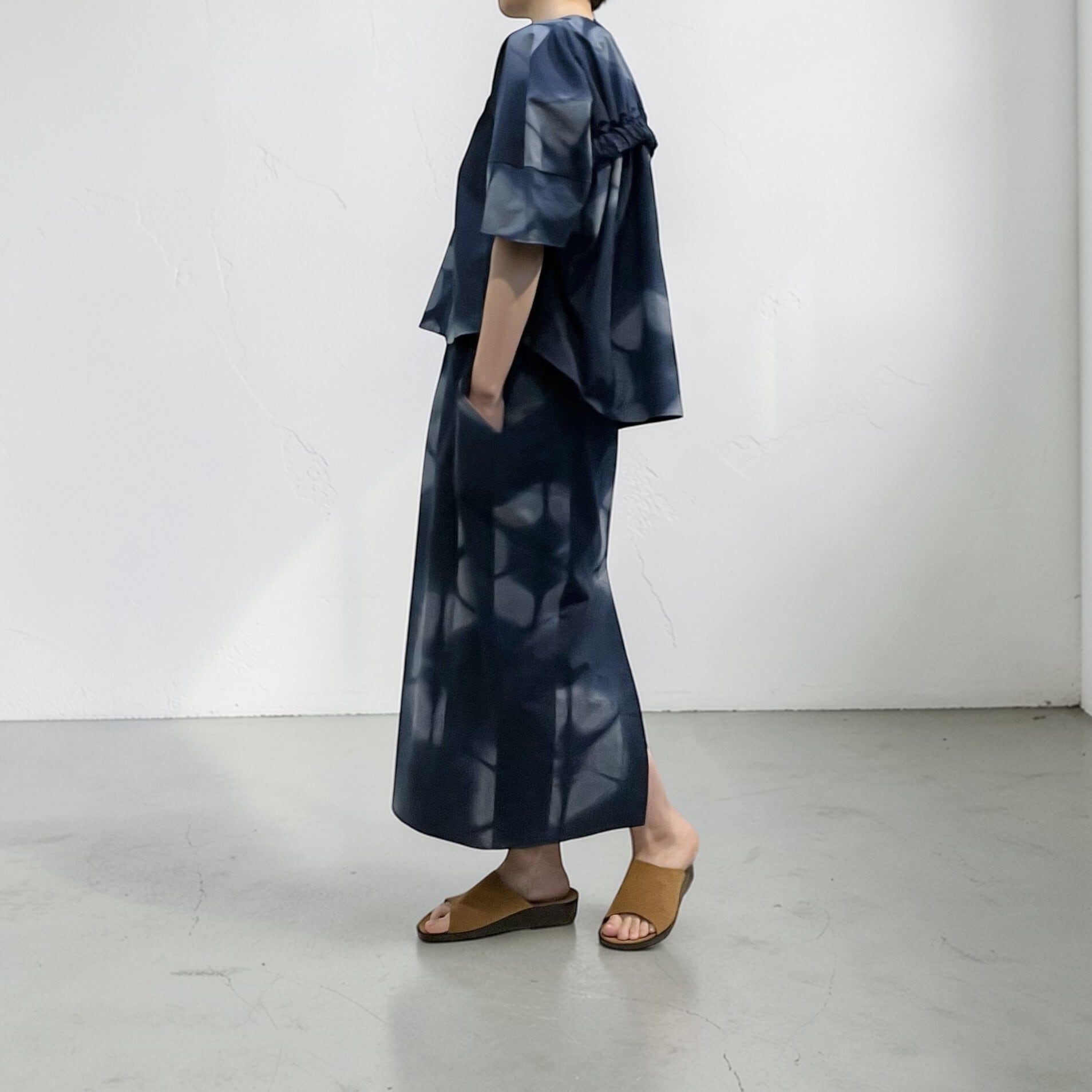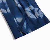 布を一枚ずつ板で挟んで染色することで独特の柄が生まれ、洗い加工による自然なシワ感も素材の魅力を引き立てています。