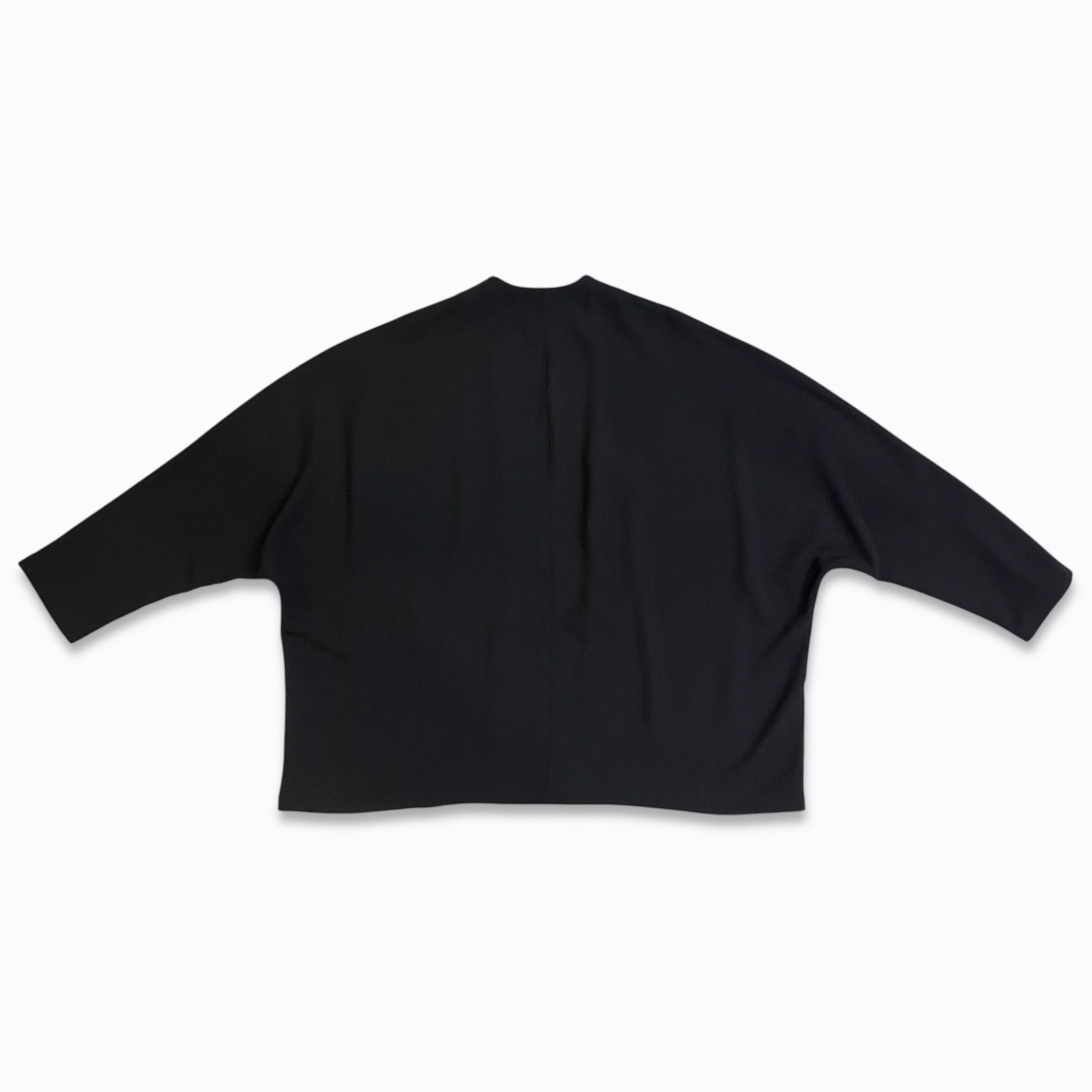 大胆なドルマンスリーブに、前ボタン無し、前見頃にダーツ利用ポケット付き。
