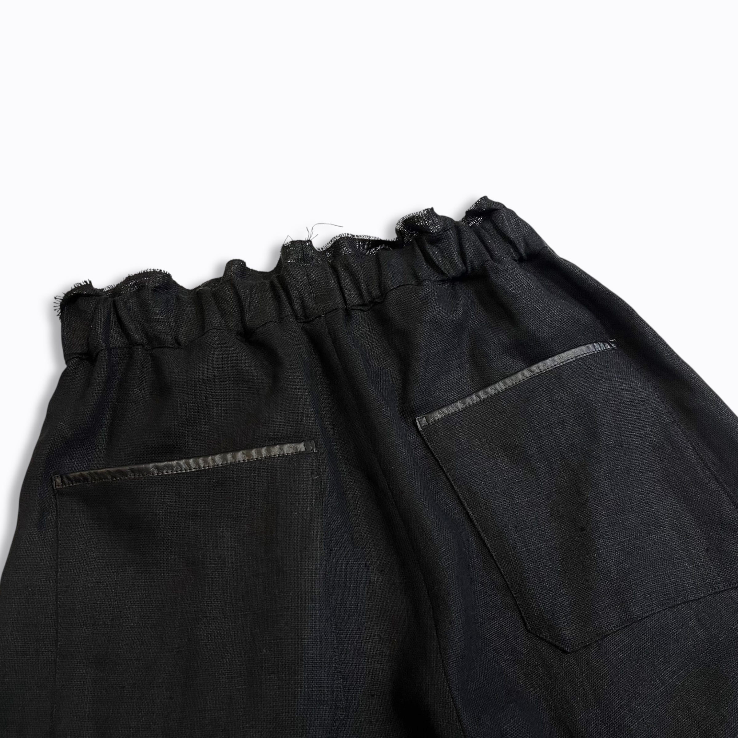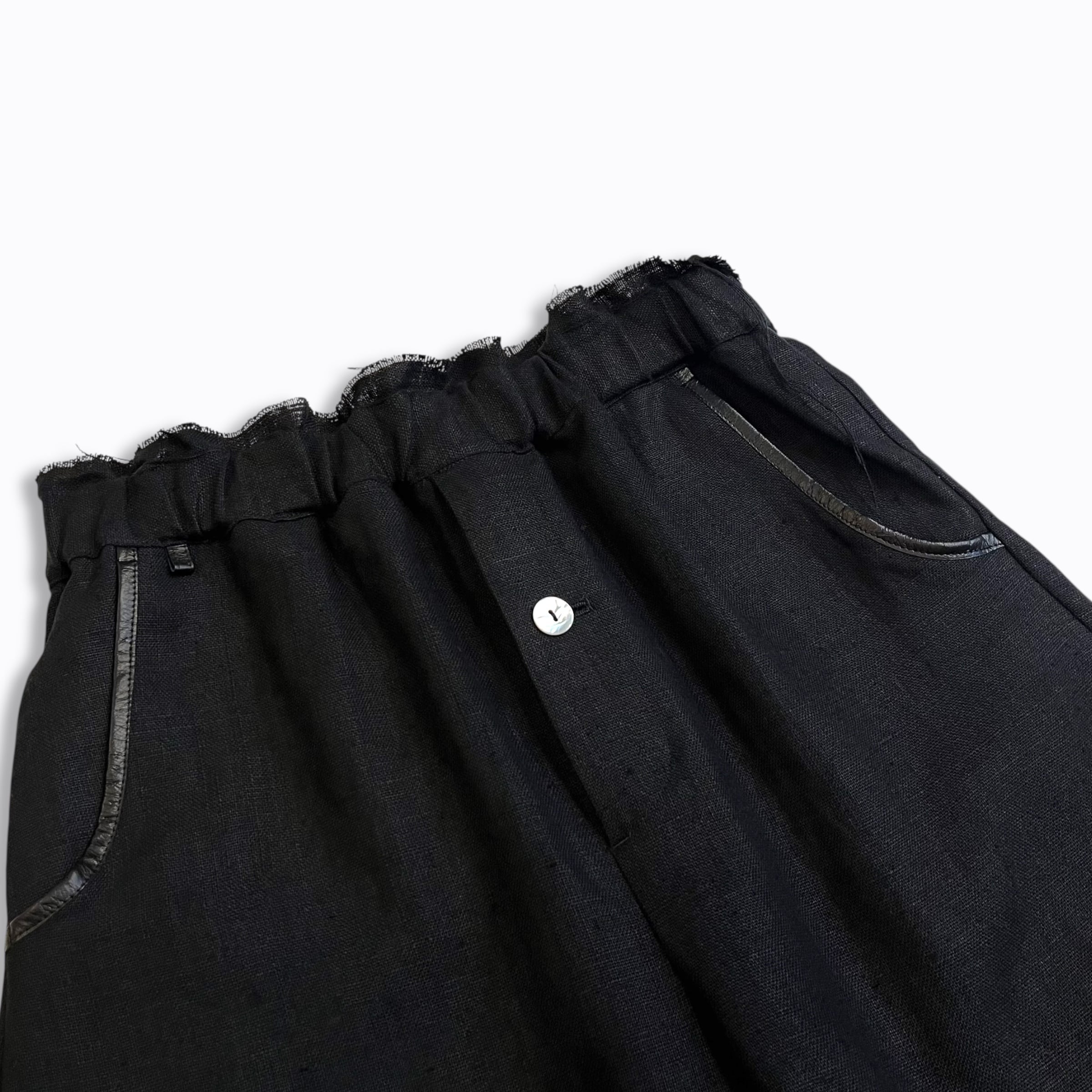 ウエストゴムと紐のイージー仕様、太めのストレートシルエットに、脇のシームを排した設計により、布の落ち感や陰影がなめらかに現れ素材そのものの表情を引き立たせています。