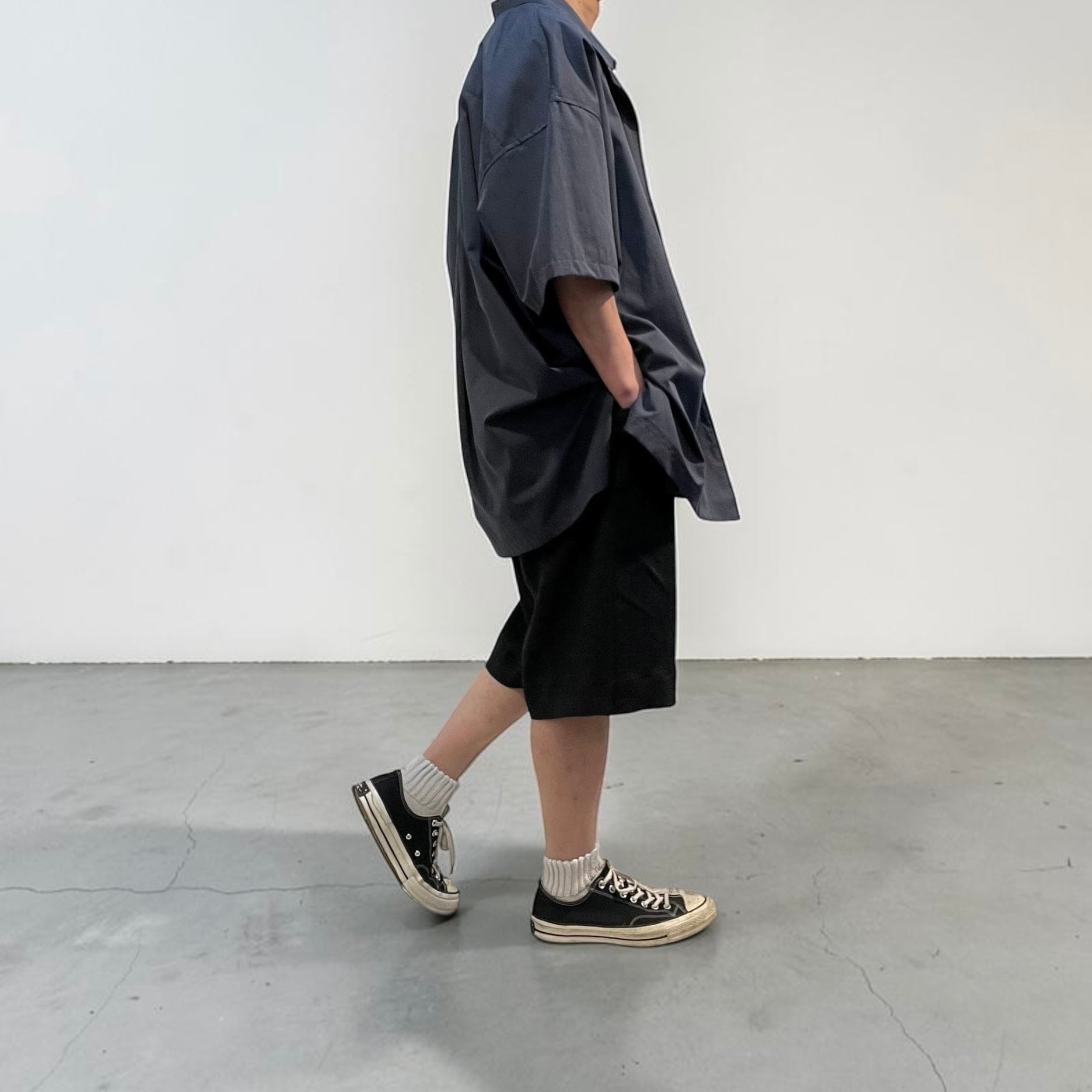 リラックス感のある履き心地と少しの存在感、程々の太さと膝下の丈感でトップスを選ばない合わせやすいショーツになっています。
