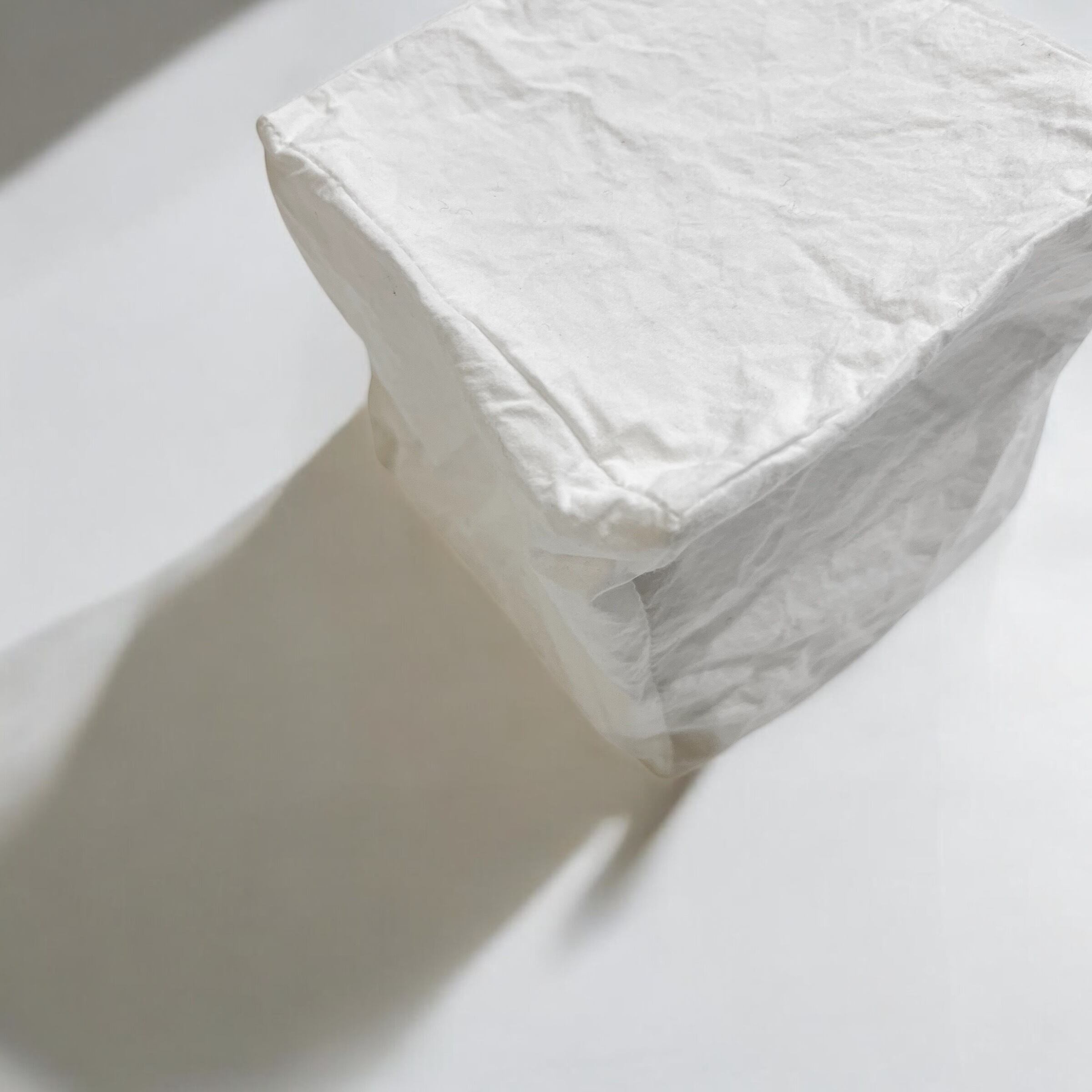 生地の段階と製品後に2度糊付け加工を施し、生地に強いハリコシと皺感を与えた高密タイプライター生地の立方体オブジェ。